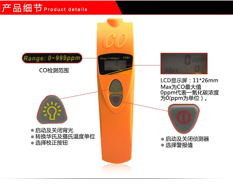 El detector de monóxido de carbono AZ7701, de un solo gas, se utiliza para detectar CO en el aire ambiente. El rango de medición es de 0 a 1000 ppm. Se puede configurar para que emita una alarma sonora y luminosa cuando la concentración de monóxido de carbono supere el valor establecido, y el valor de la alarma se puede ajustar según el valor especificado.