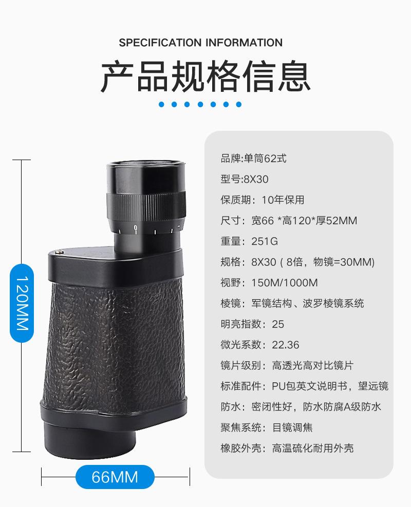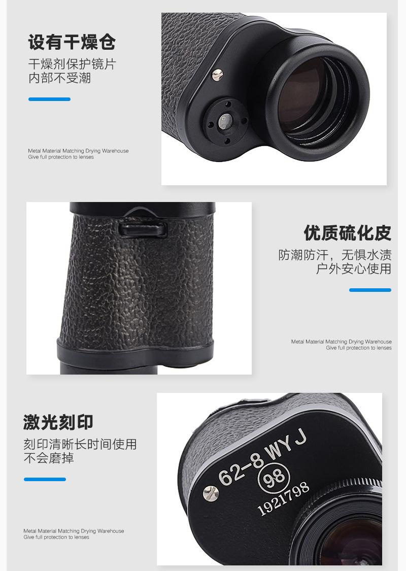 El telescopio Tipo 62 8X30 fue desarrollado y finalizado en mi país en 1962. Tiene alto sellado y alta estabilidad, puede usarse en diversas condiciones ambientales adversas y tiene un tamaño compacto y portátil.