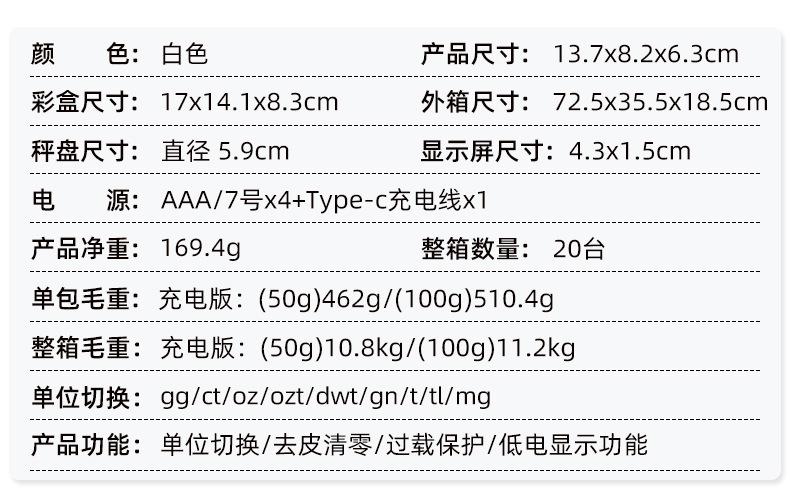 Peso bruto por caja: Versión recargable: (50g)10.8kg/(100g)11.2kg