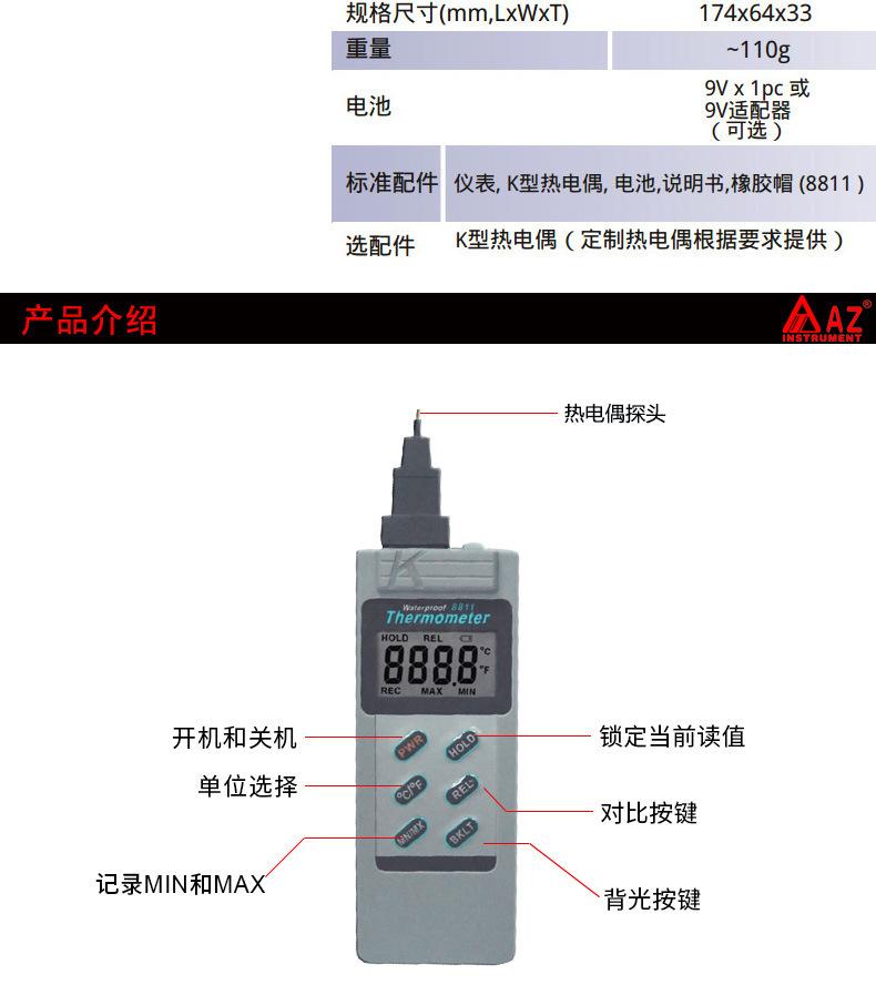 Termómetro termopar portátil tipo K Hengxin AZ8811 resistente al agua