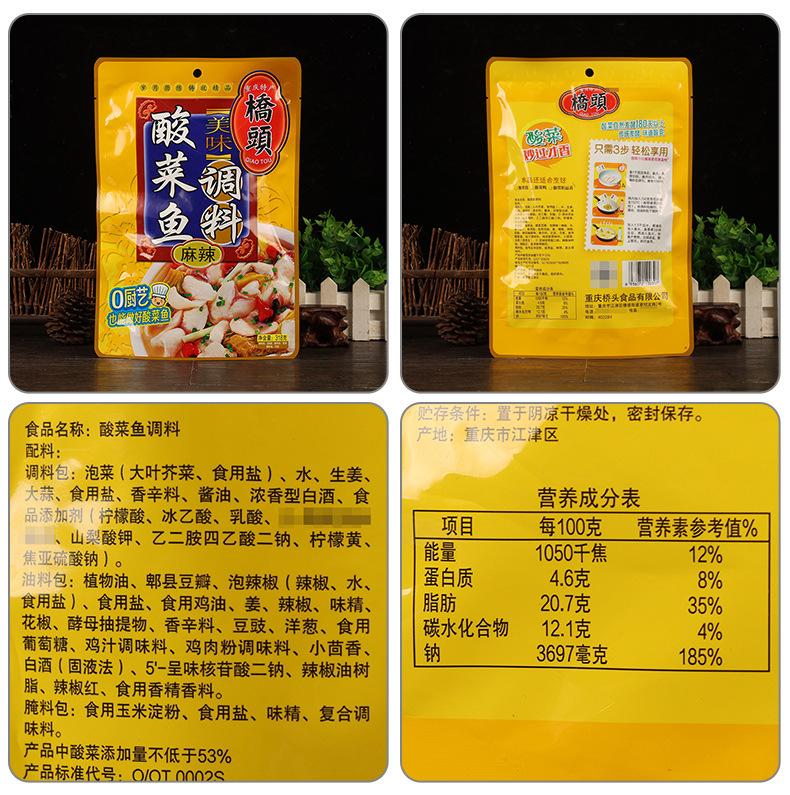 Paquete de condimentos: kimchi (mostaza de hoja grande, sal de mesa), agua, jengibre, ajo, sal de mesa, especias, salsa de soya, licor sabor Luzhou, aditivos alimentarios (ácido cítrico, ácido acético glacial, ácido láctico, sorbato de potasio, EDTA disódico, tartrazina, metabisulfito de sodio).