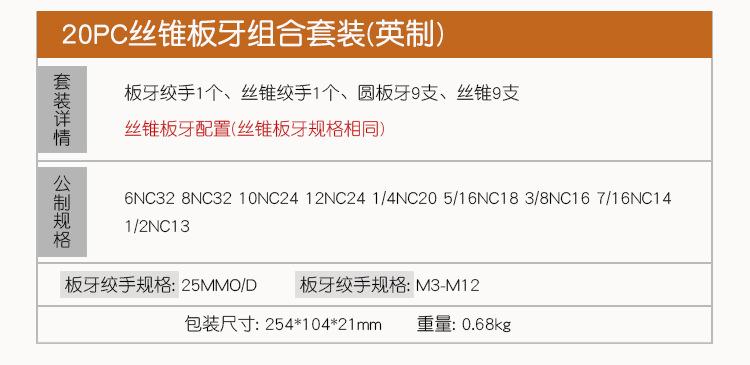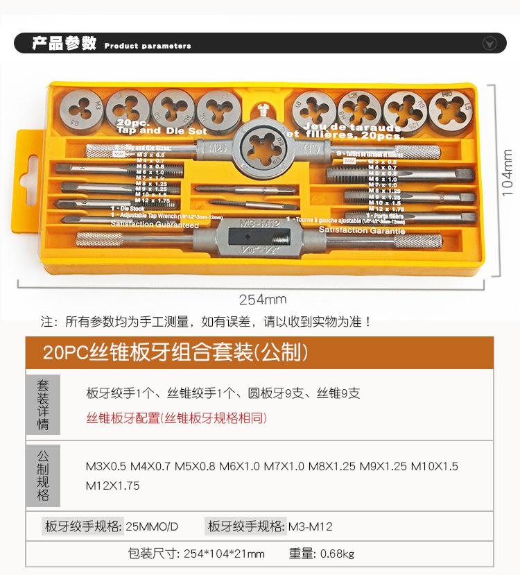 Juego de machos y terrajas métricas y en pulgadas de 20 piezas, llave de mano para machos, terraja de mano, juego combinado de machos métricos de mano