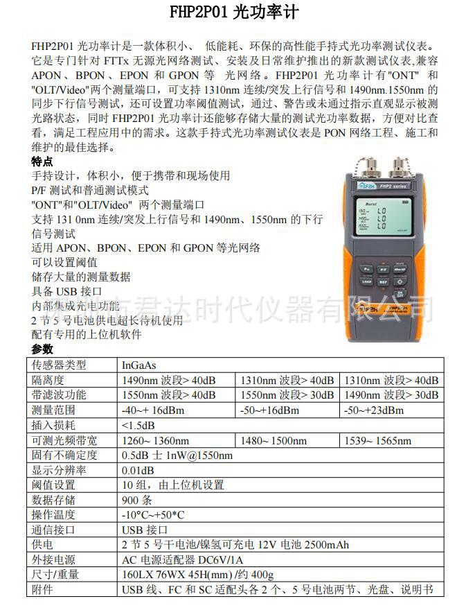 FHP2P01El medidor de potencia óptica es un instrumento de prueba de potencia óptica portátil, pequeño, de bajo consumo energético, respetuoso con el medio ambiente y de alto rendimiento.FTTxNuevos instrumentos de prueba para pruebas, instalación y mantenimiento rutinario de redes ópticas pasivas,compatibleAPON、BPON、EPONyGPONEsperando red óptica.FHP2P01medidor de potencia óptica"ONT" y"OLT/Vídeo"Admite dos puertos de medición1310 nmcontinuo/Señal de enlace ascendente en ráfaga y1490 nm.1550 nmLa prueba de señal de enlace descendente sincrónico también se puede configurar para la prueba de umbral de potencia, y la indicación de aprobación, advertencia o falla puede mostrar de manera intuitiva el estado de la ruta óptica probada.FHP2P01El medidor de potencia óptica también puede almacenar una gran cantidad de datos de potencia óptica de prueba, lo que resulta conveniente para la comparación y visualización para satisfacer las necesidades de las aplicaciones de ingeniería.PONLa mejor opción para ingeniería, construcción y mantenimiento de redes.