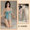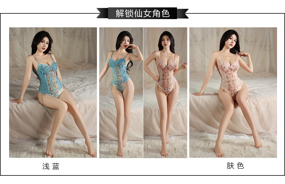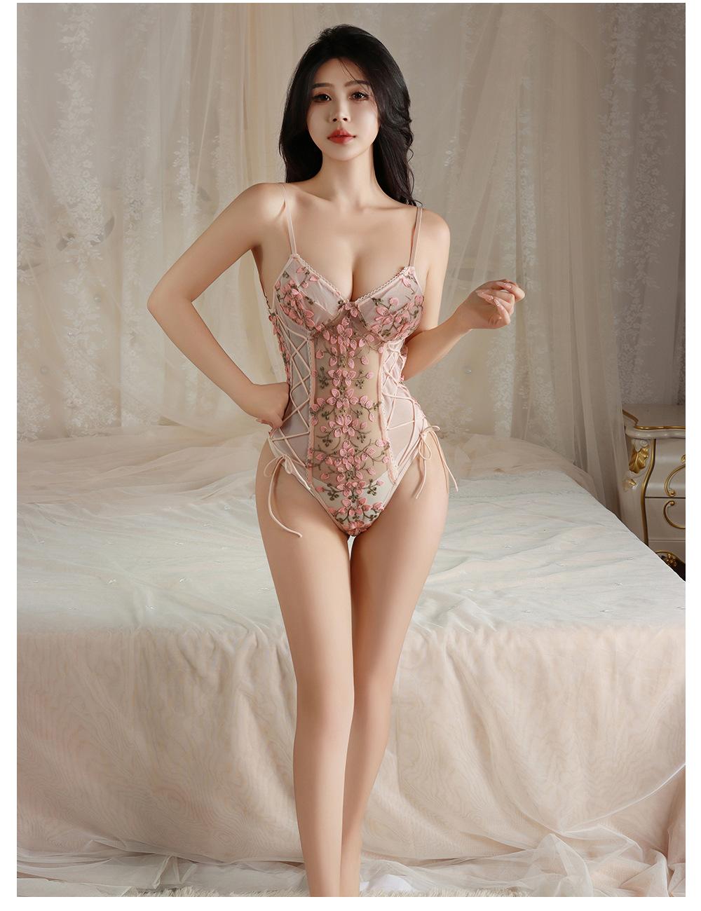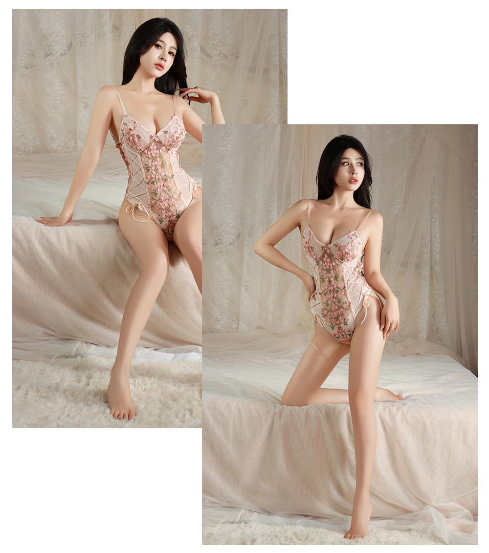 Ropa interior sexy de noche dorada, pijama hueco con encaje bordado, túnica de una pieza con tirantes sexys, traje de malla transparente con cintura tentadora
