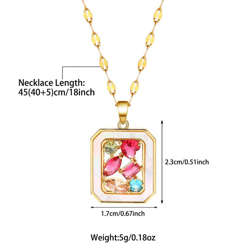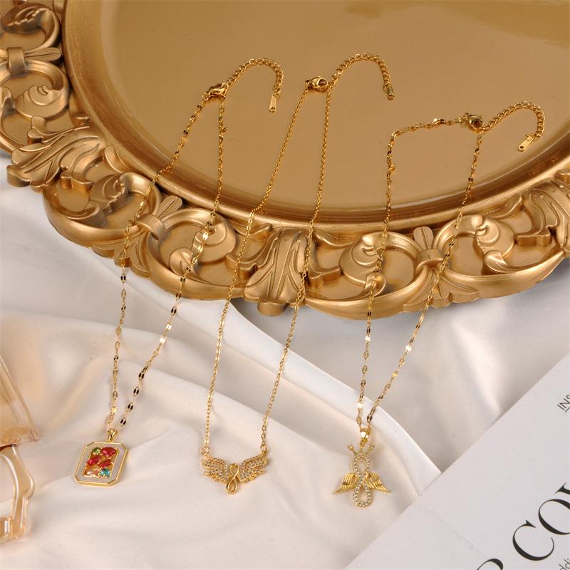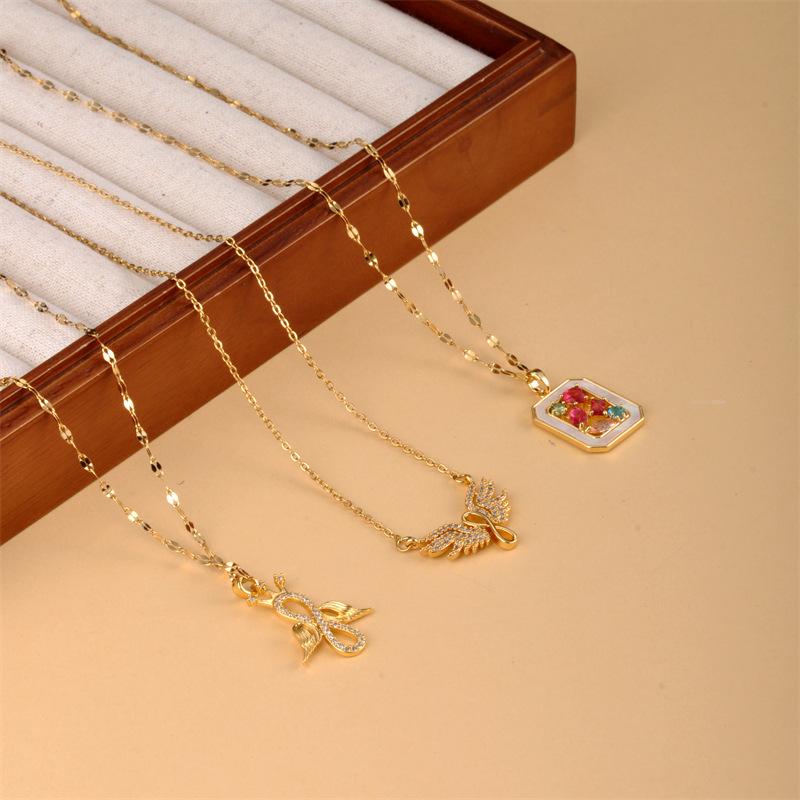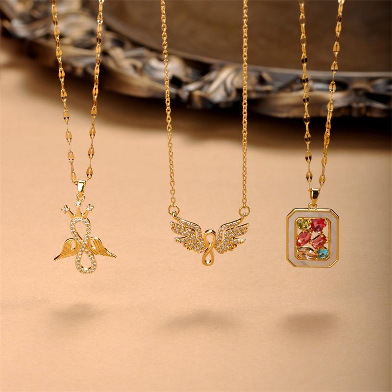 Collar con colgante cuadrado de circonio colorido con alas de ángel transfronterizas, cadena de clavícula de acero y titanio de estilo bohemio para mujer.