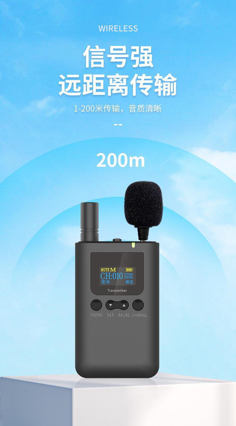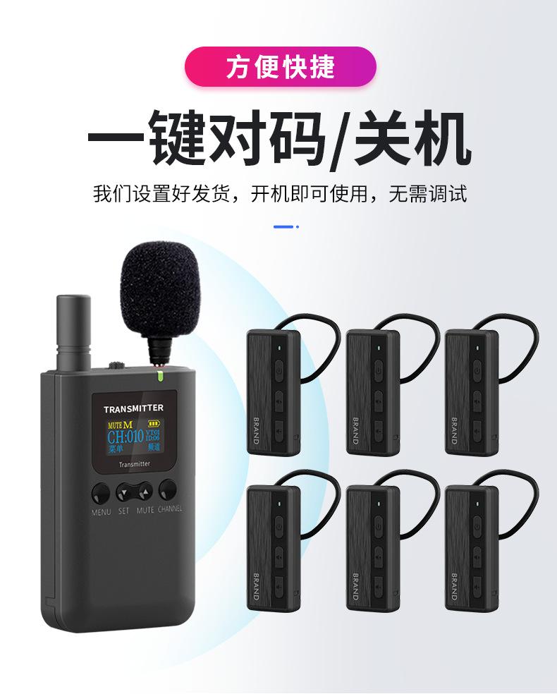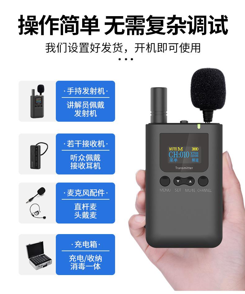 1 transmitter +100 earphone receiver +1 Charging Stand +1 storage bag
