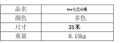 Cuerda de paracaídas de siete o nueve núcleos de alta calidad, fabricada según las normas, enrollada con equipo importado, de excelente calidad y 4 mm de diámetro. El cuerpo de la cuerda está tejido de forma redonda y firme, con una textura superficial muy fina, una excelente resistencia al desgaste y no se deshilacha con la fricción frecuente. Es un artículo imprescindible para quienes practican al aire libre.