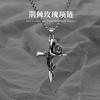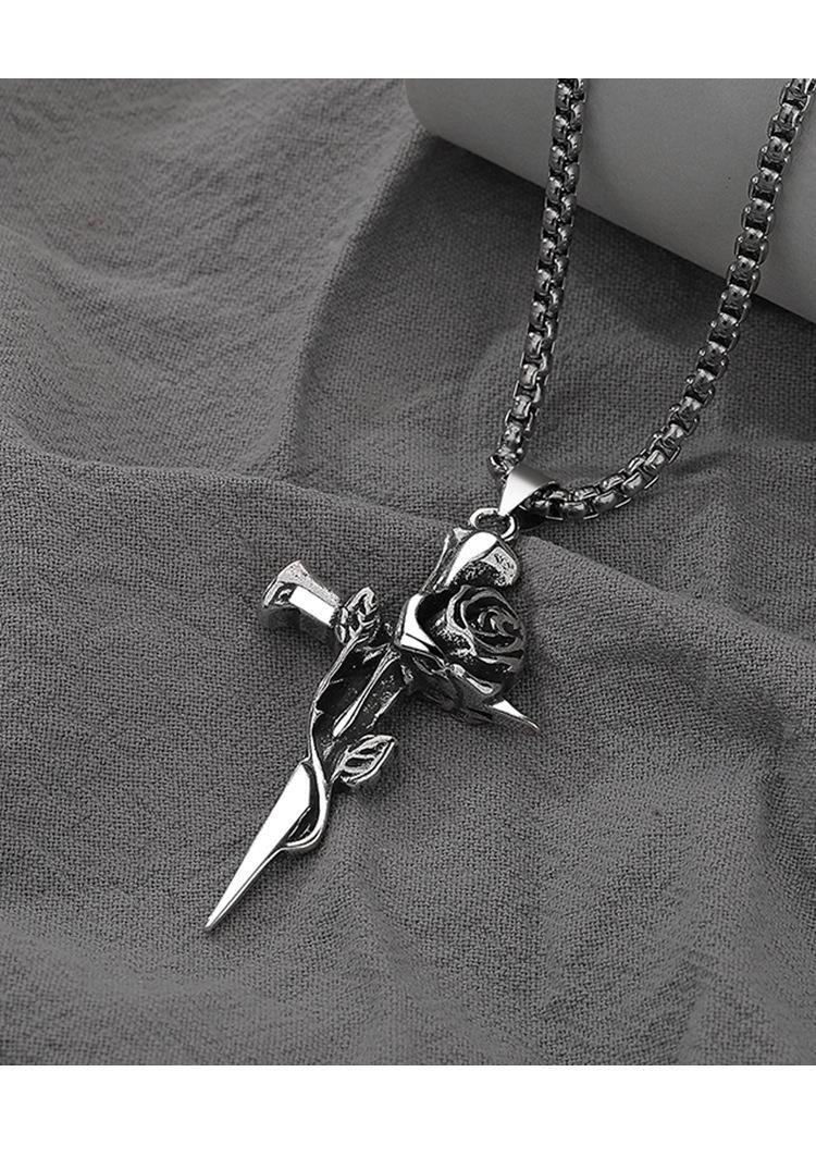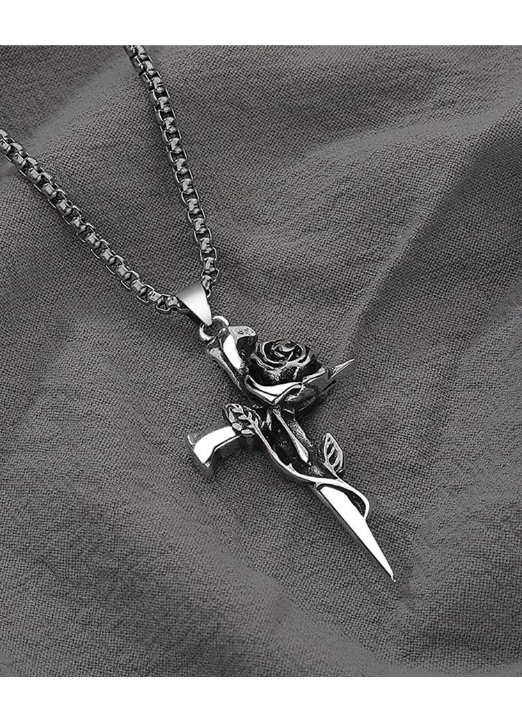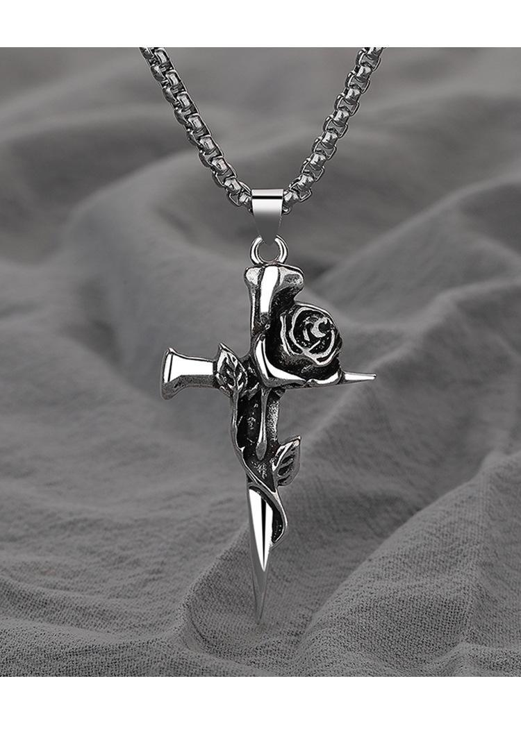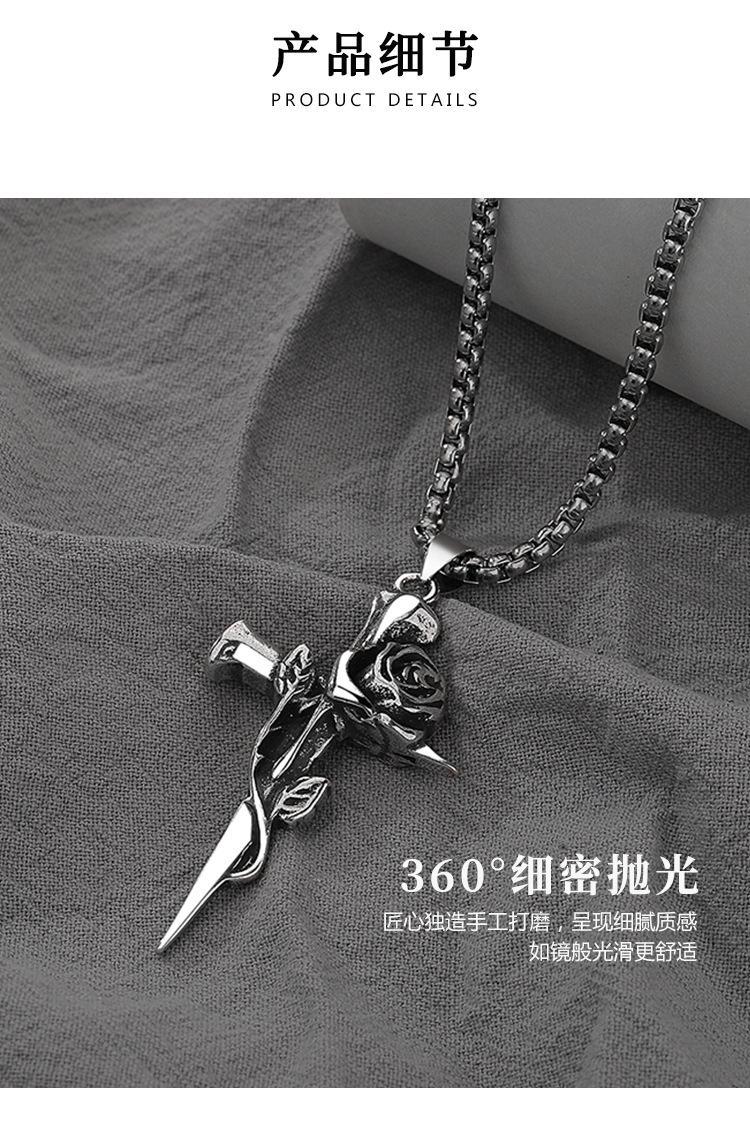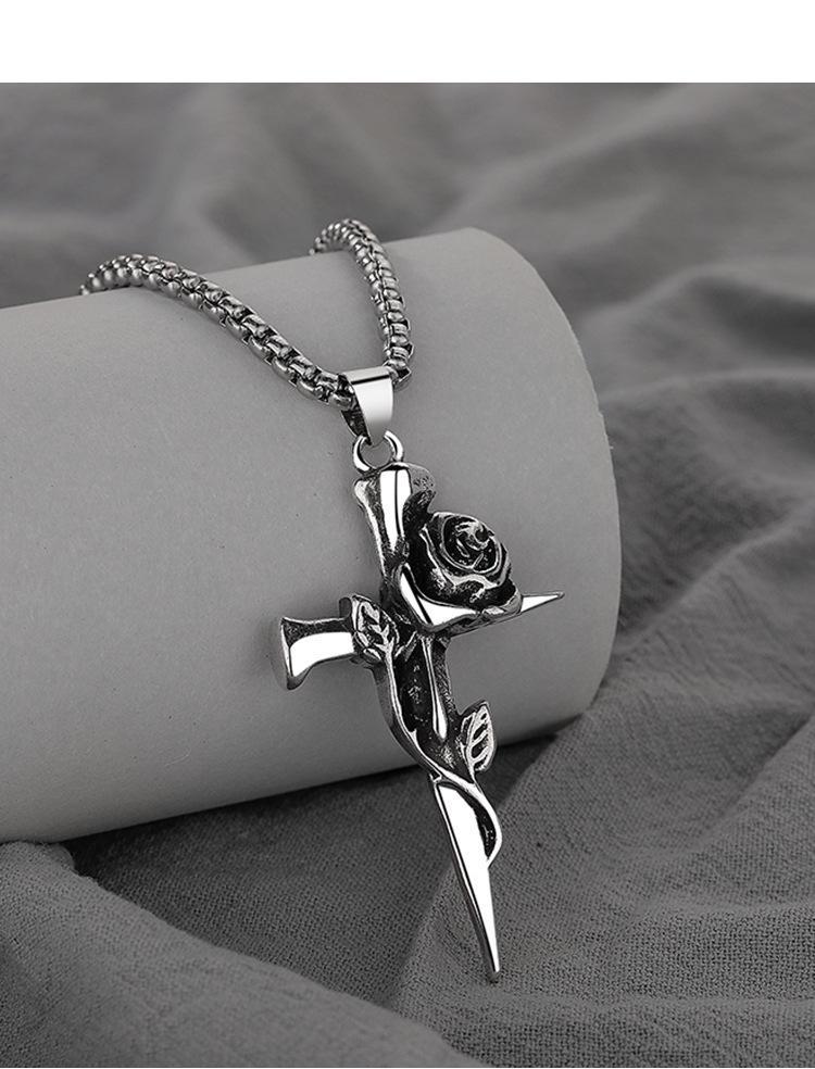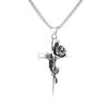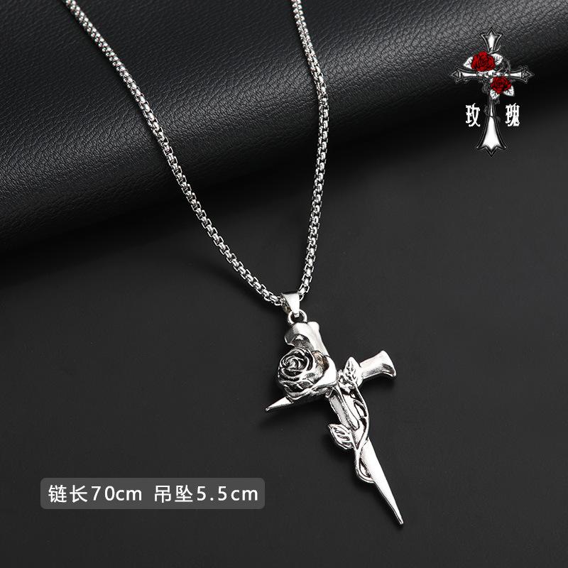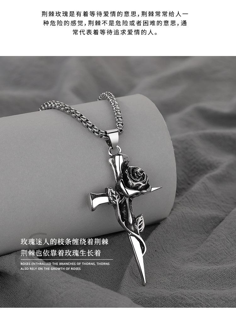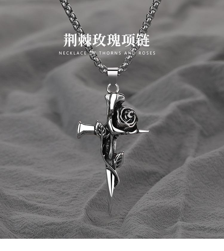 Collar de rosa de espinas retro europeo y americano para hombre, marca de moda, colgante de cruz de flores de doble cara, estilo frío, cadena larga de lana