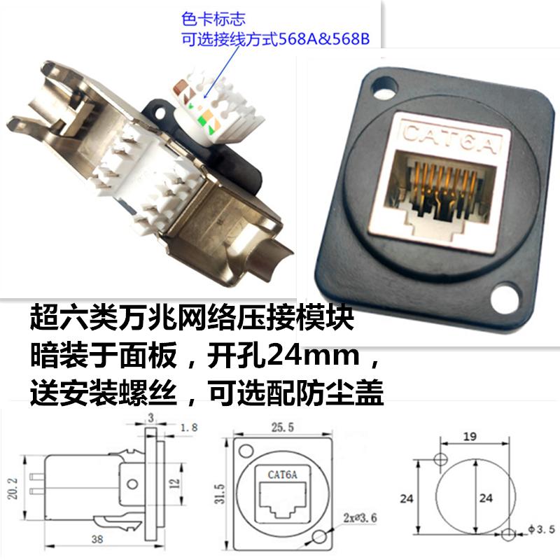 Módulo de crimpado Categoría 6 10G DZ-DL-C6A-K, ExcusadoApertura 24mm:Inserte el cable de red con un conector RJ45 en el puerto de red frontal. Hay códigos de color en el zócalo trasero. Insértelo según el color del cable de red y presione la hebilla de plástico para conectar los cables.