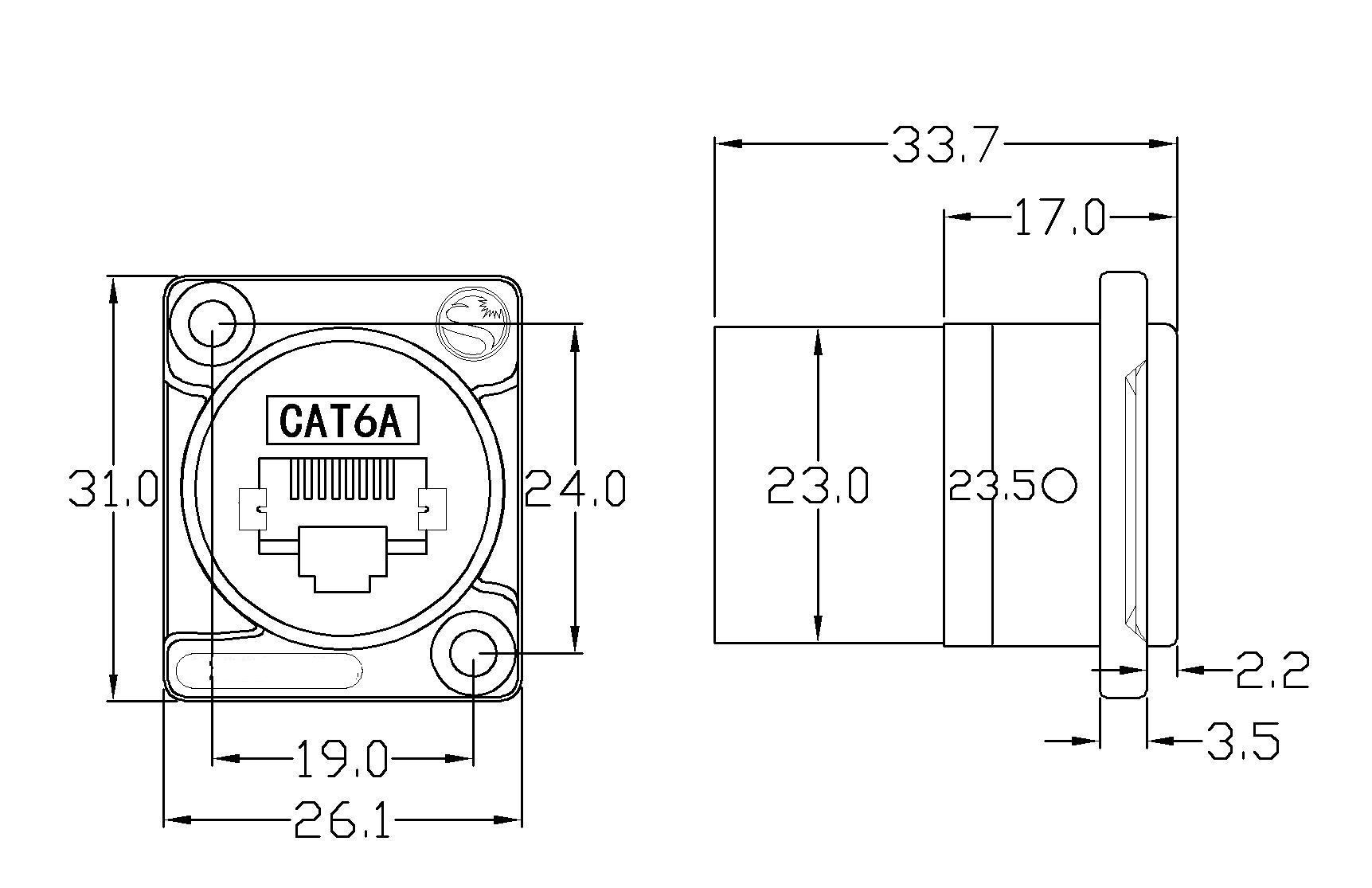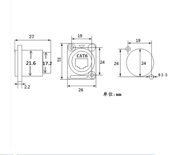 Dibujo dimensional DZ-RJ45-CAT6, orificio abierto 22mm, orificio oculto 24mm