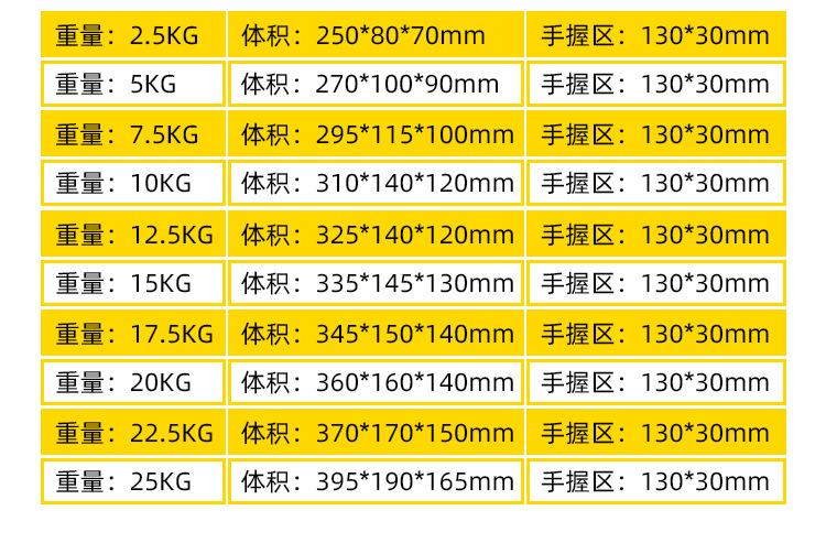 1.Especificaciones completas en kilogramos2 kg, 2,5 kg, 3 kg, 4 kg, 5 kg, 6 kg, 7 kg, 7,5 kg, 8 kg, 9 kg, 10 kg, 12,5 kg, 15 kg, 17,5 kg, 20 kg, 22,5 kg, 25 kg, 27,5 kg, 30 kg, 32,5 kg, 35 kg, 37,5 kg, 40 kg, 42,5 kg, 45 kg, 47,5 kg, 50 kg