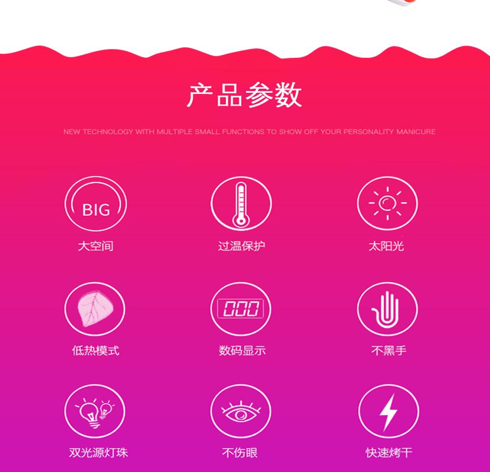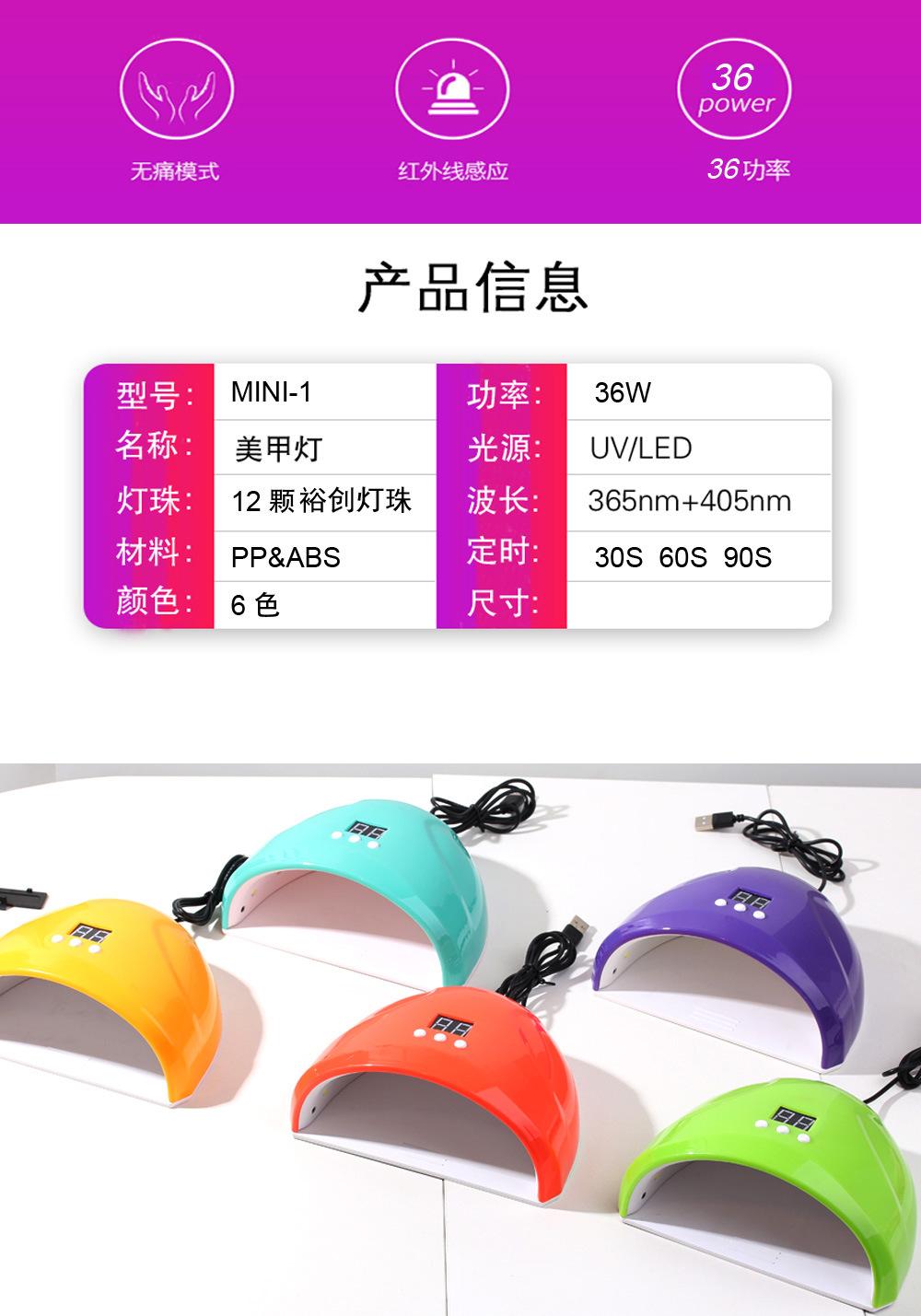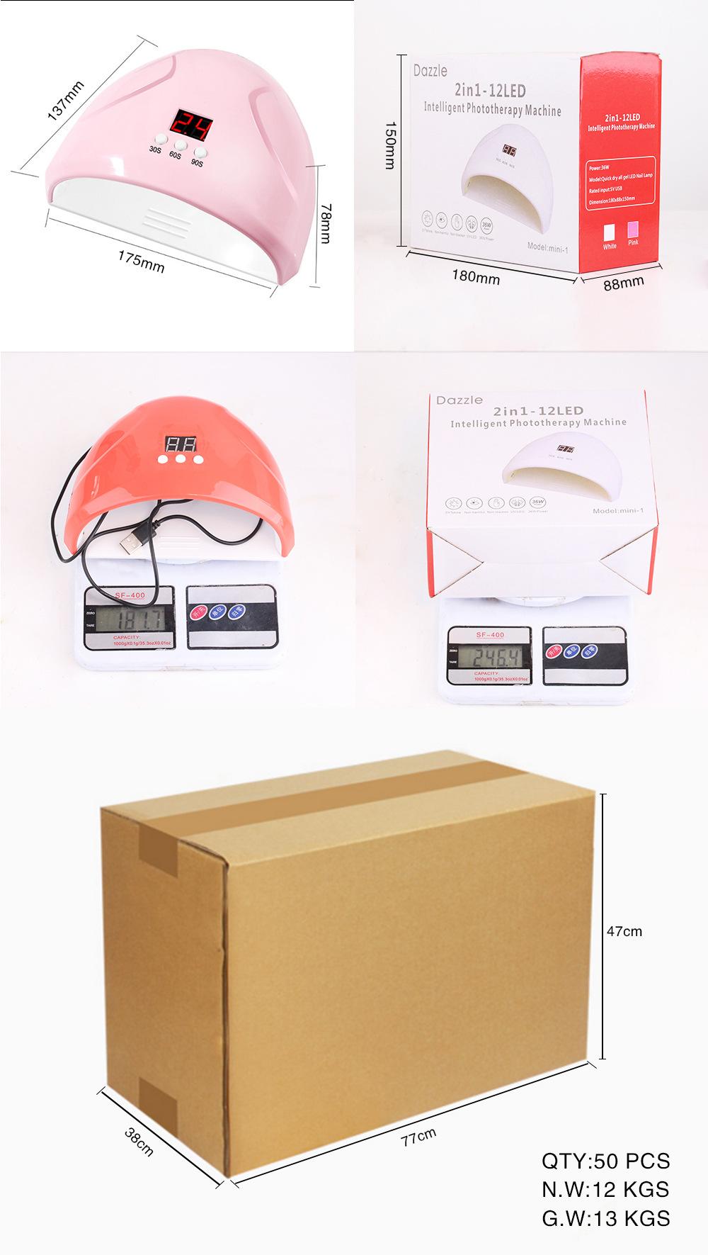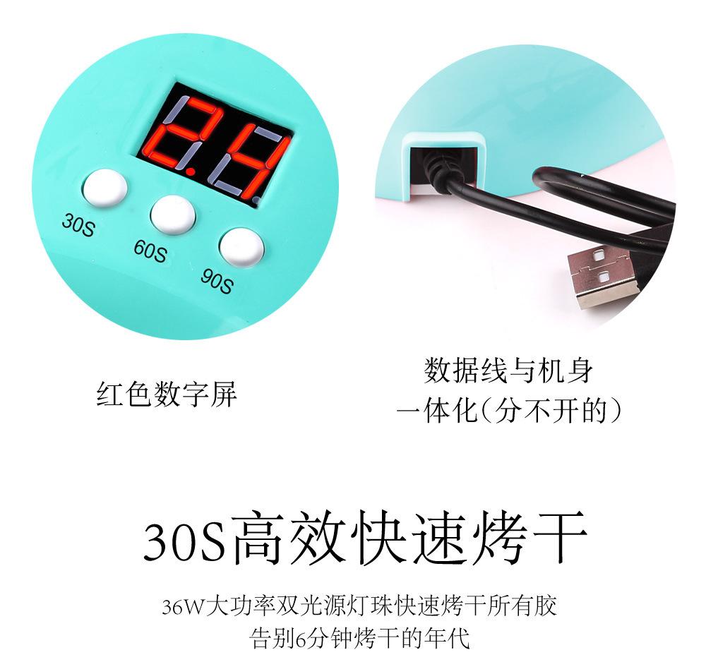 La configuración estándar es un enchufe USB. 36W de alta potencia, 12 perlas de fuente de luz LED, seca todos los esmaltes en gel, la fuente de luz no daña los ojos, no oscurece las manos, no pica, tiene 3 funciones de temporización.