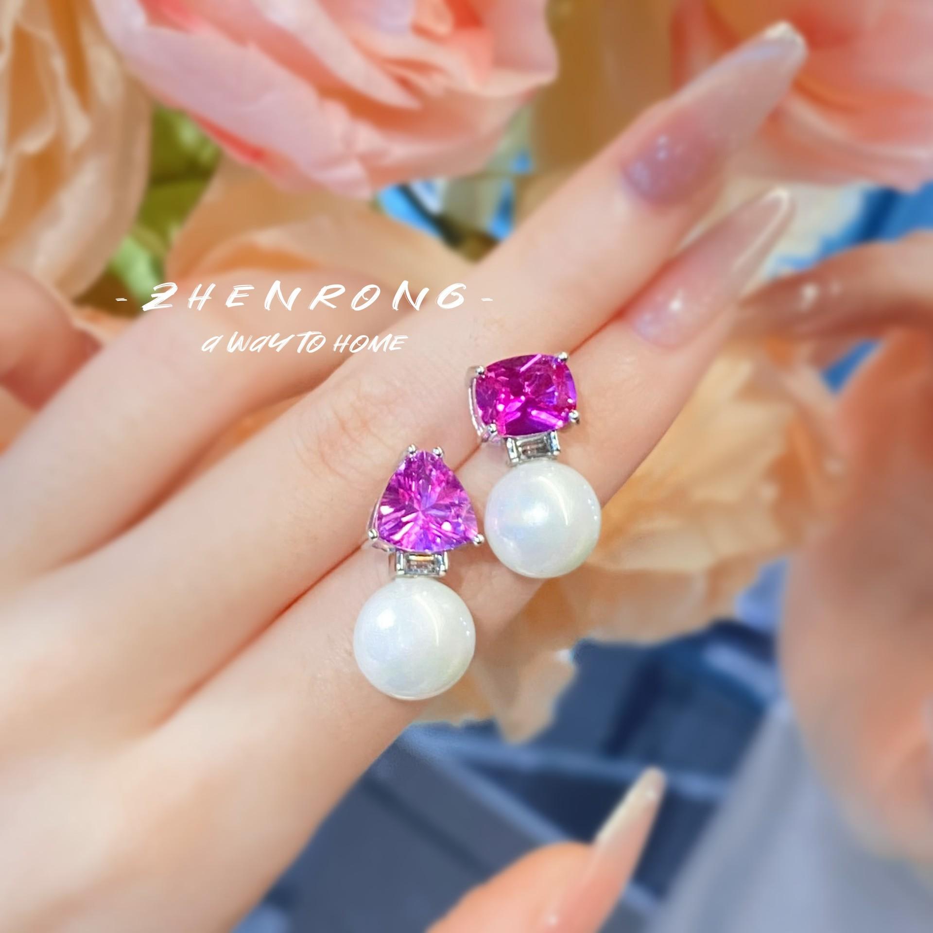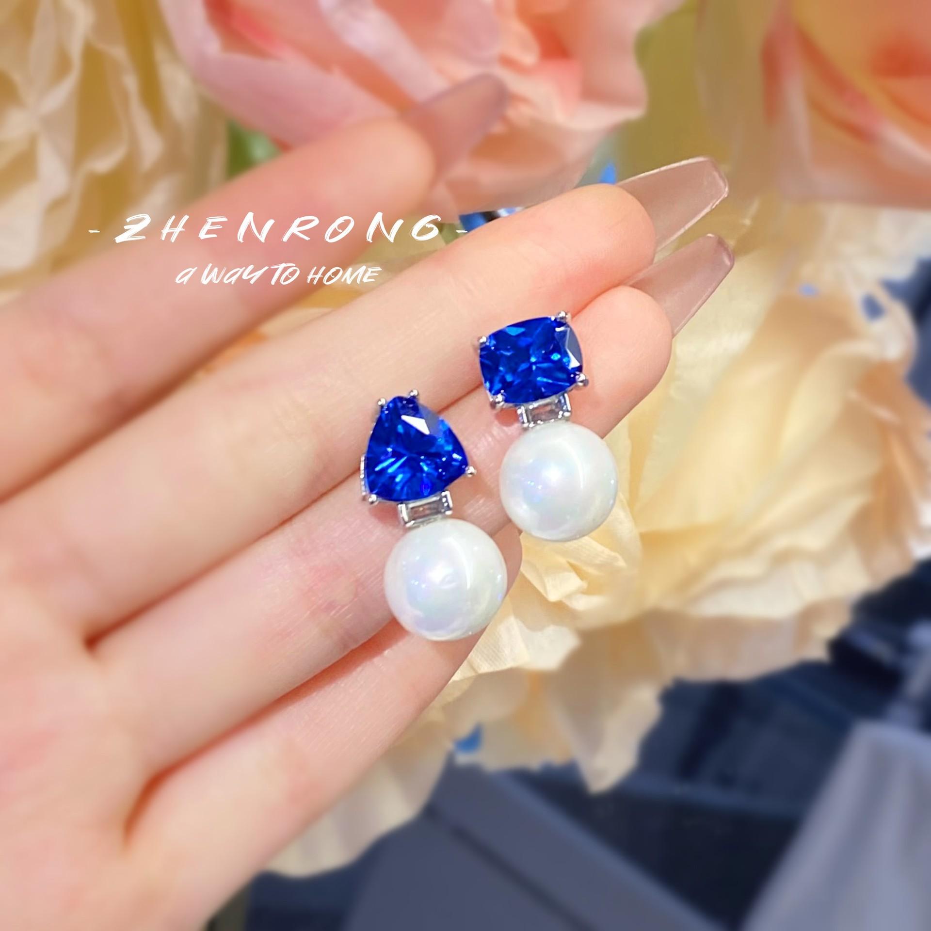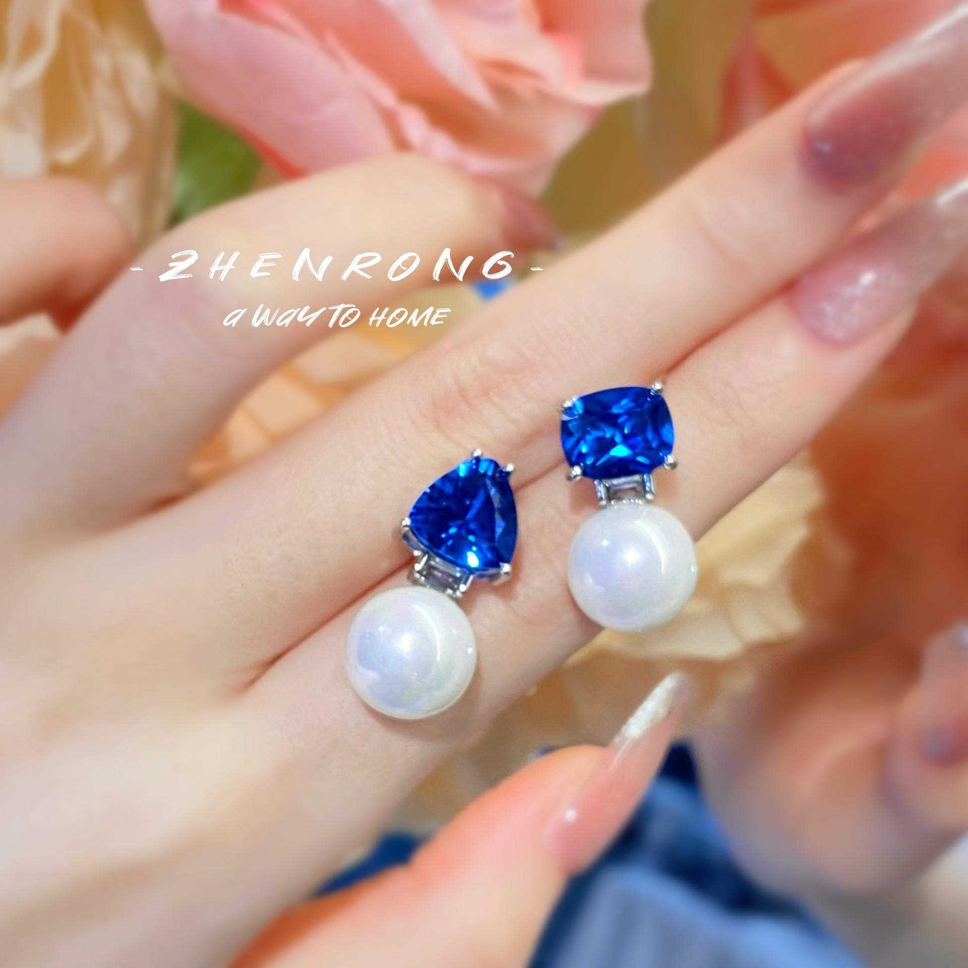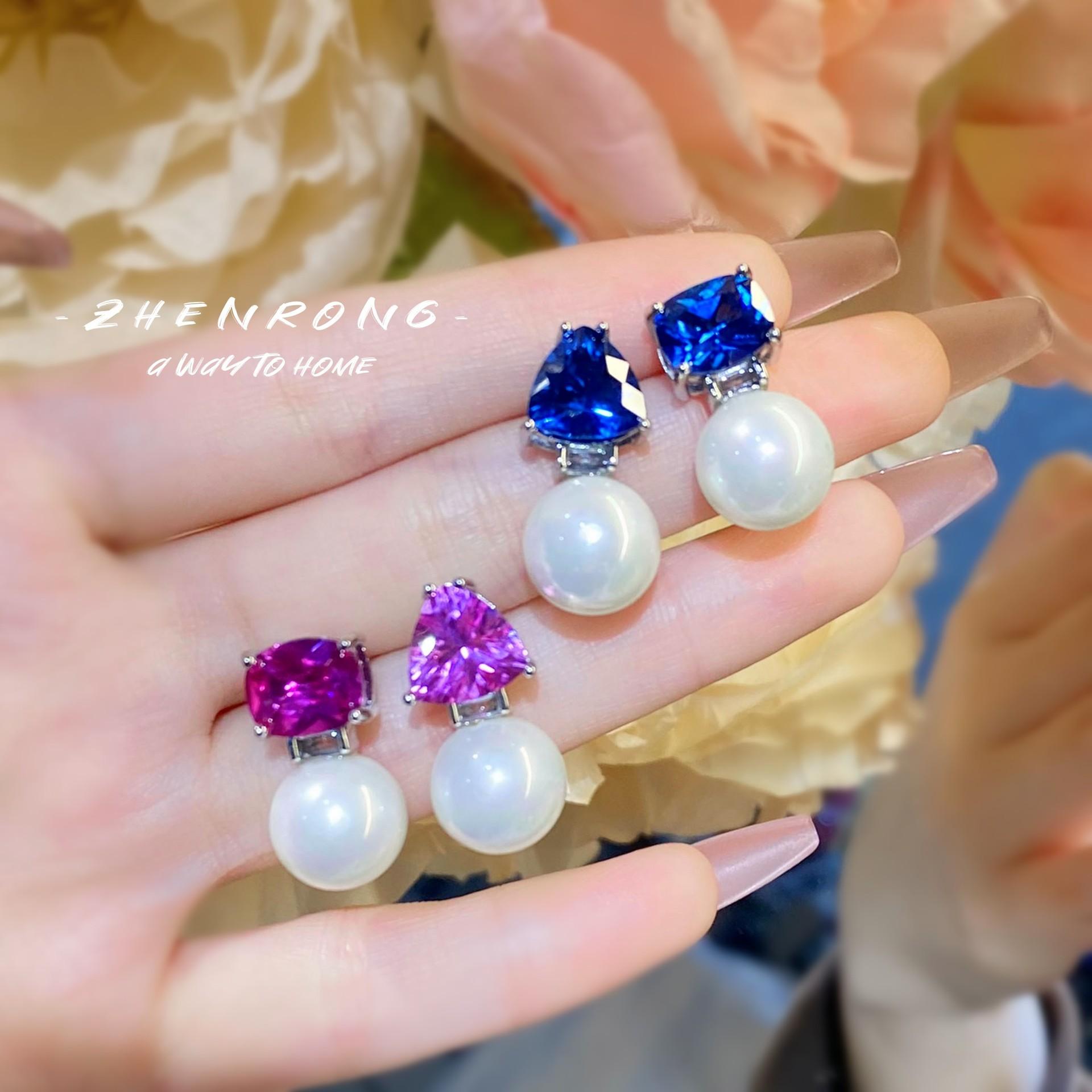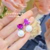 Blue pointed crystal pearl stud earrings [one pair price]], Red corundum pearl stud earrings [price for one pair]]