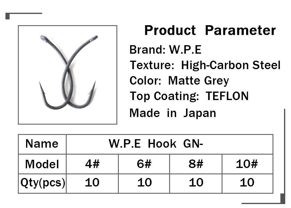 Marca: WPE Forma: Anzuelo de pesca Material: acero con alto contenido de carbono Tipo: Púa Ubicación: Río Color: gris pistola Modelo: 4#, 6#, 8#, 10# Serie: GN recubrimiento de teflón