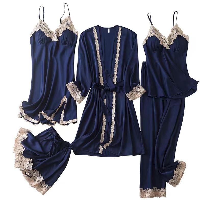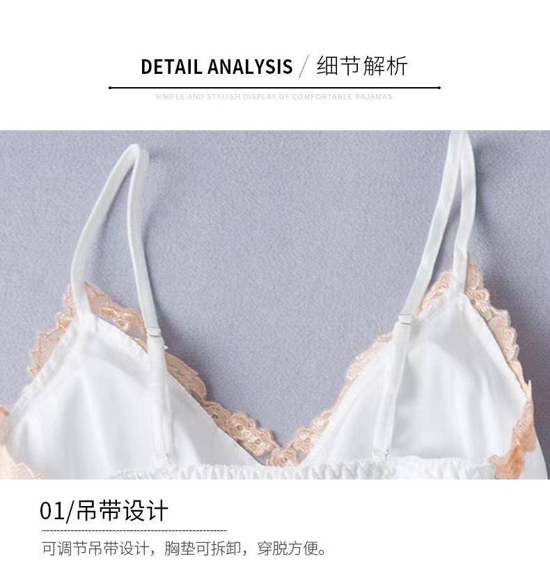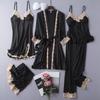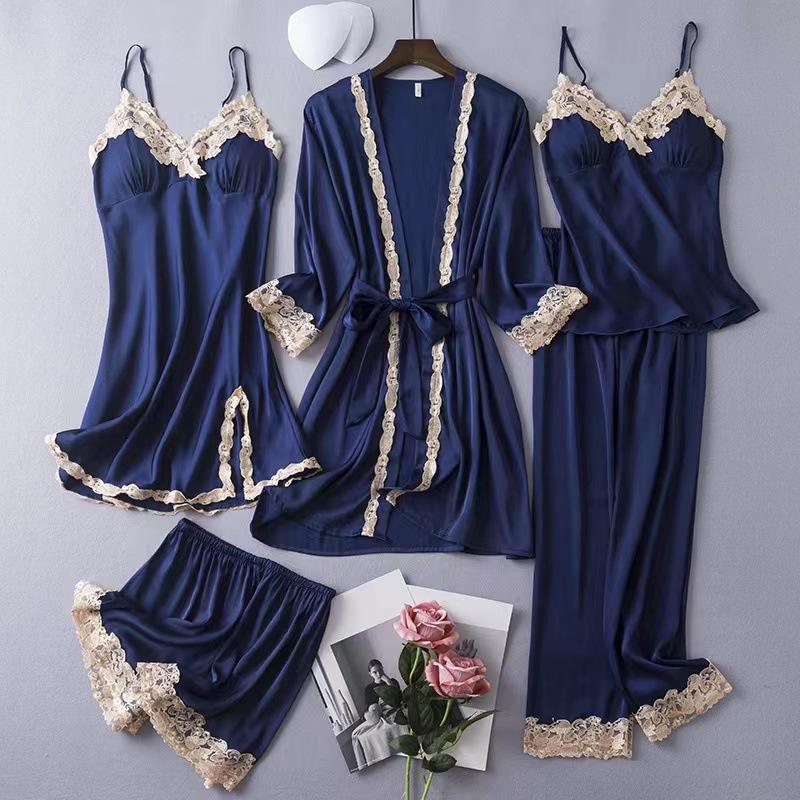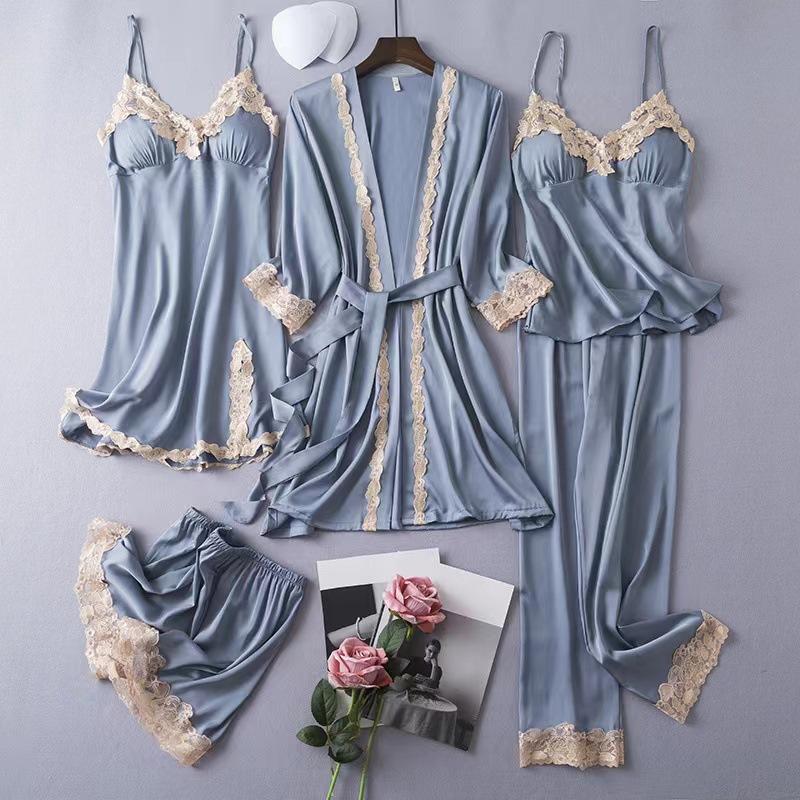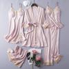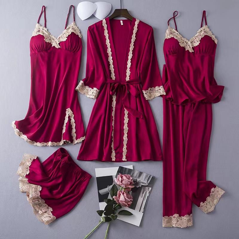 Nuevo Estilo Chino Verano Sexy Camisón de Mujer Primavera y Otoño Bata de Noche para Recién Casados Camisón con Almohadilla para el Busto Pijama con Tirantes Conjunto de Cinco Piezas