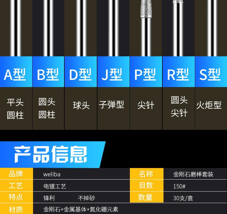 Juego de agujas de esmeril WELIBA para afilar esmeril, cabezal de afilar, broca de diamante, accesorios para tallado de jade, 30 piezas
