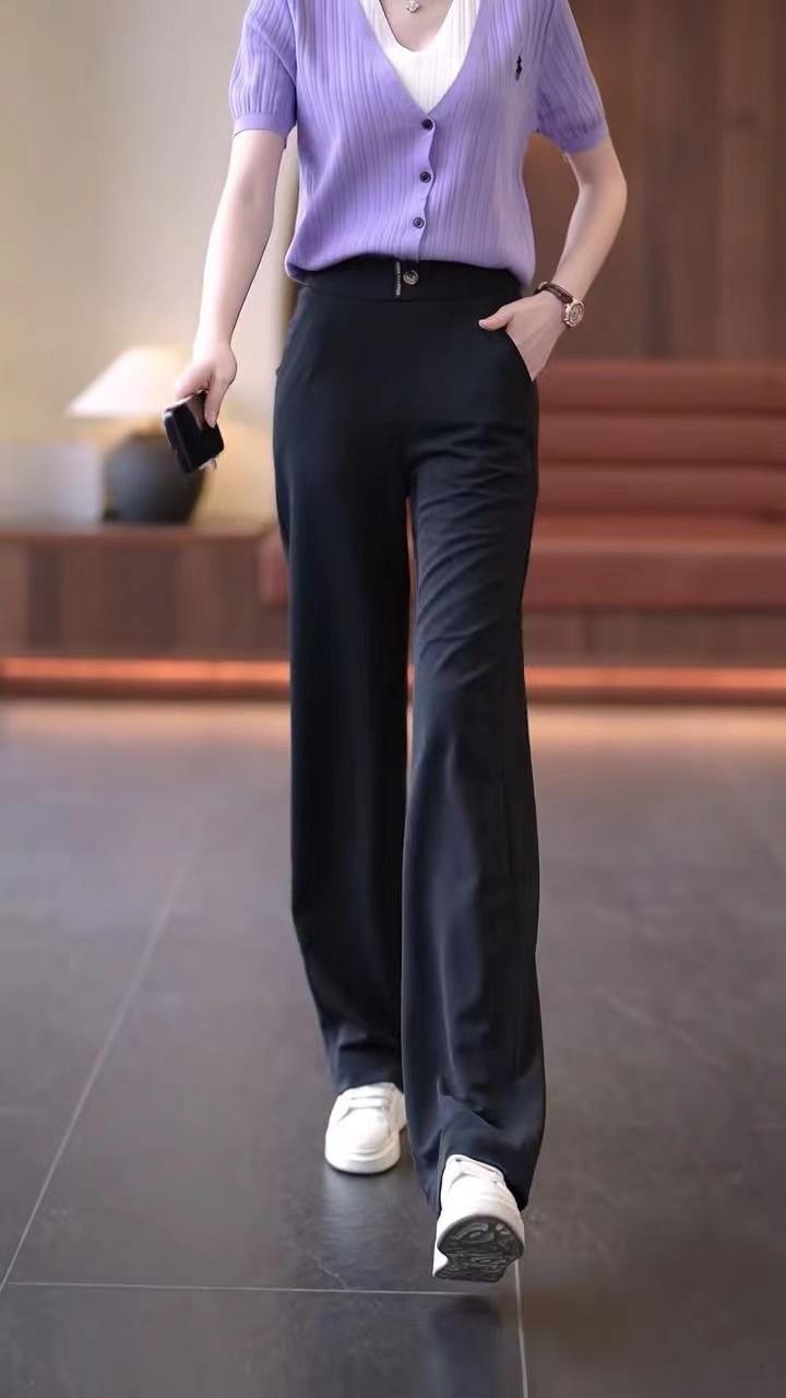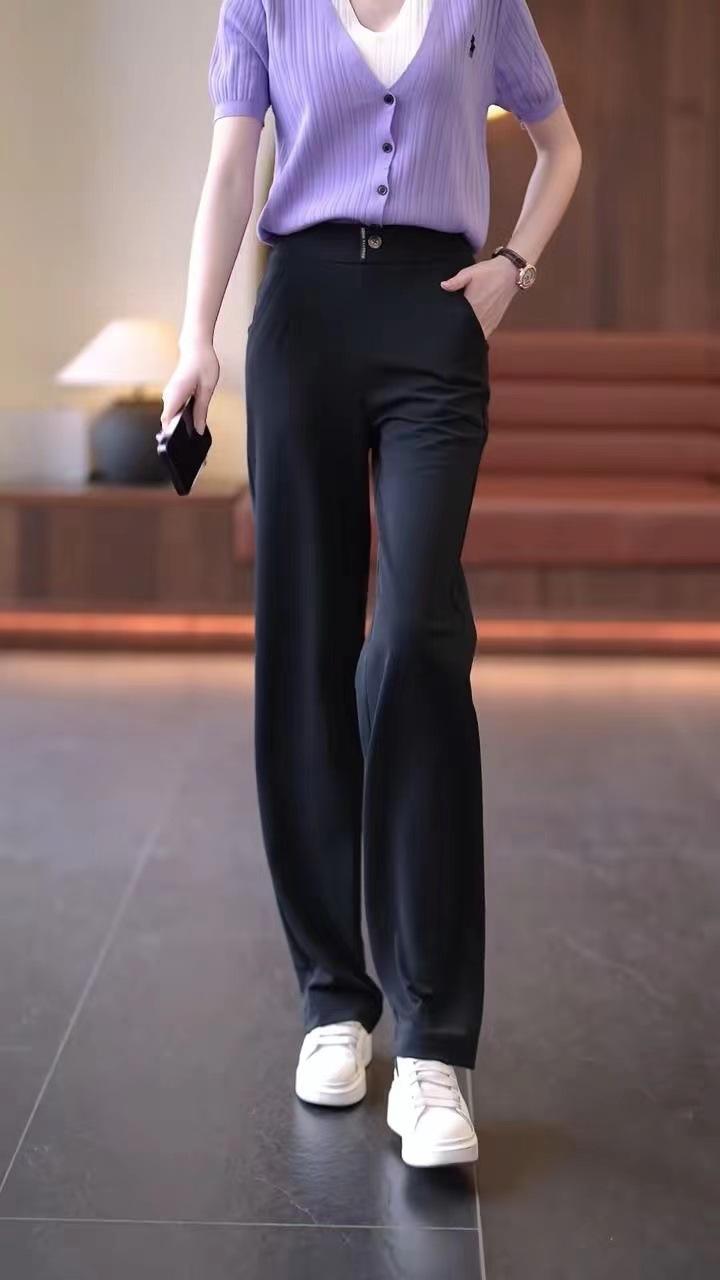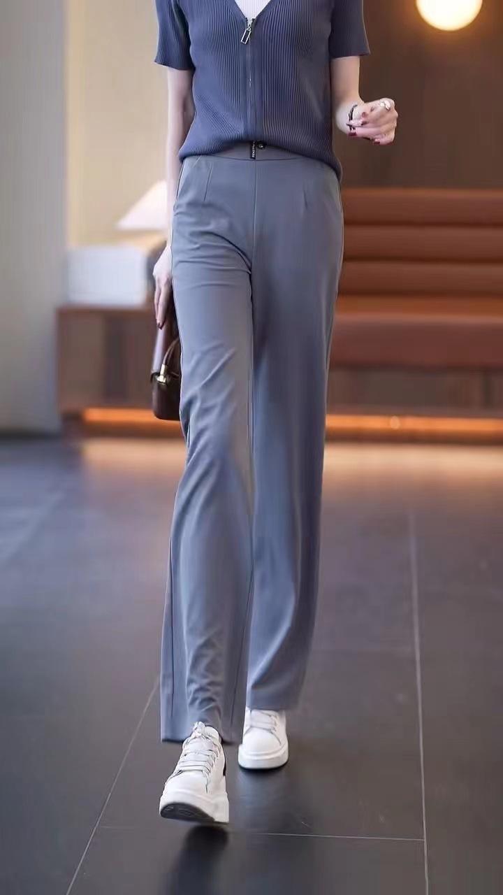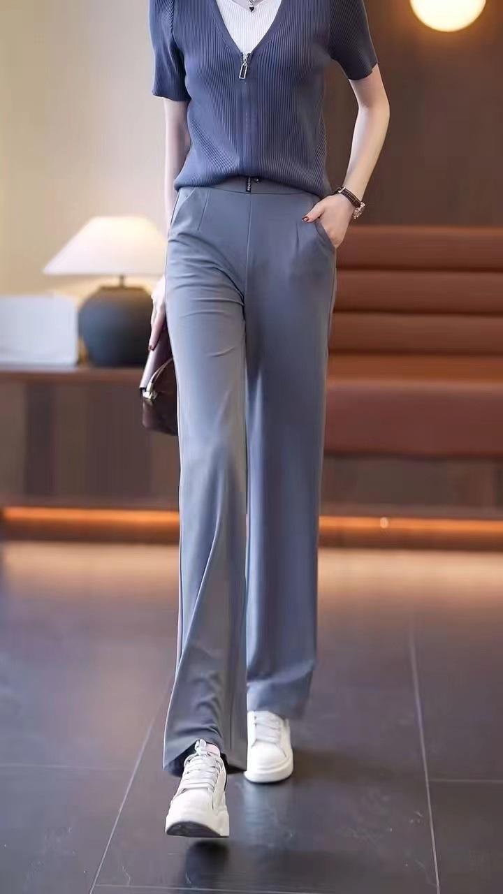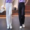Pantalones anchos y estrechos para mujer, verano 2024, nuevos pantalones adelgazantes de cintura alta para pantalones rectos de seda fina de hielo pequeños.