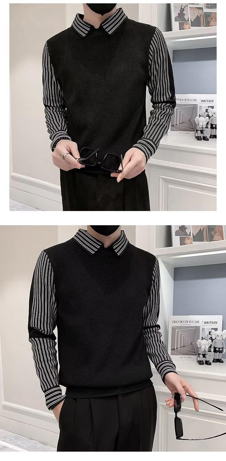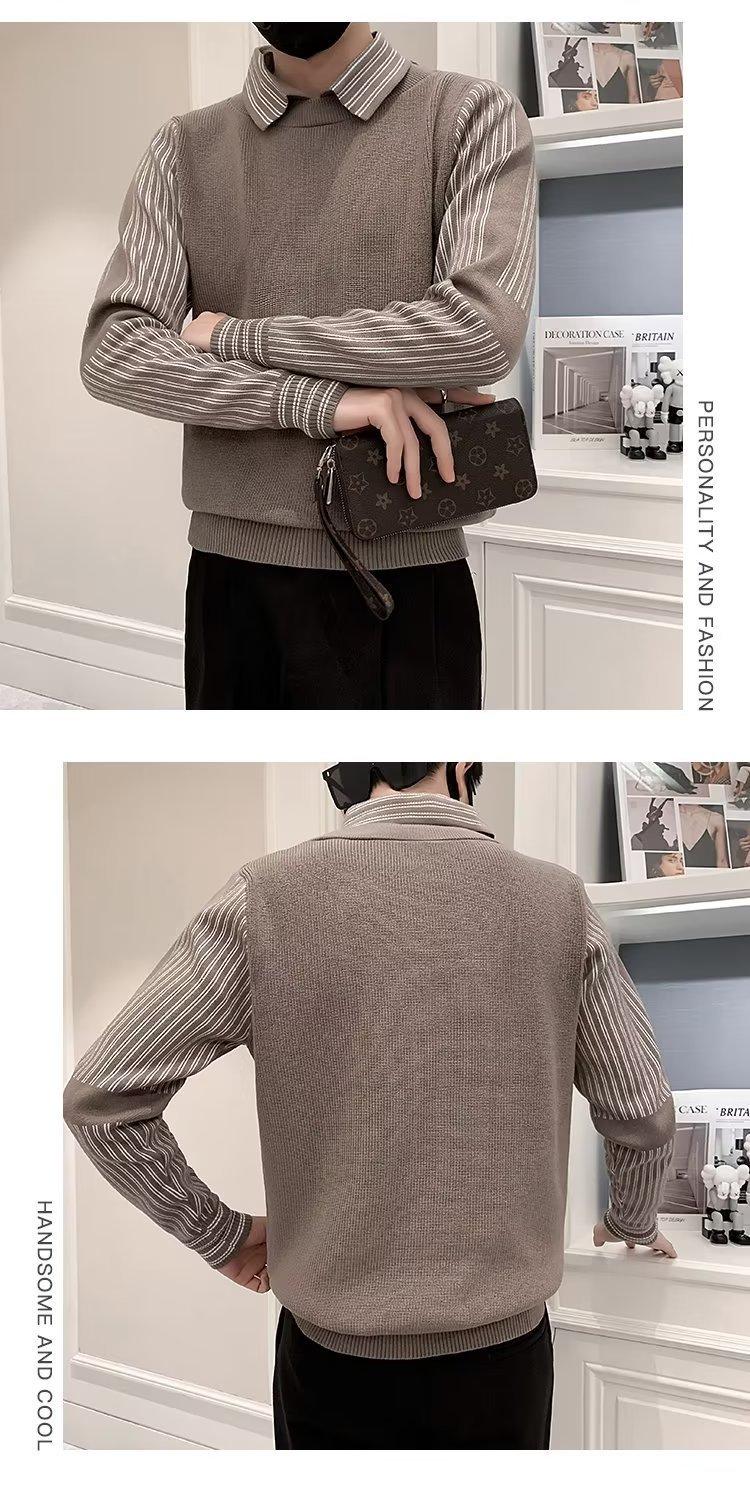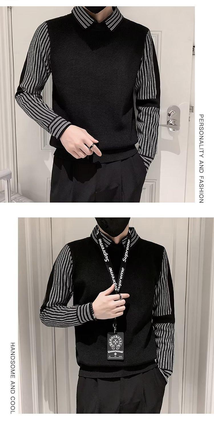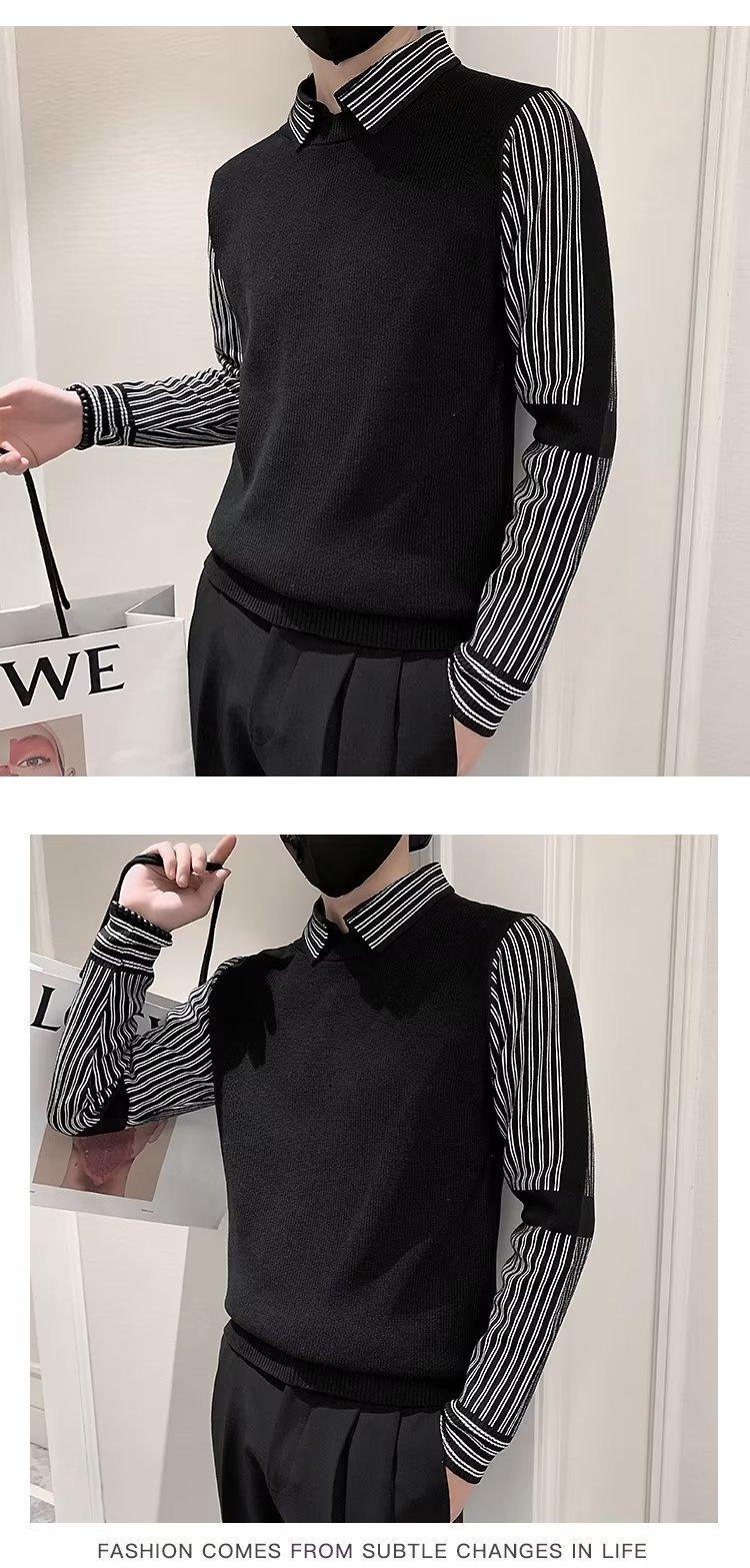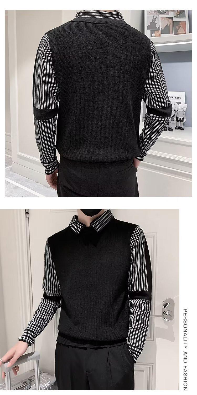 Suéter de solapa a rayas de dos piezas falso para hombre, suéter delgado de otoño e invierno coreano, top de temperamento casual para hombre