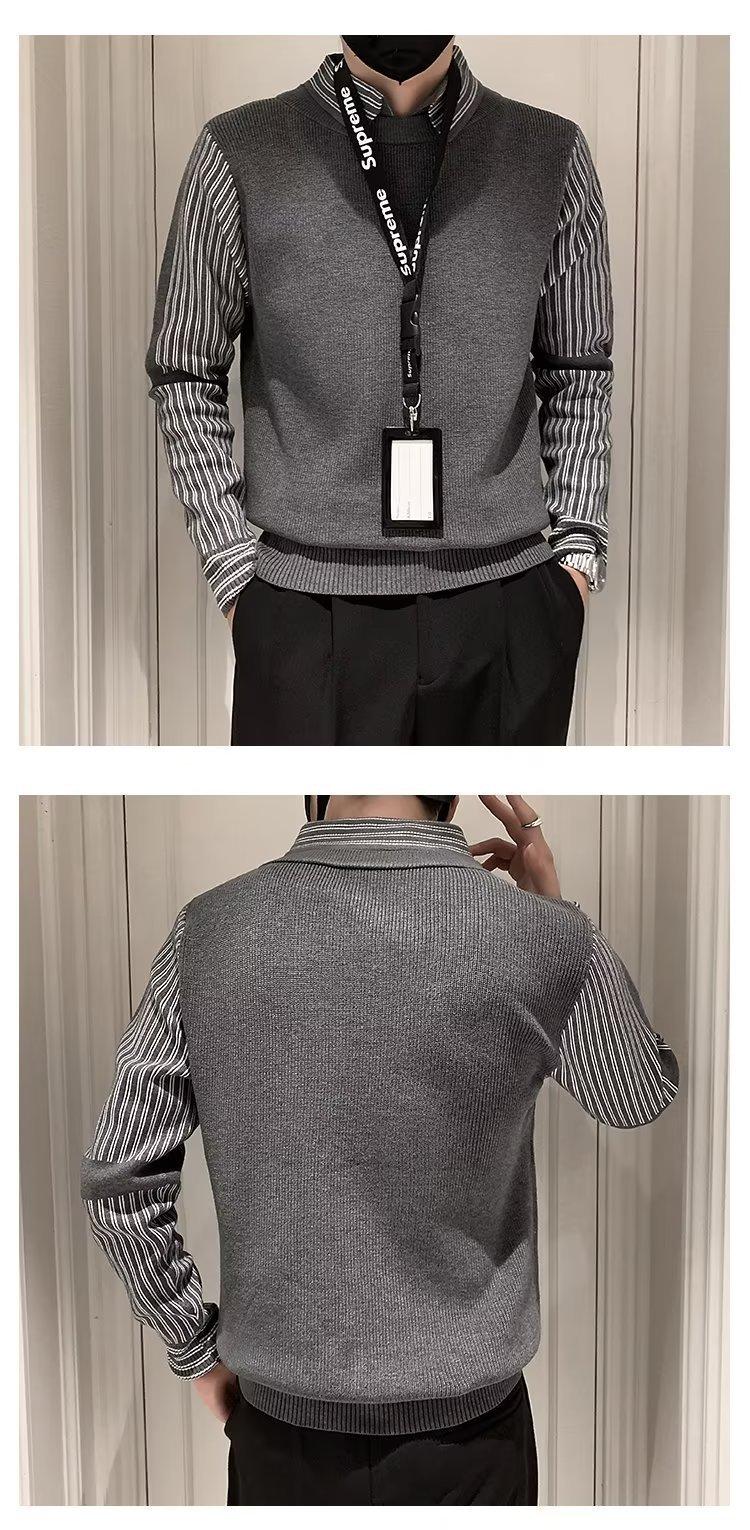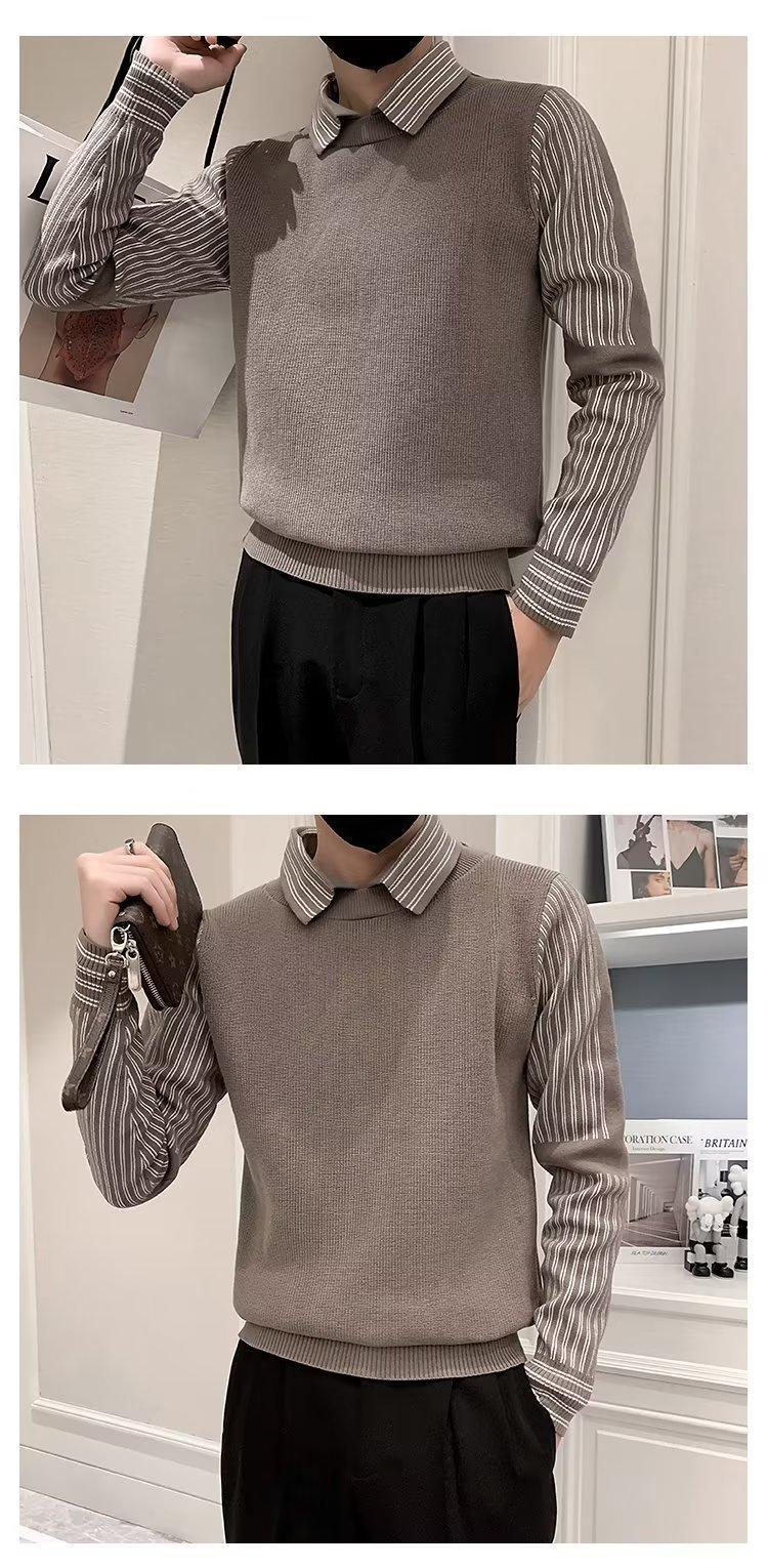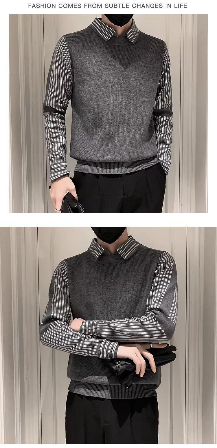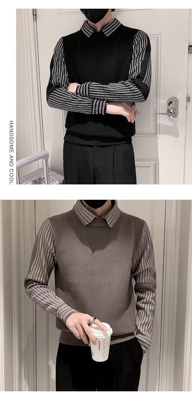 Suéter de solapa a rayas de dos piezas falso para hombre, suéter delgado de otoño e invierno coreano, top de temperamento casual para hombre