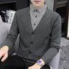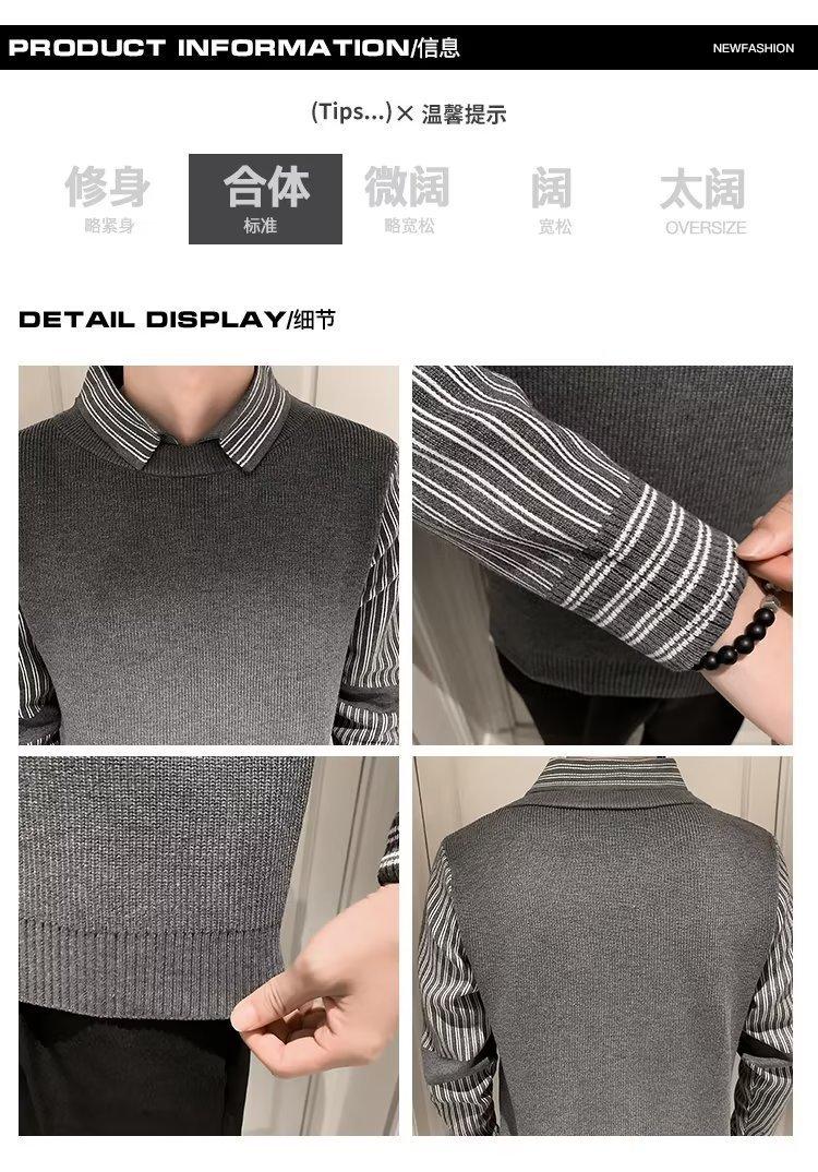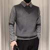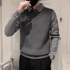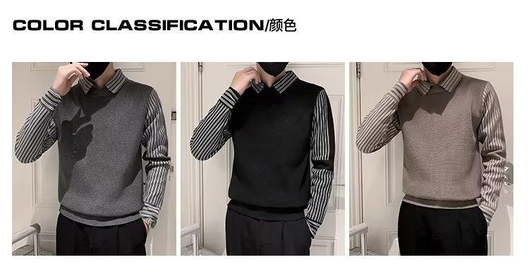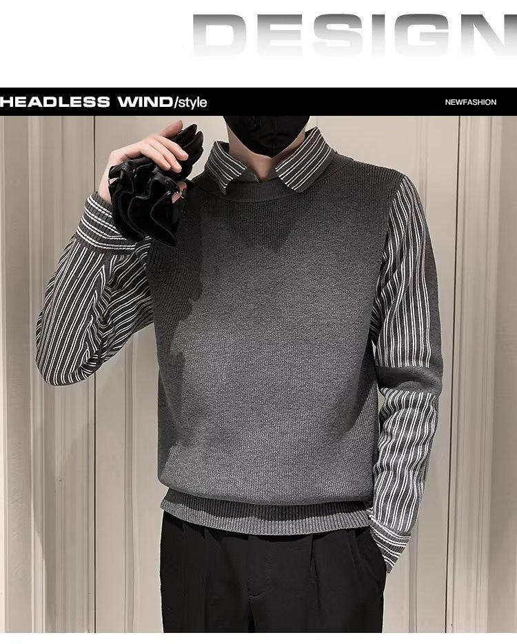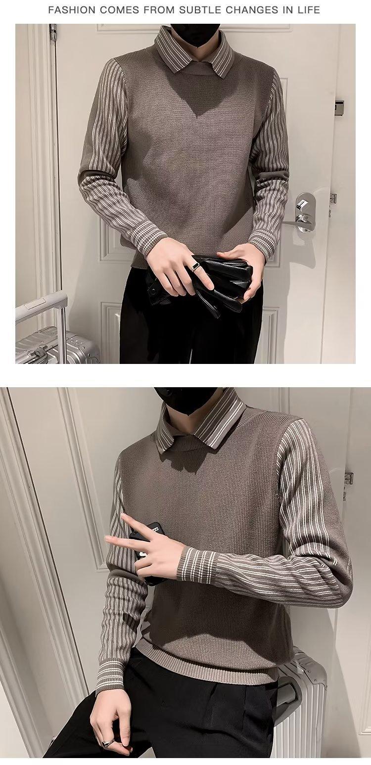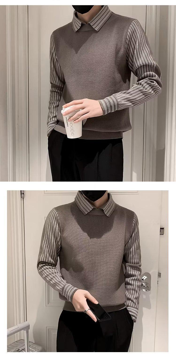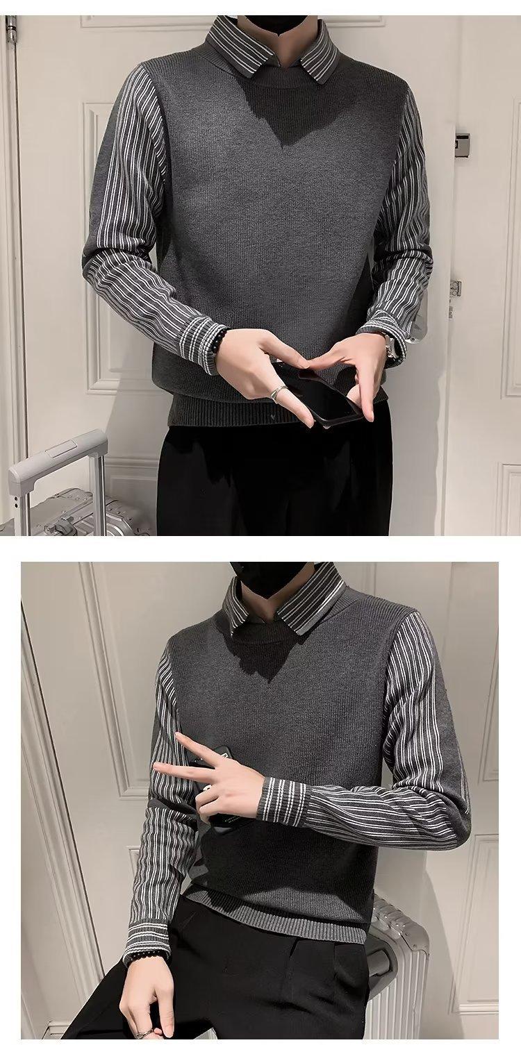 Suéter de solapa a rayas de dos piezas falso para hombre, suéter delgado de otoño e invierno coreano, top de temperamento casual para hombre