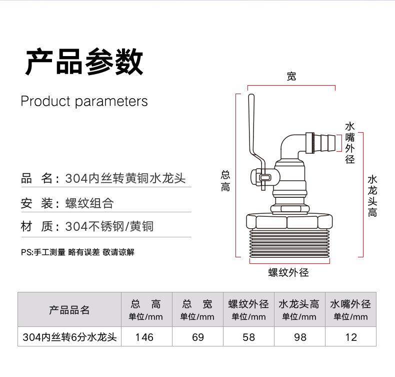 【98672】304Relleno del núcleo2 pulgadas a grifo de latón de 6 puntos + 6 puntosPeso: 326g