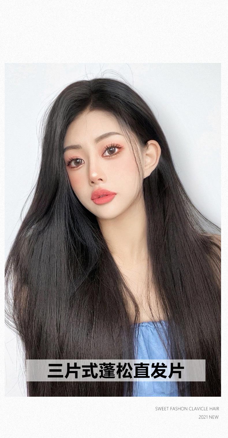 Parche de extensión de cabello de una pieza popular para mujer, de tres piezas, de cabello largo, invisible, sin costuras, artificial, esponjoso y liso
