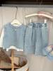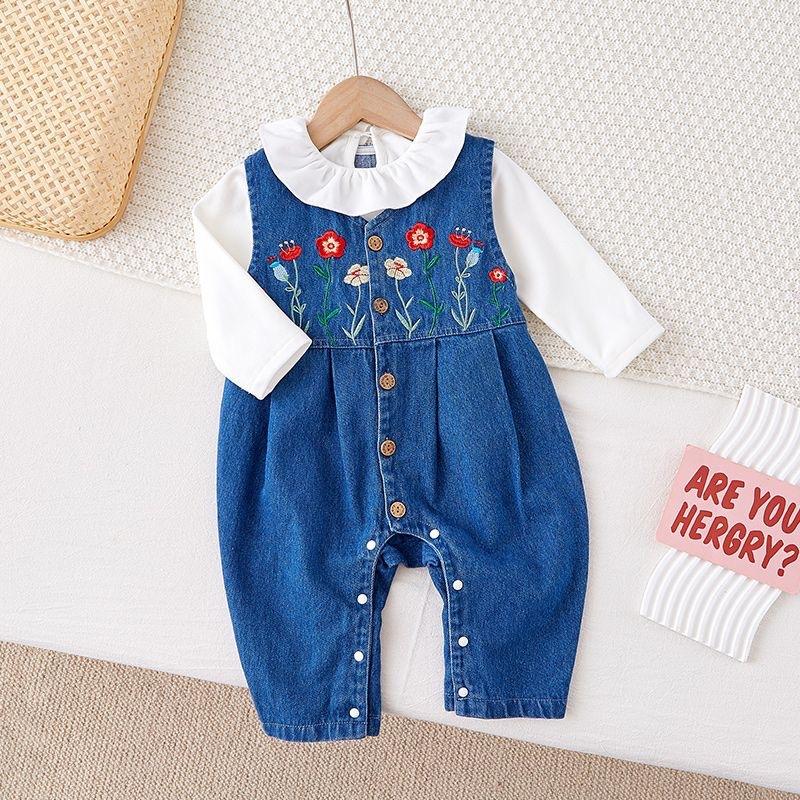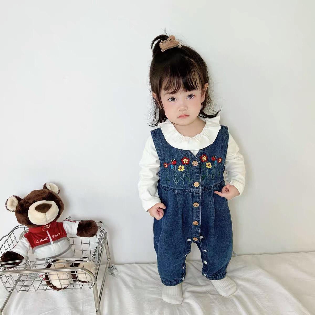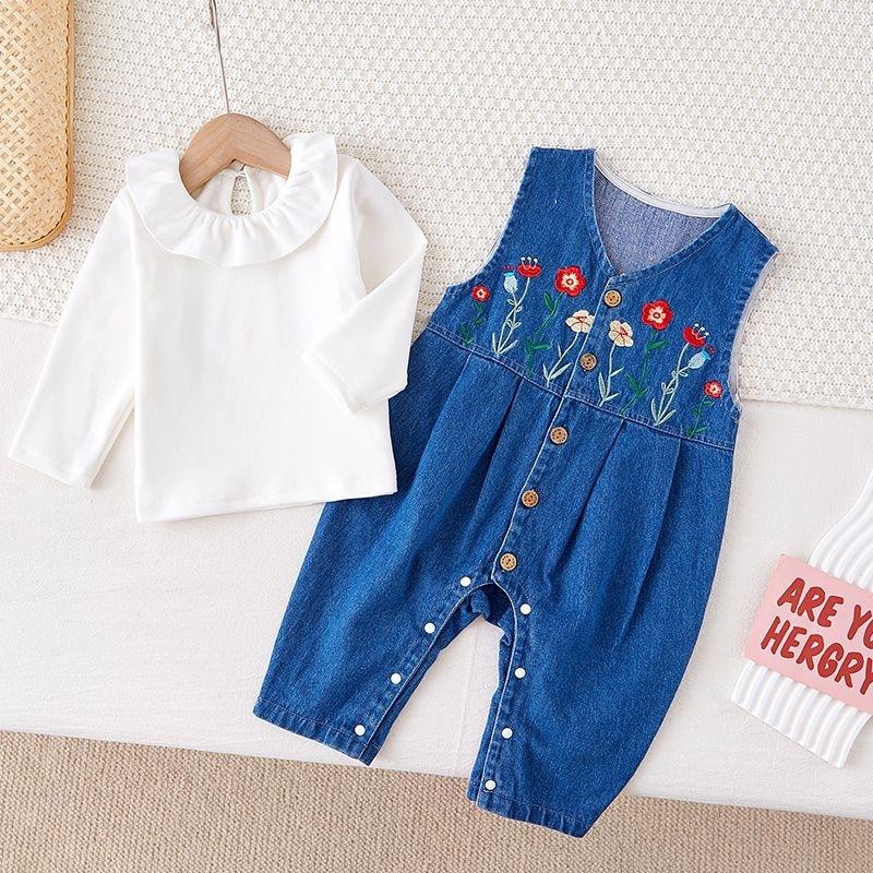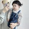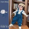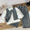 Conjunto de mezclilla de otoño para bebé de dos piezas para bebé niña, traje de estilo coreano de otoño para bebé, pantalones de manga elegantes fuera de estilo