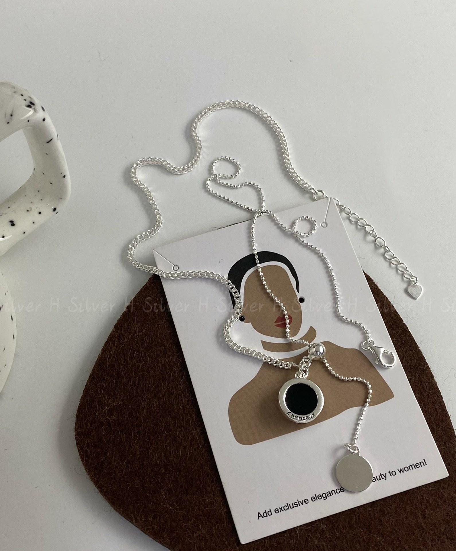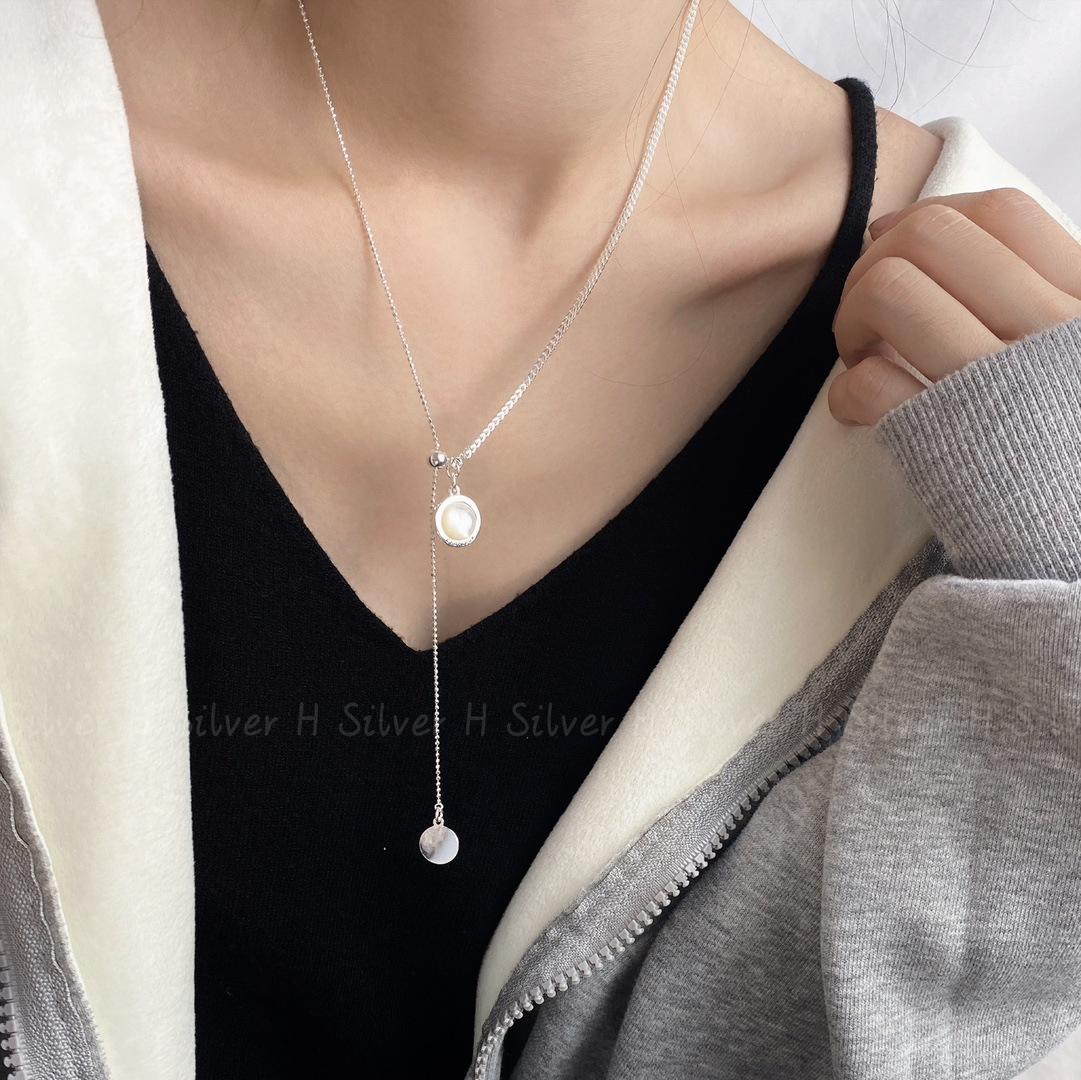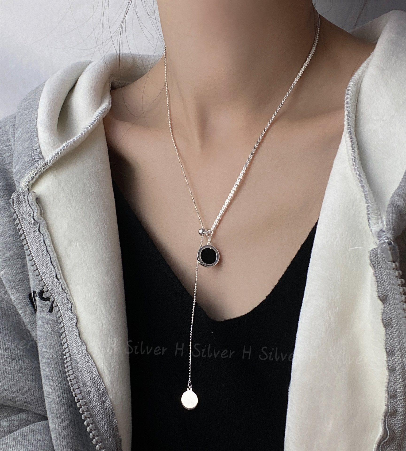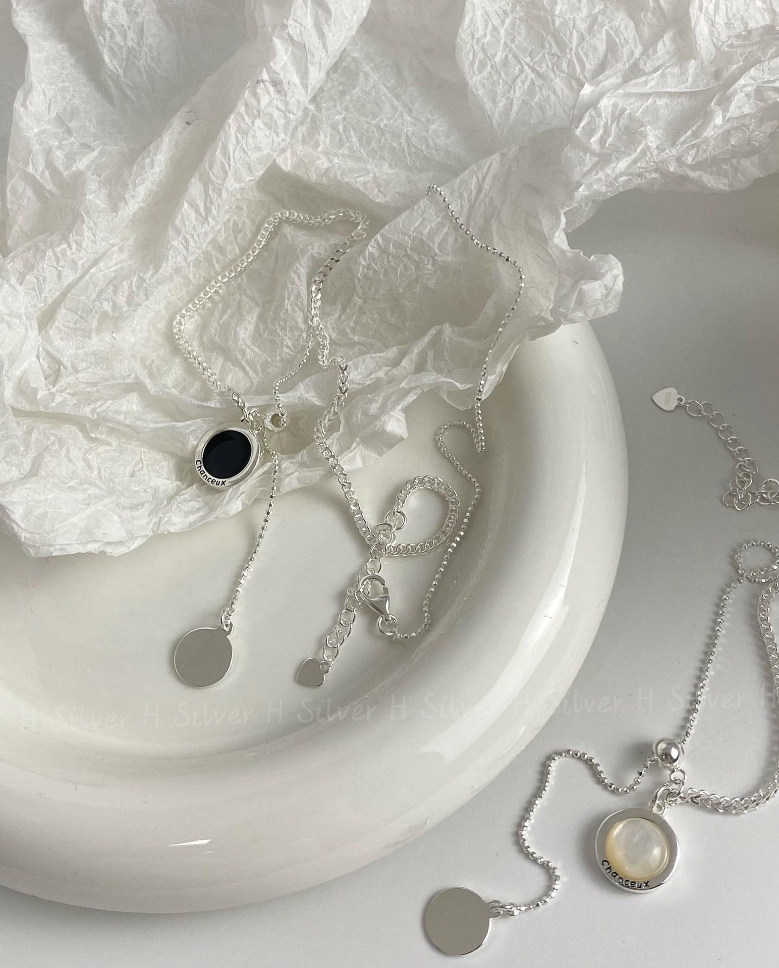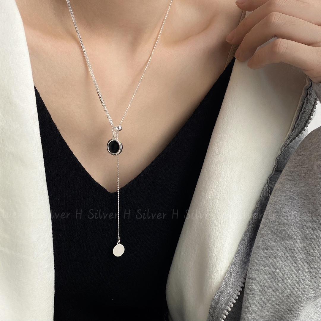 Collar de plata de ley S925 con cadena de clavícula de doble cara con esmalte negro y concha blanca, diseño de nicho con personalidad