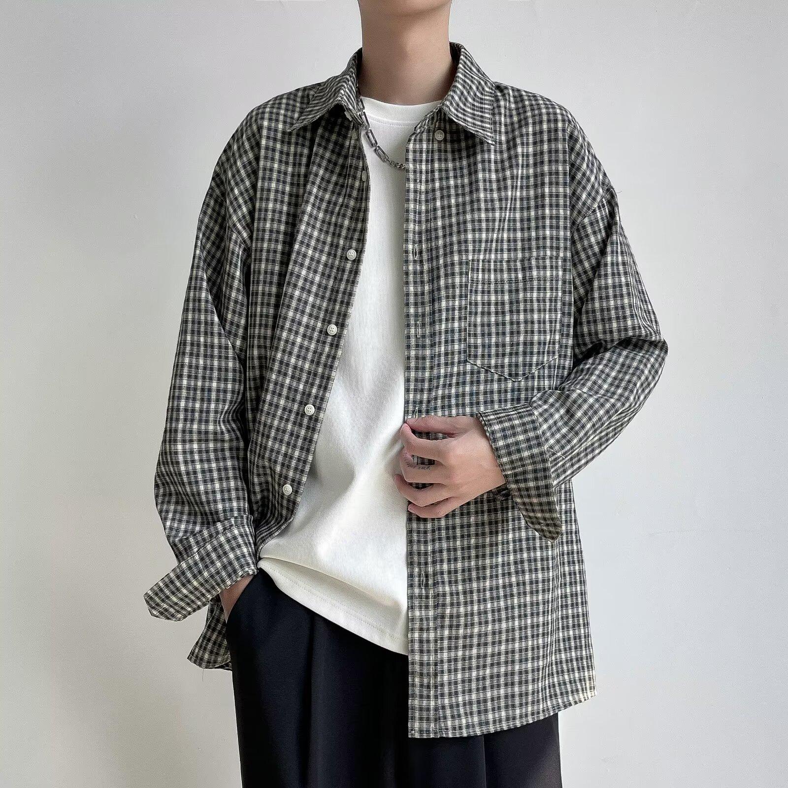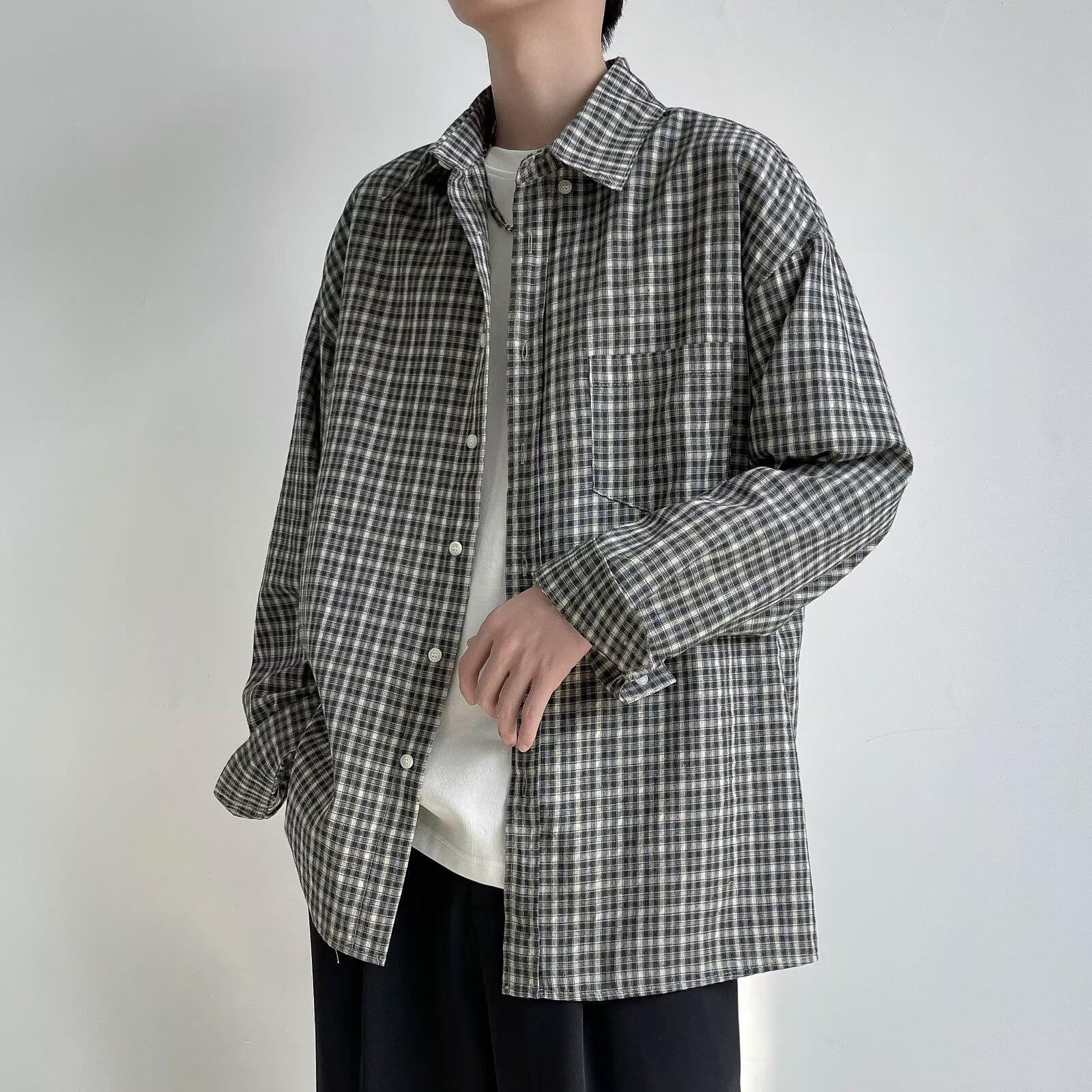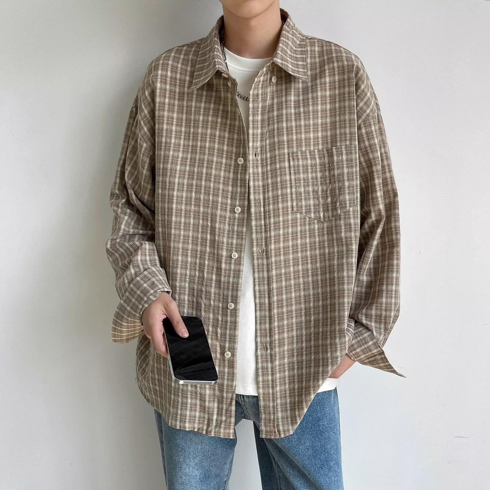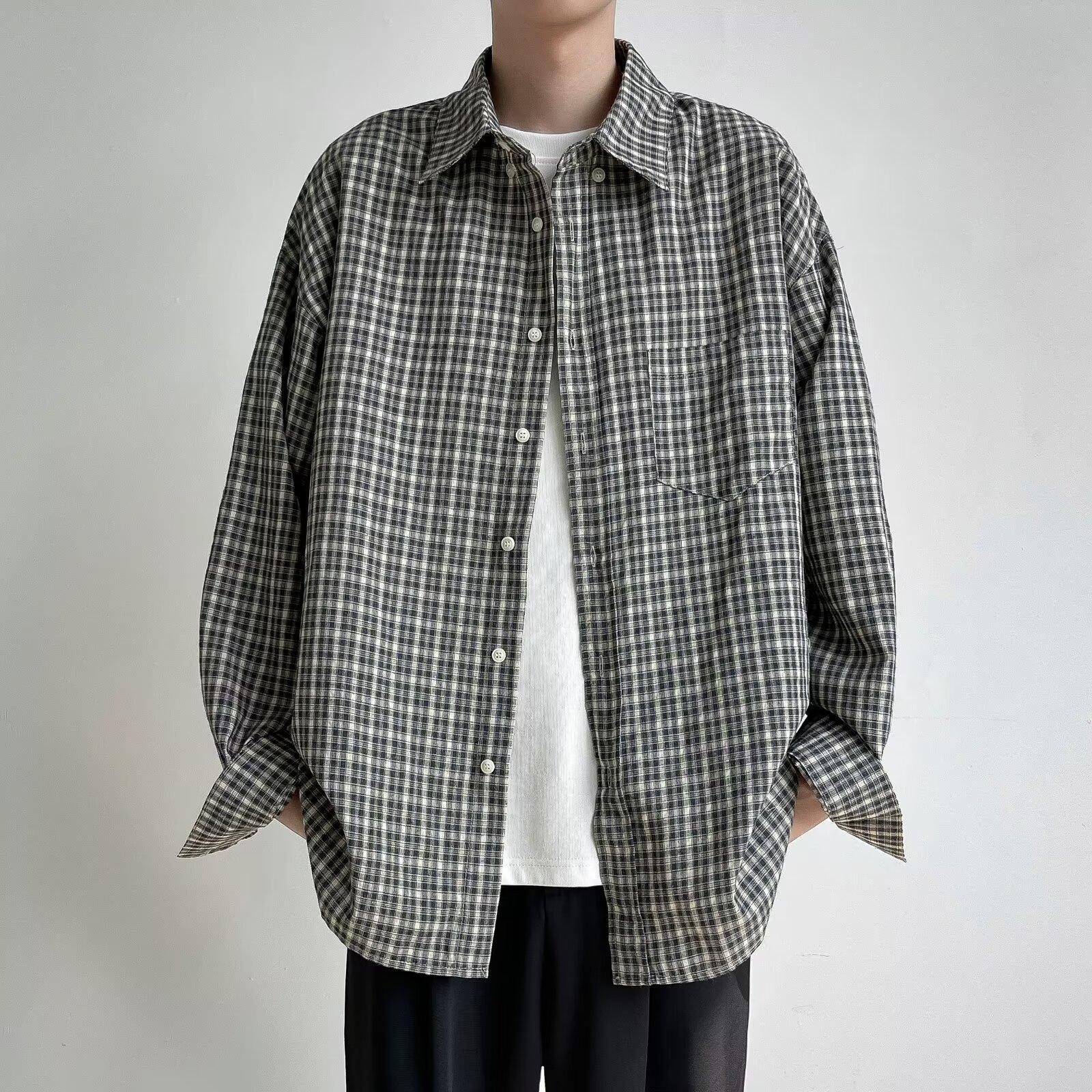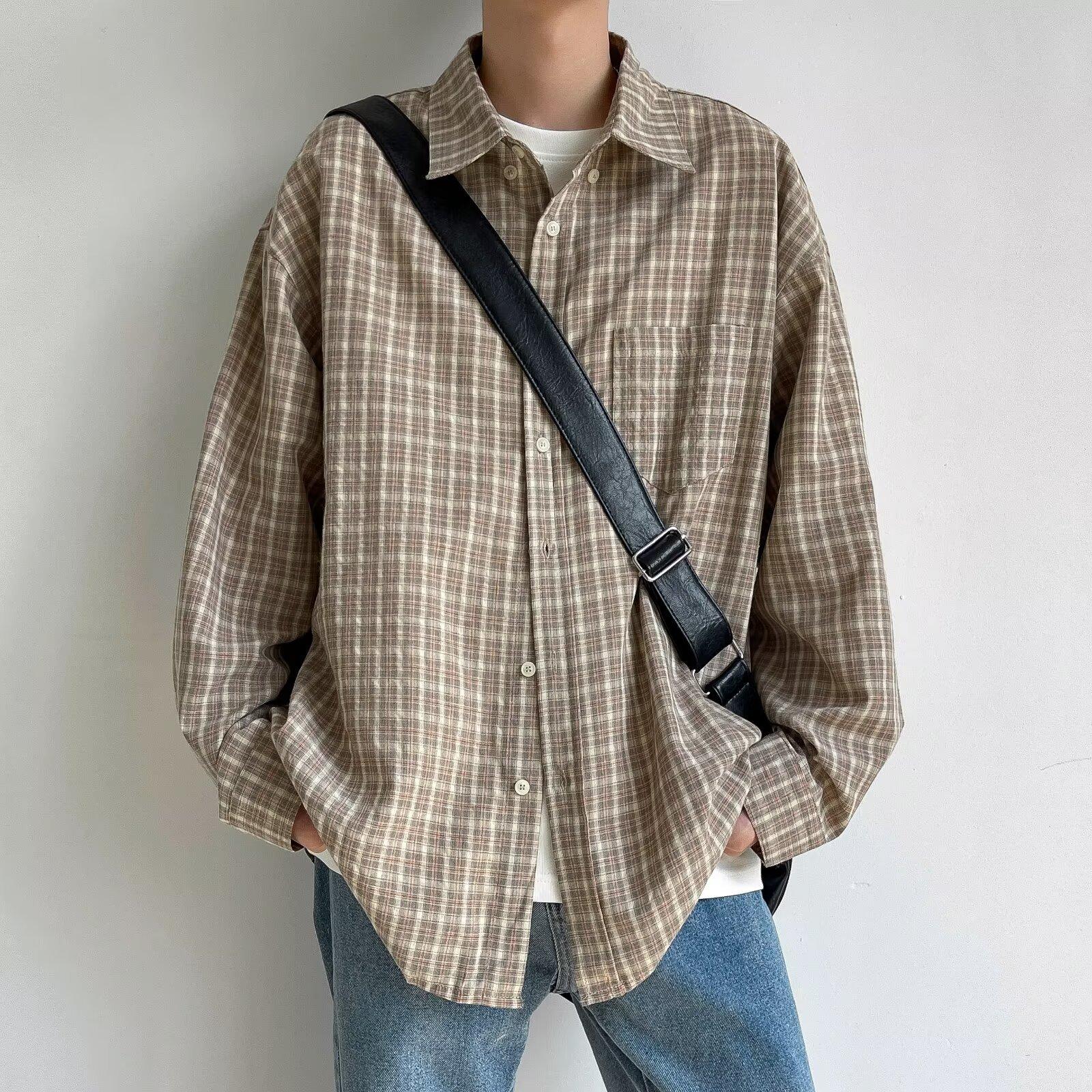 Camisa retro de estilo americano para hombre, de manga larga, para primavera y otoño, nueva marca de moda, camisa a cuadros, abrigo informal holgado con solapa para el campus.