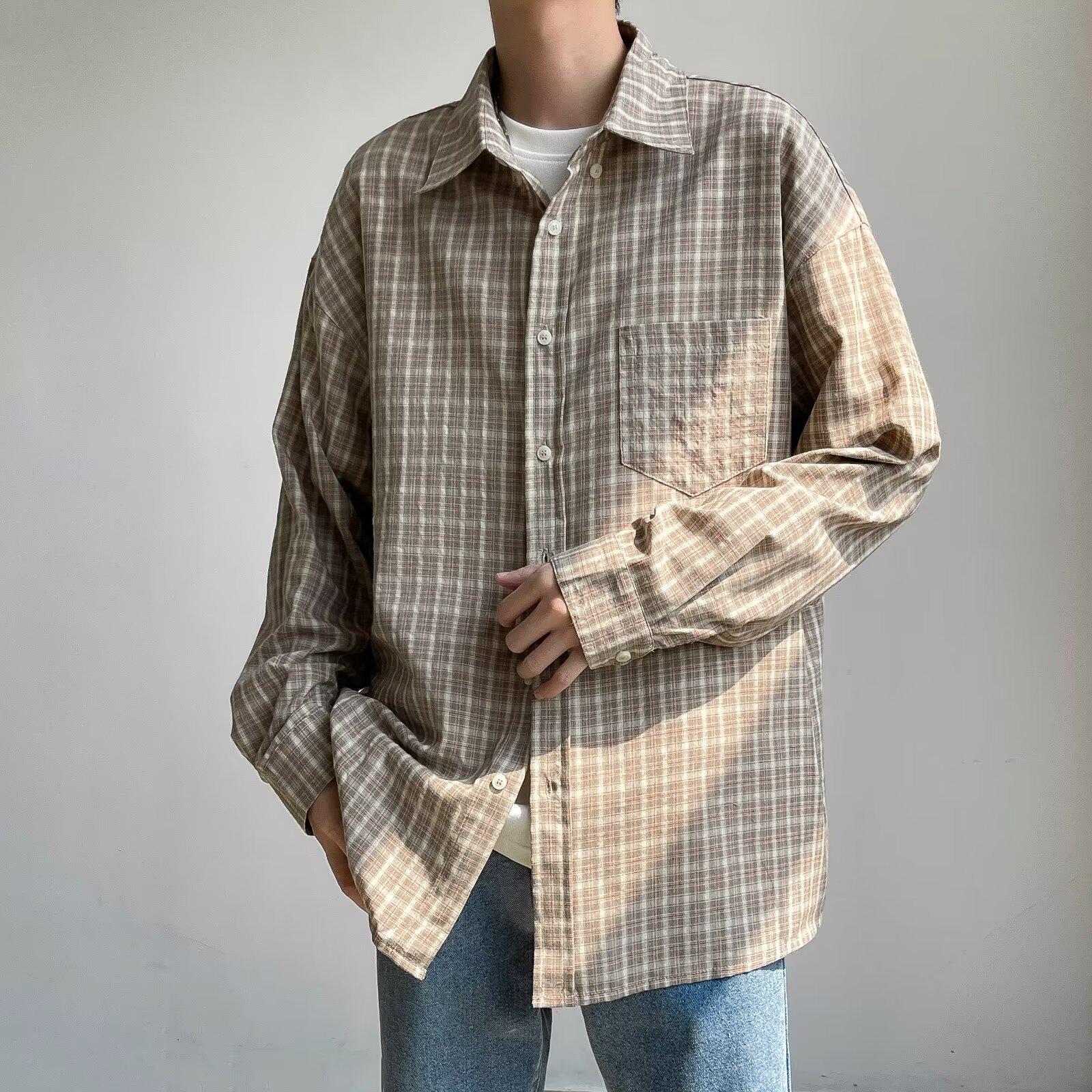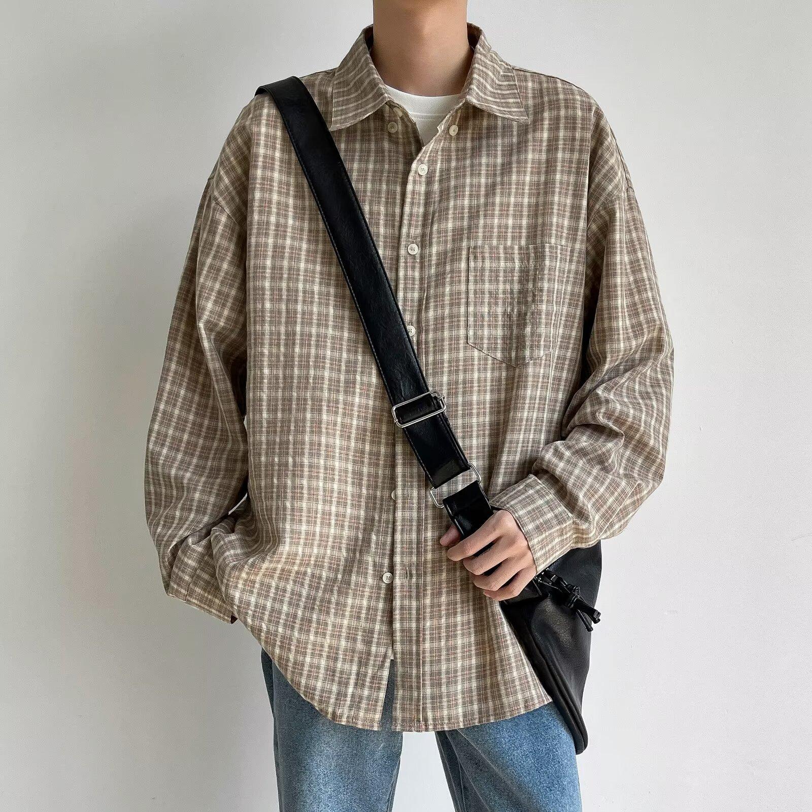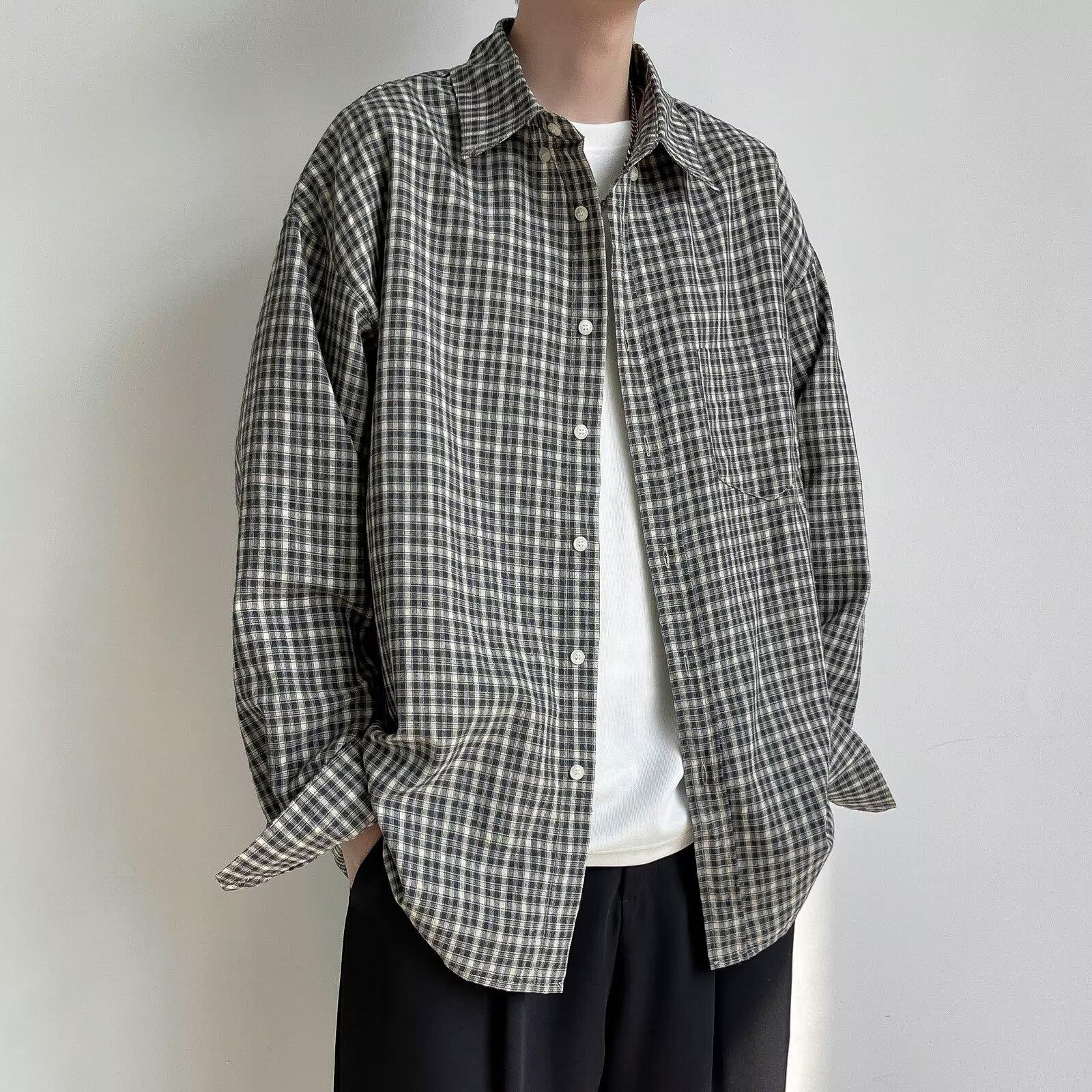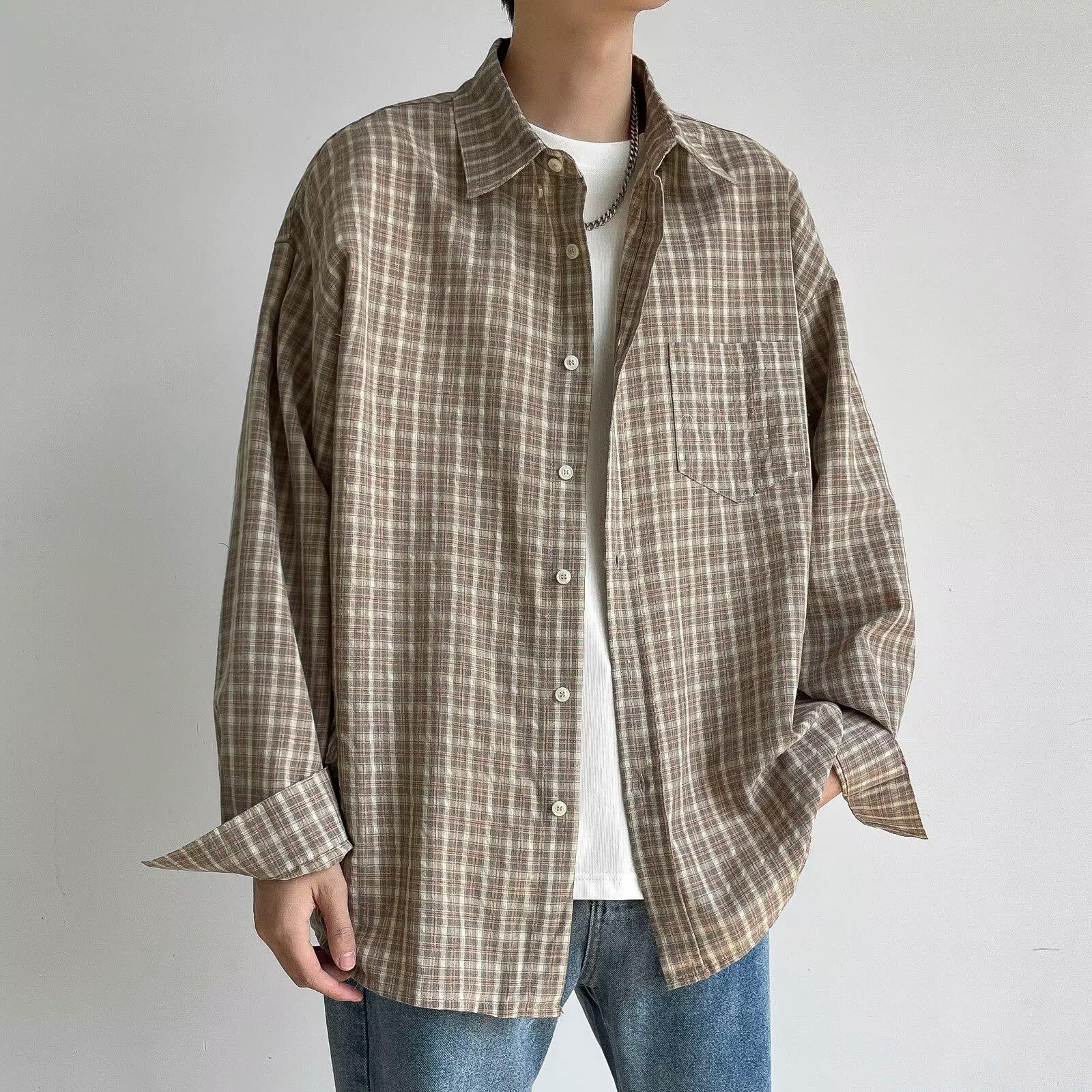 Camisa retro de estilo americano para hombre, de manga larga, para primavera y otoño, nueva marca de moda, camisa a cuadros, abrigo informal holgado con solapa para el campus.