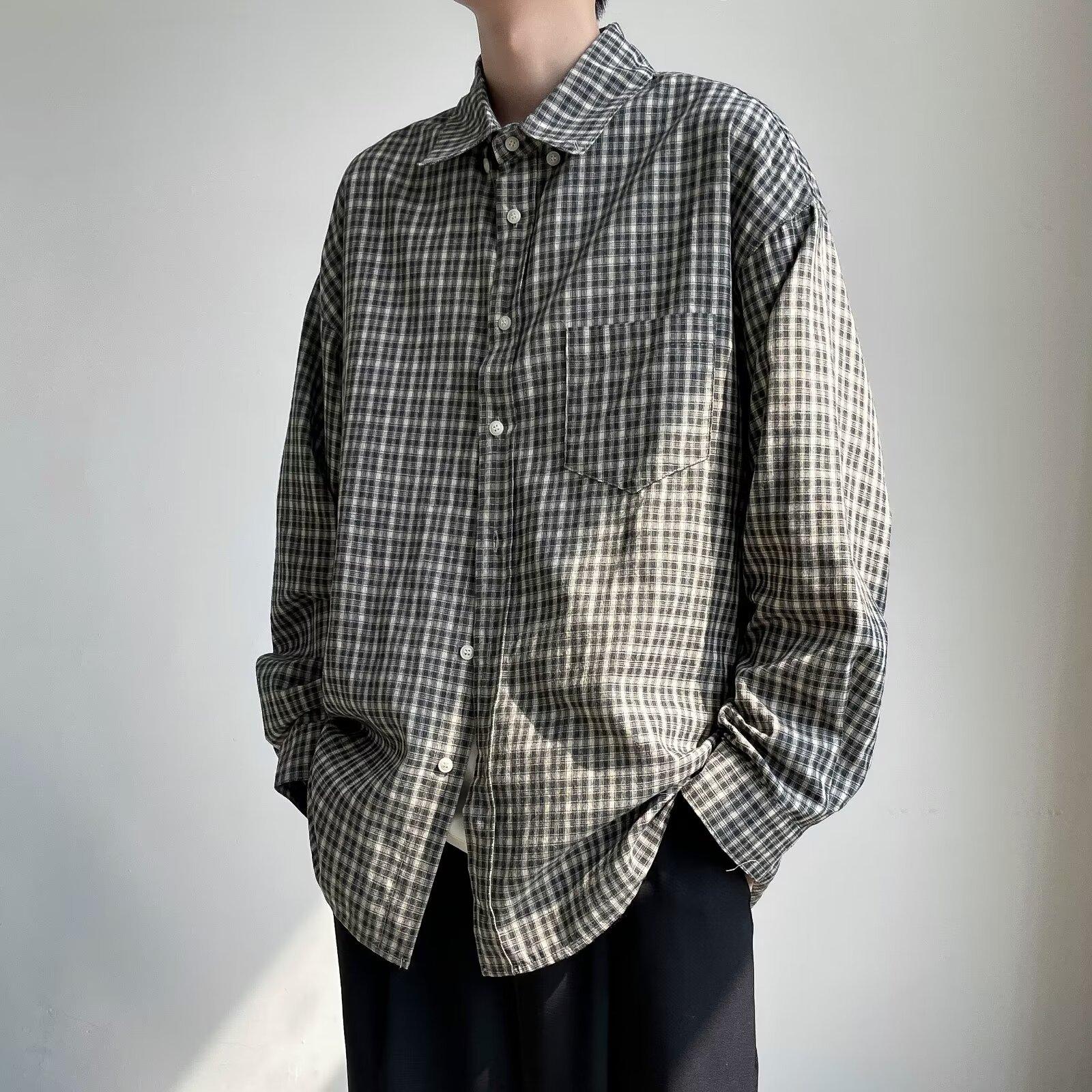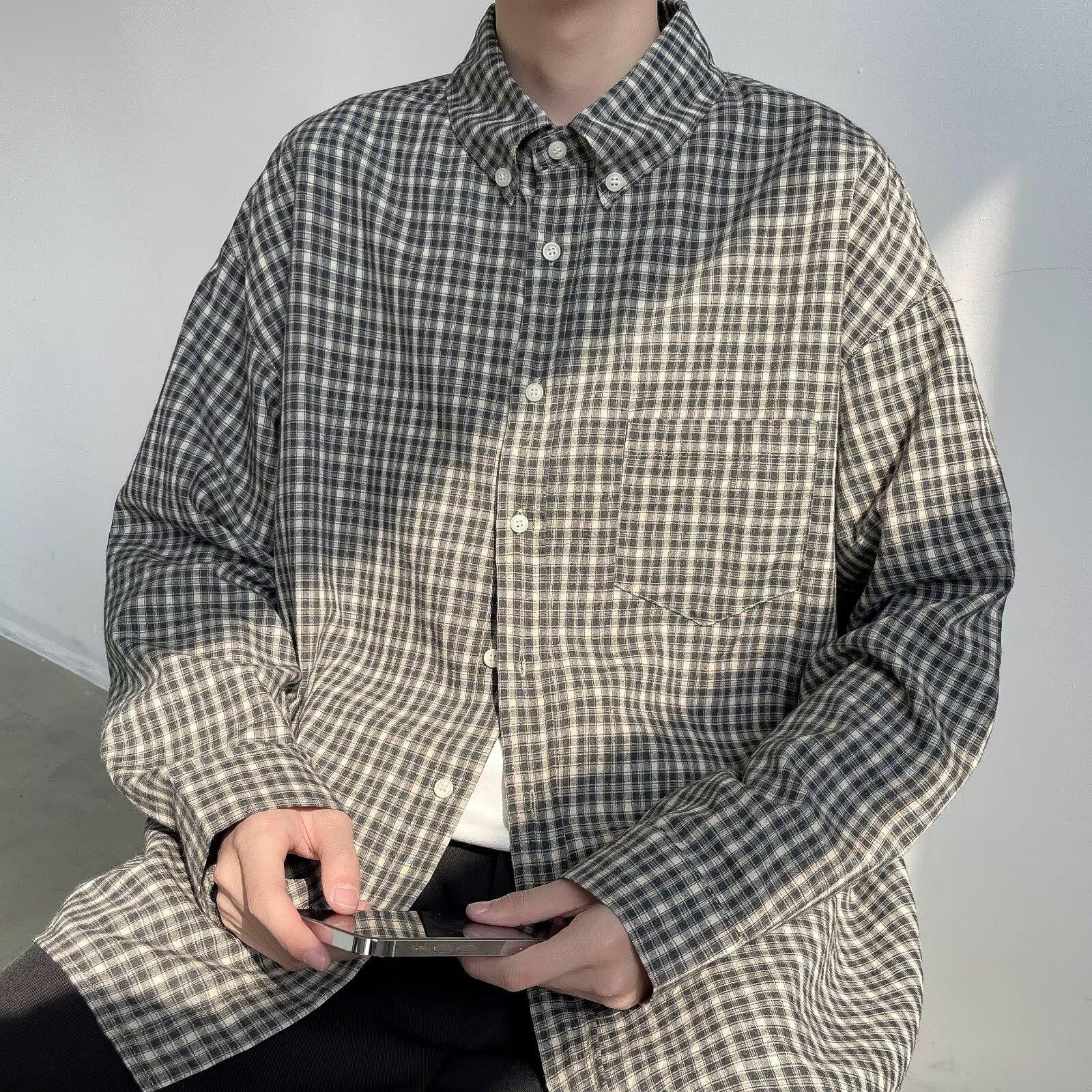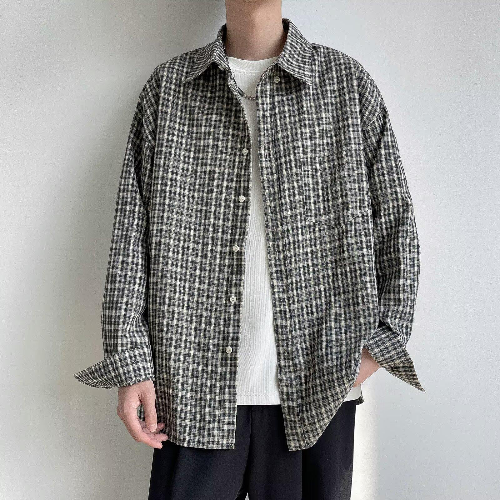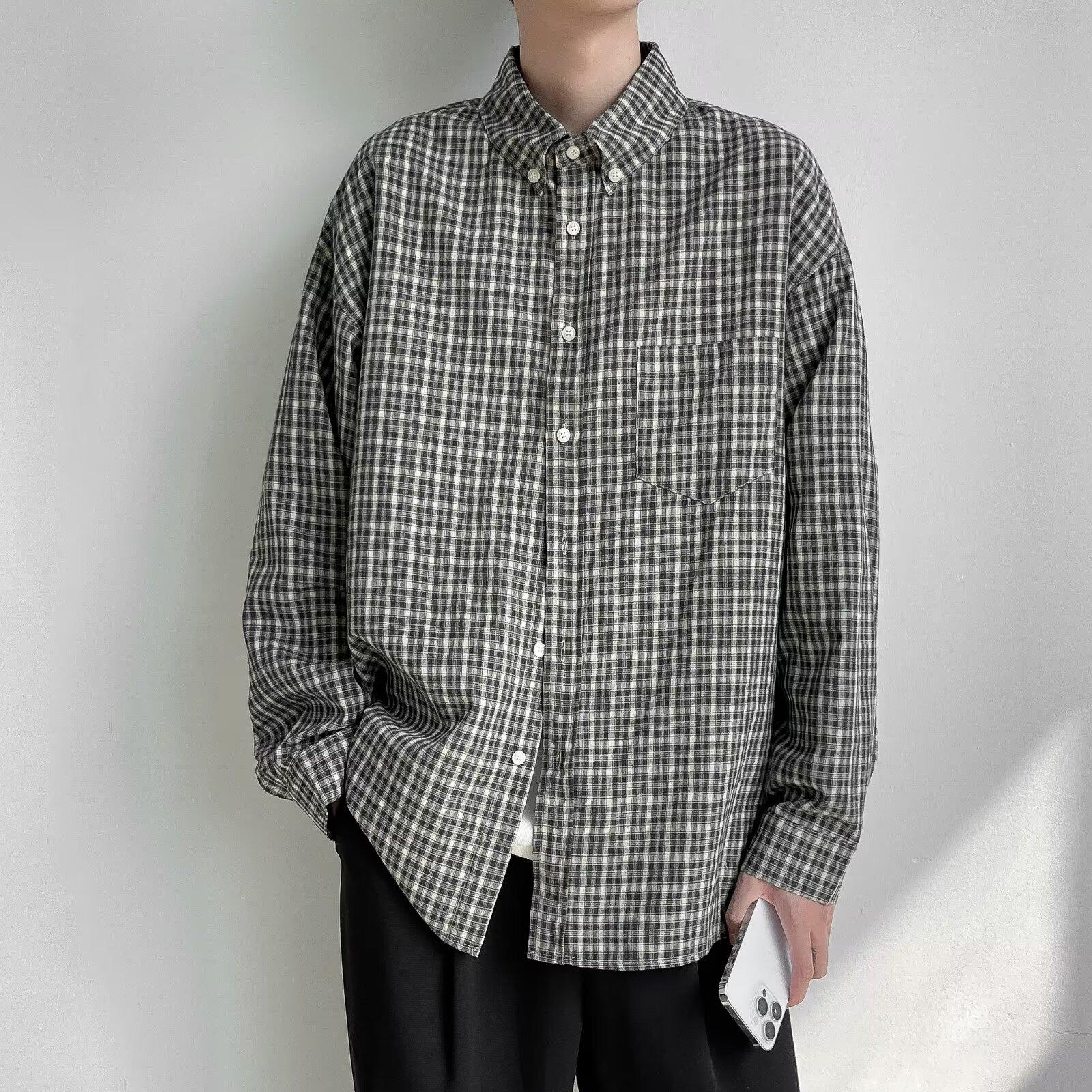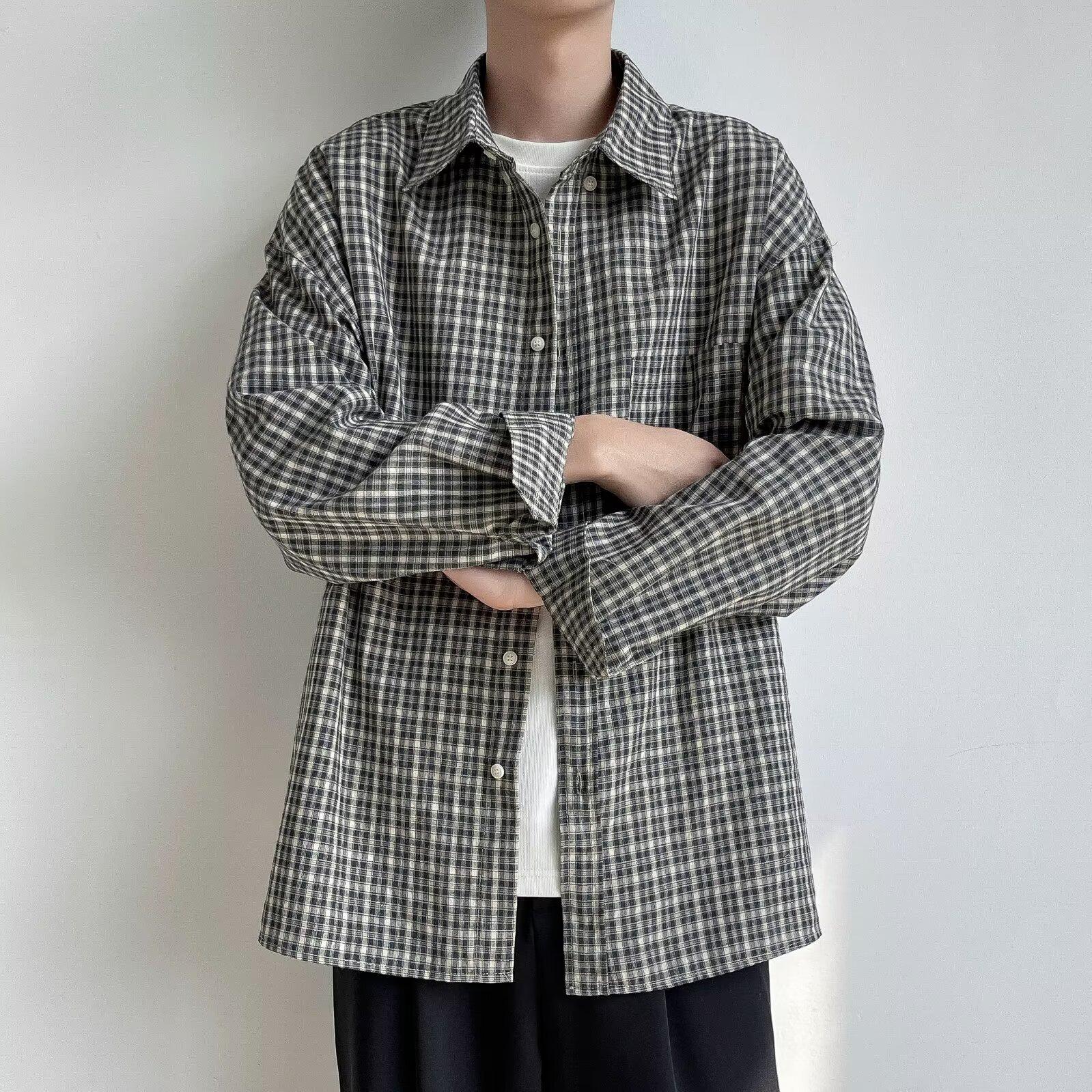 Camisa retro de estilo americano para hombre, de manga larga, para primavera y otoño, nueva marca de moda, camisa a cuadros, abrigo informal holgado con solapa para el campus.
