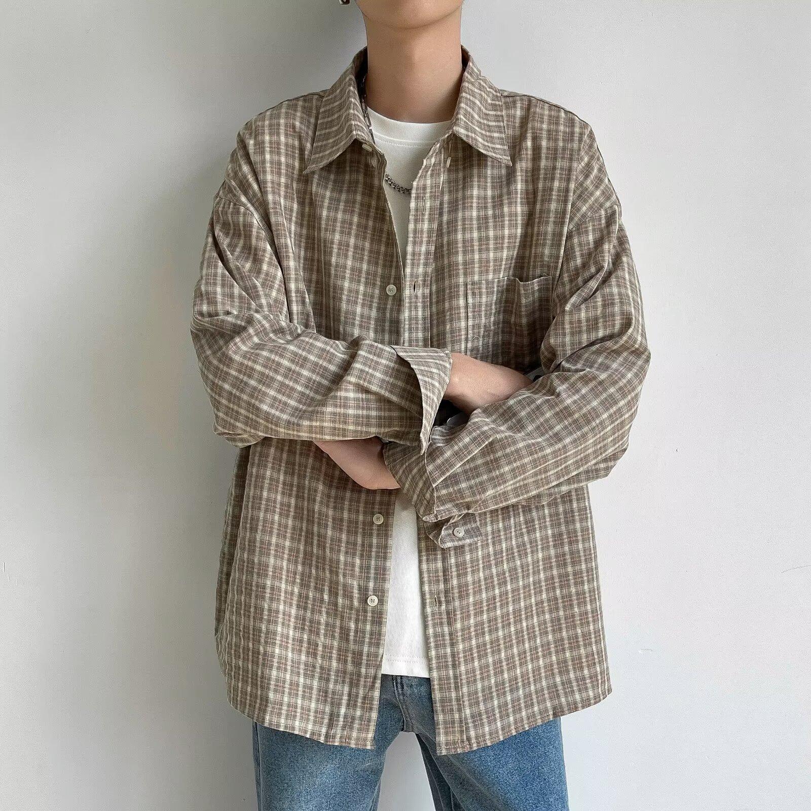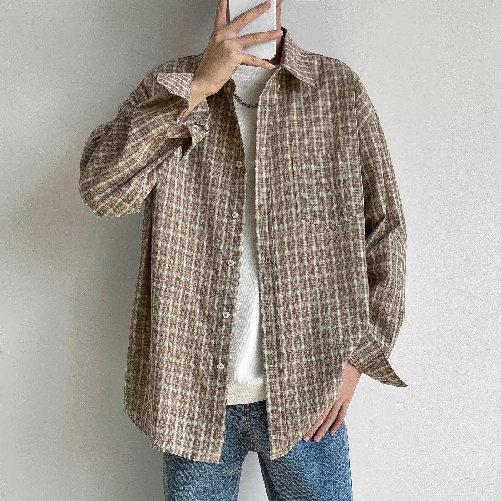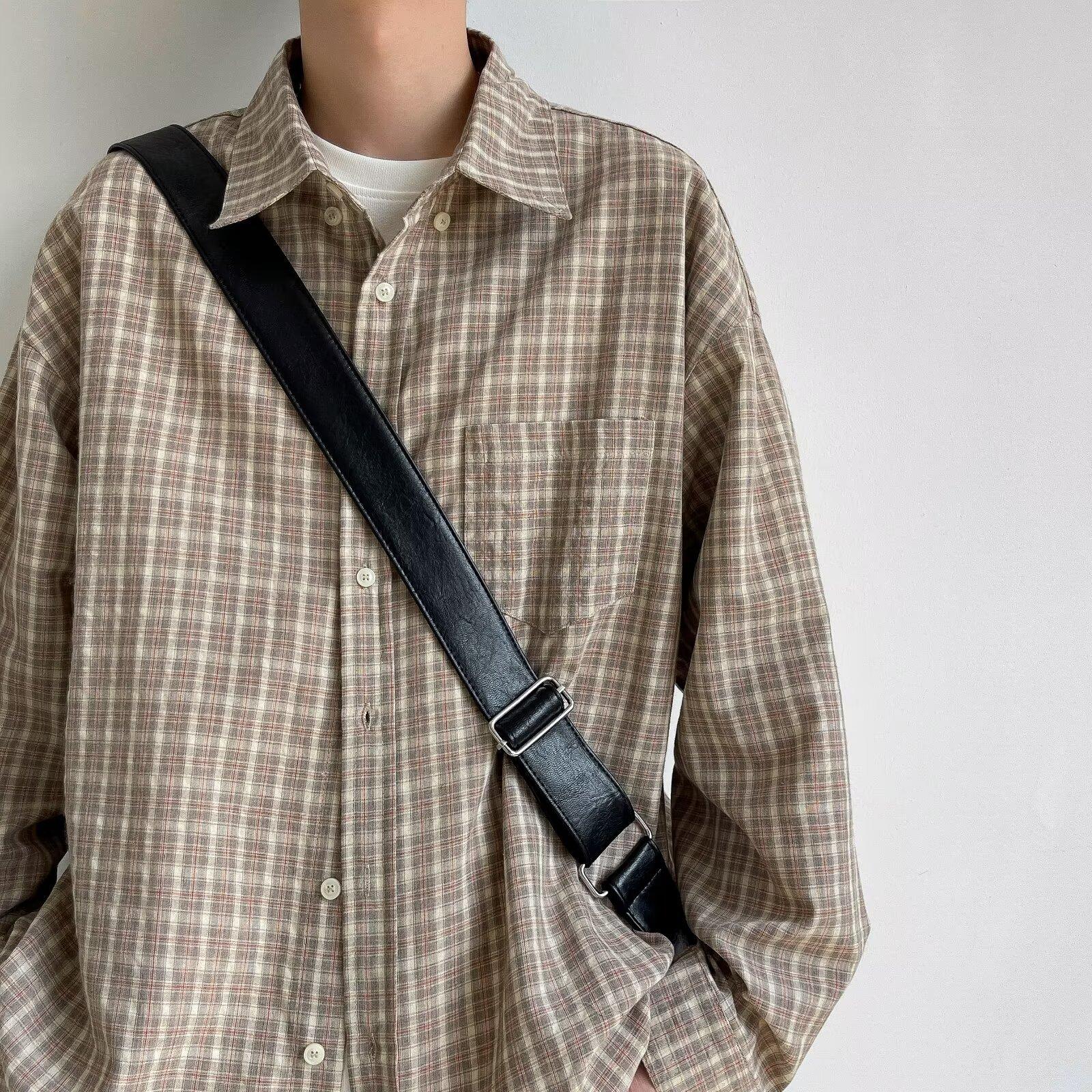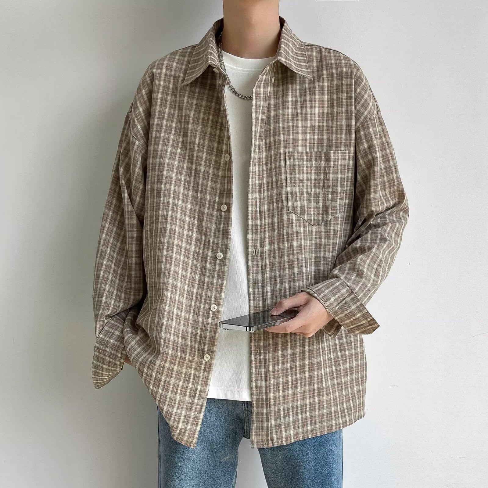 Camisa retro de estilo americano para hombre, de manga larga, para primavera y otoño, nueva marca de moda, camisa a cuadros, abrigo informal holgado con solapa para el campus.