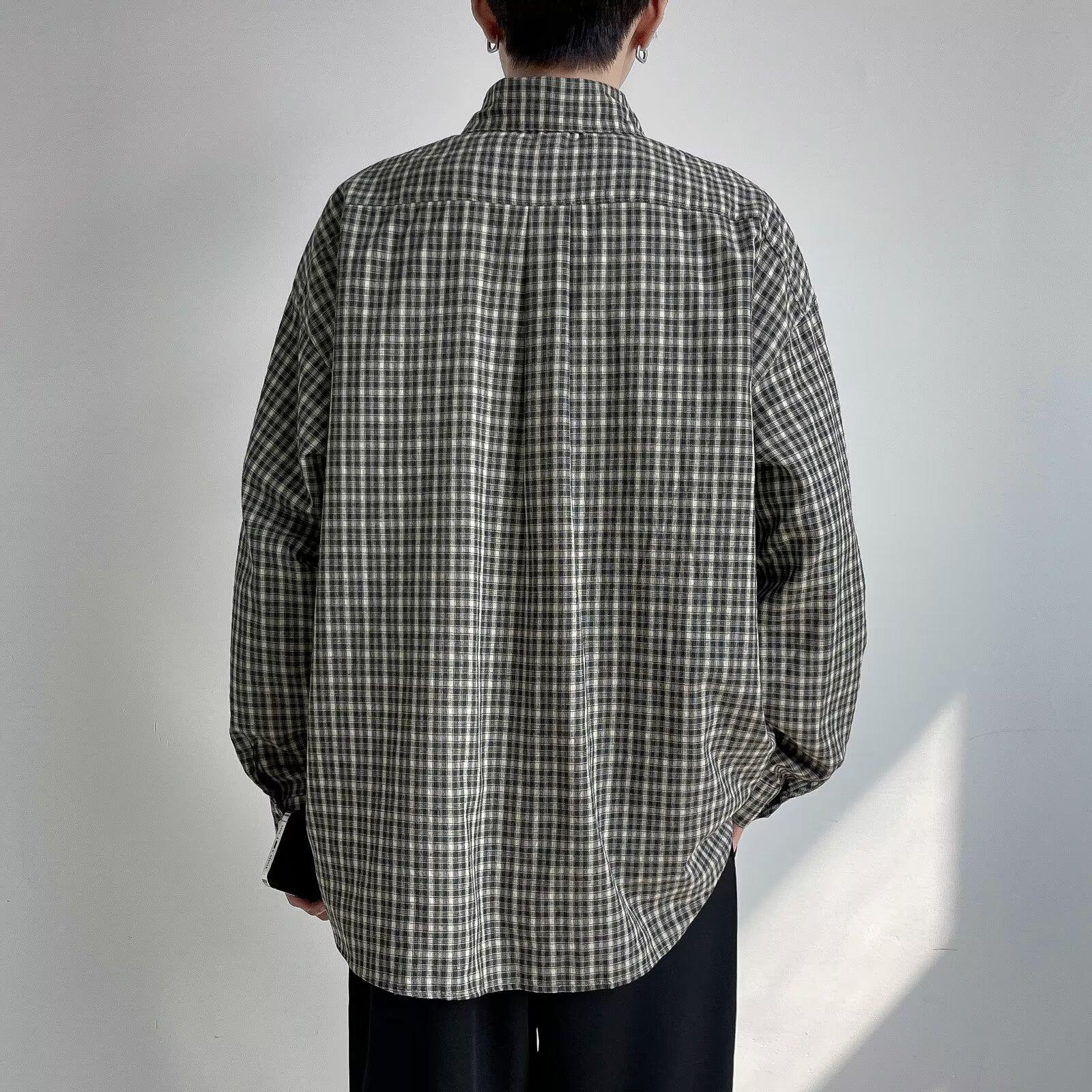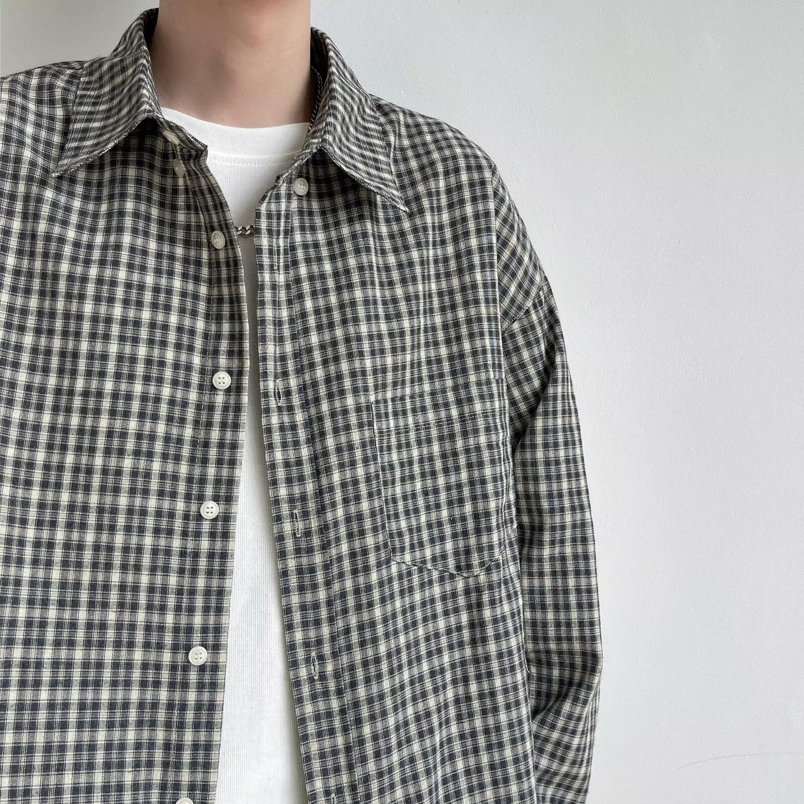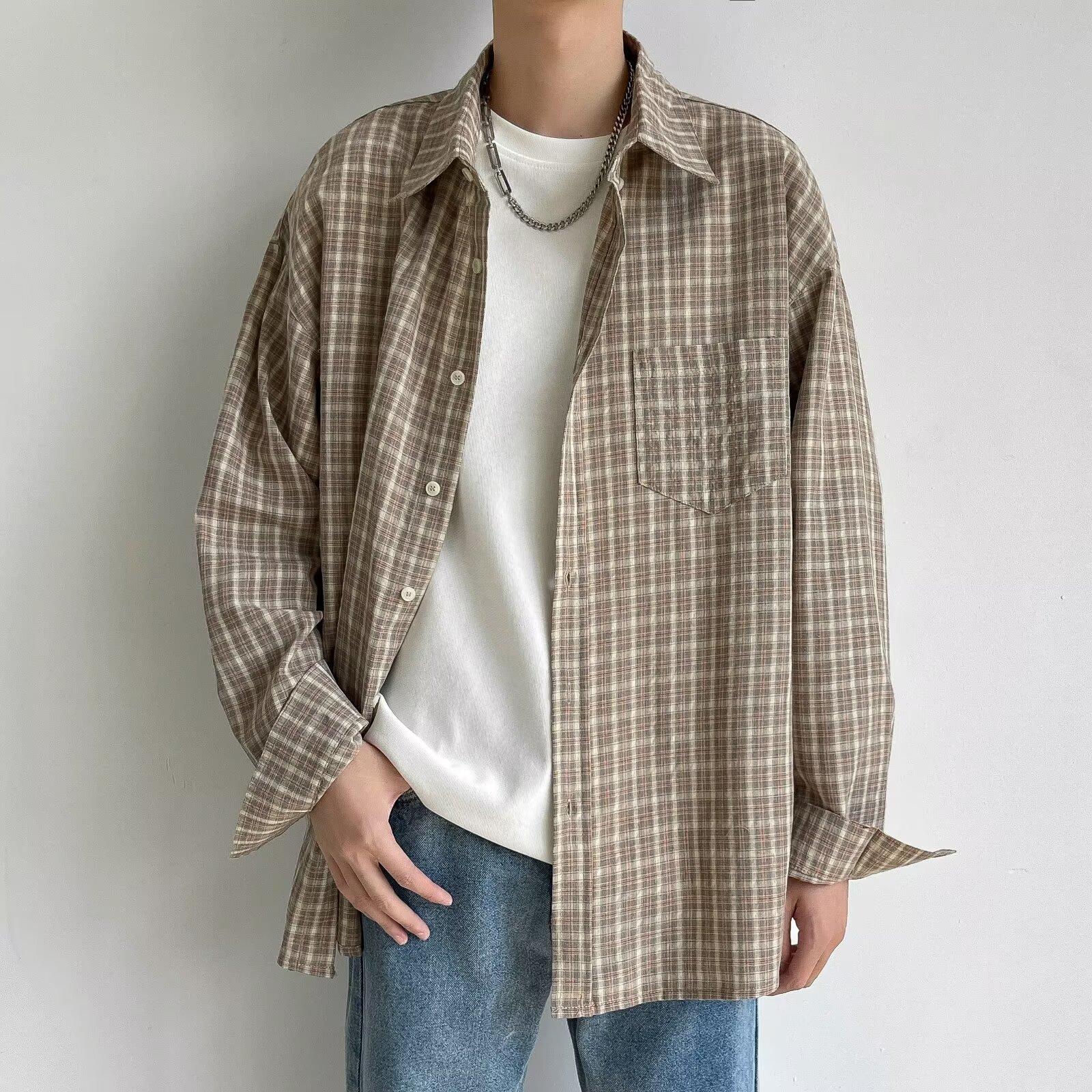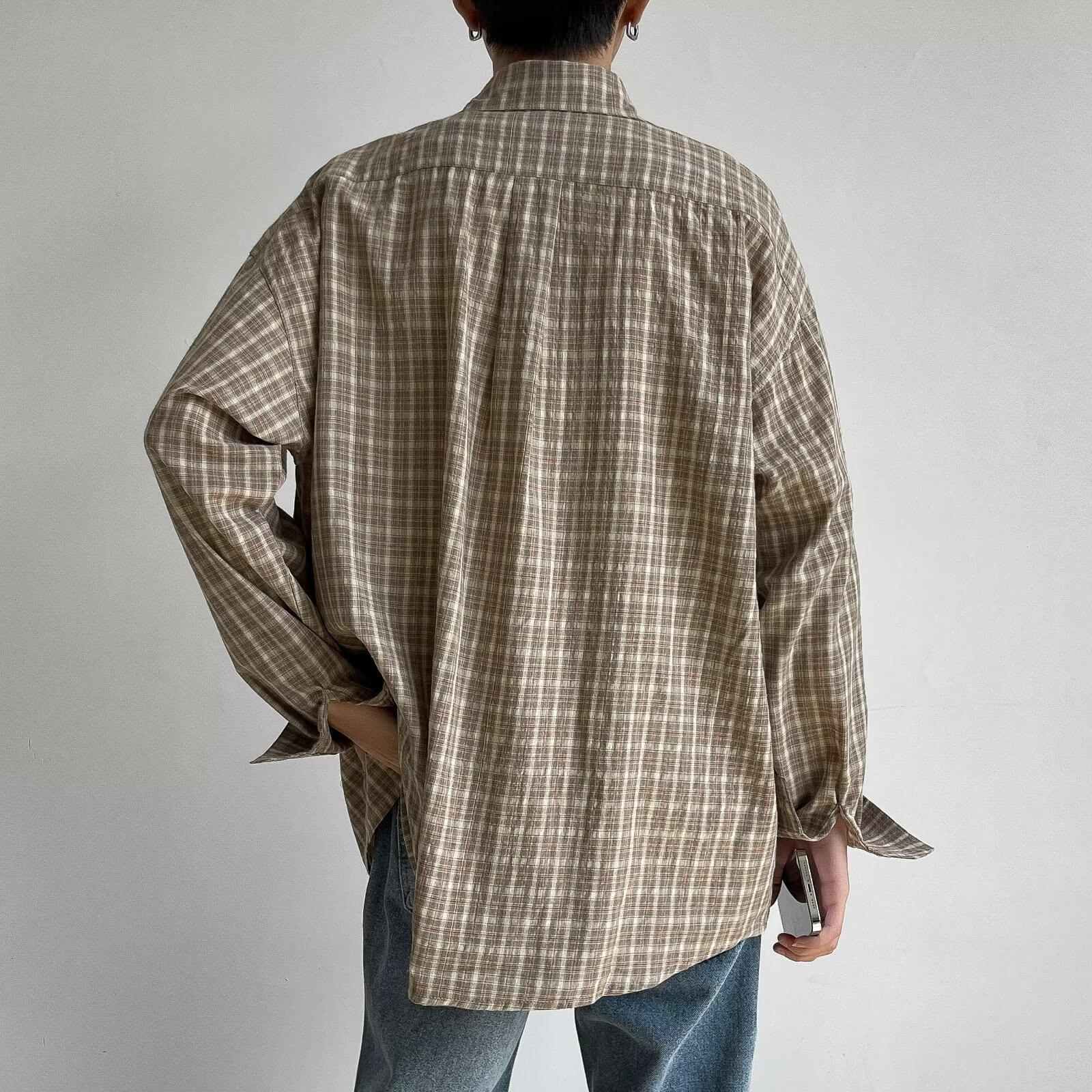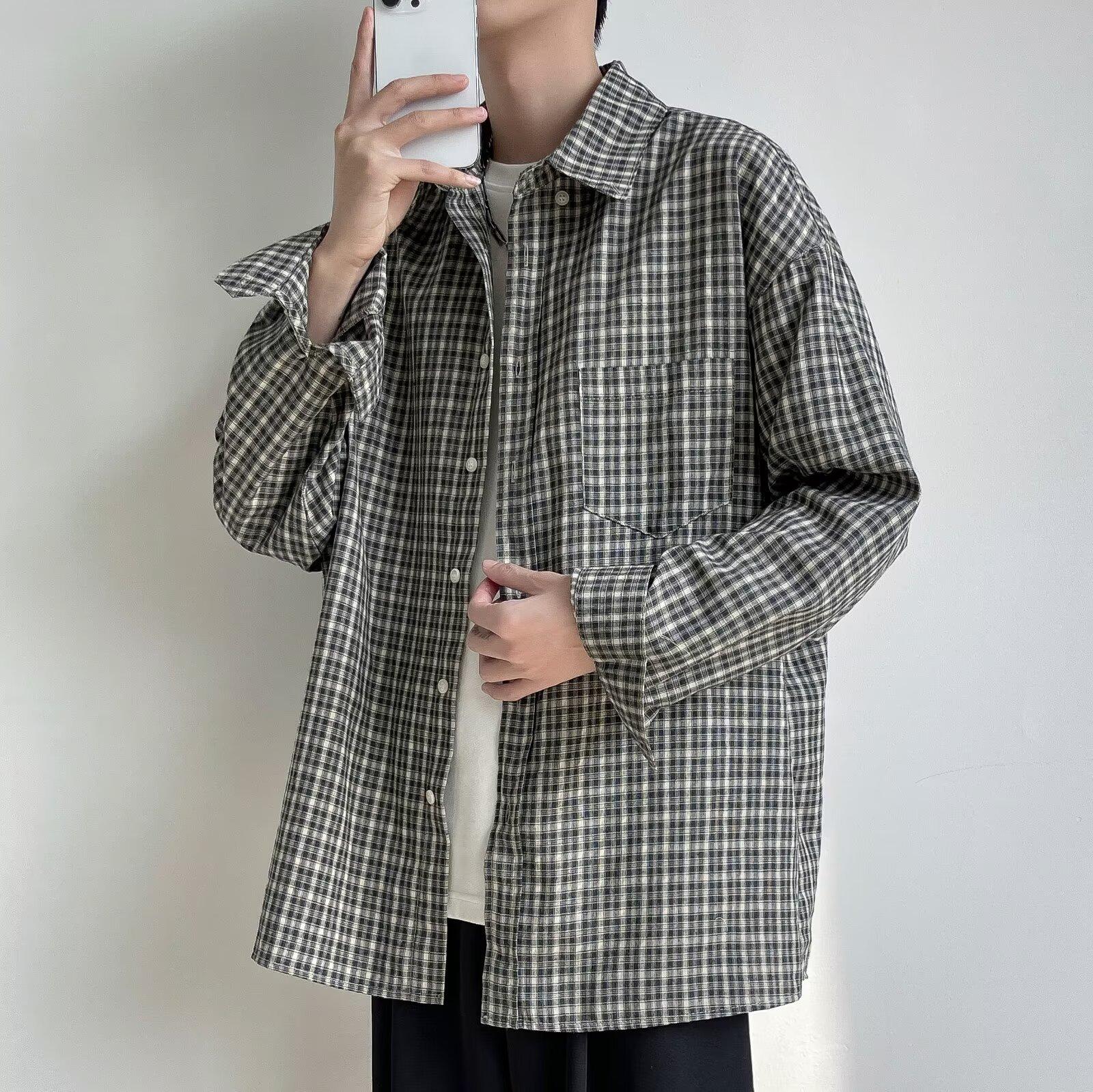 Camisa retro de estilo americano para hombre, de manga larga, para primavera y otoño, nueva marca de moda, camisa a cuadros, abrigo informal holgado con solapa para el campus.