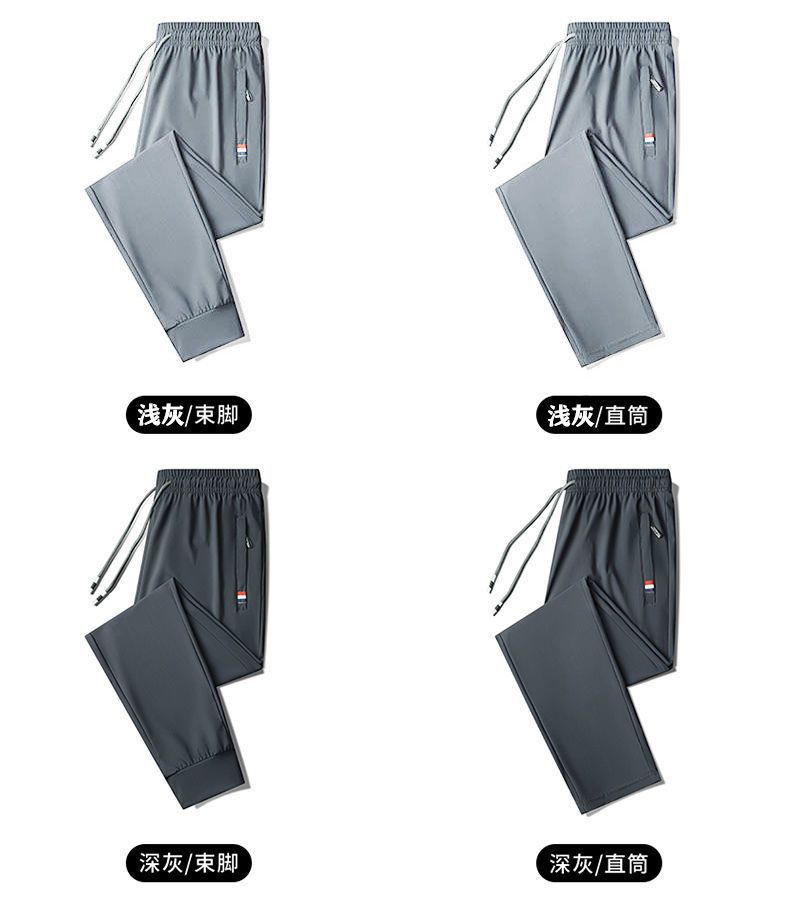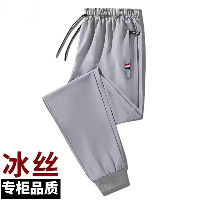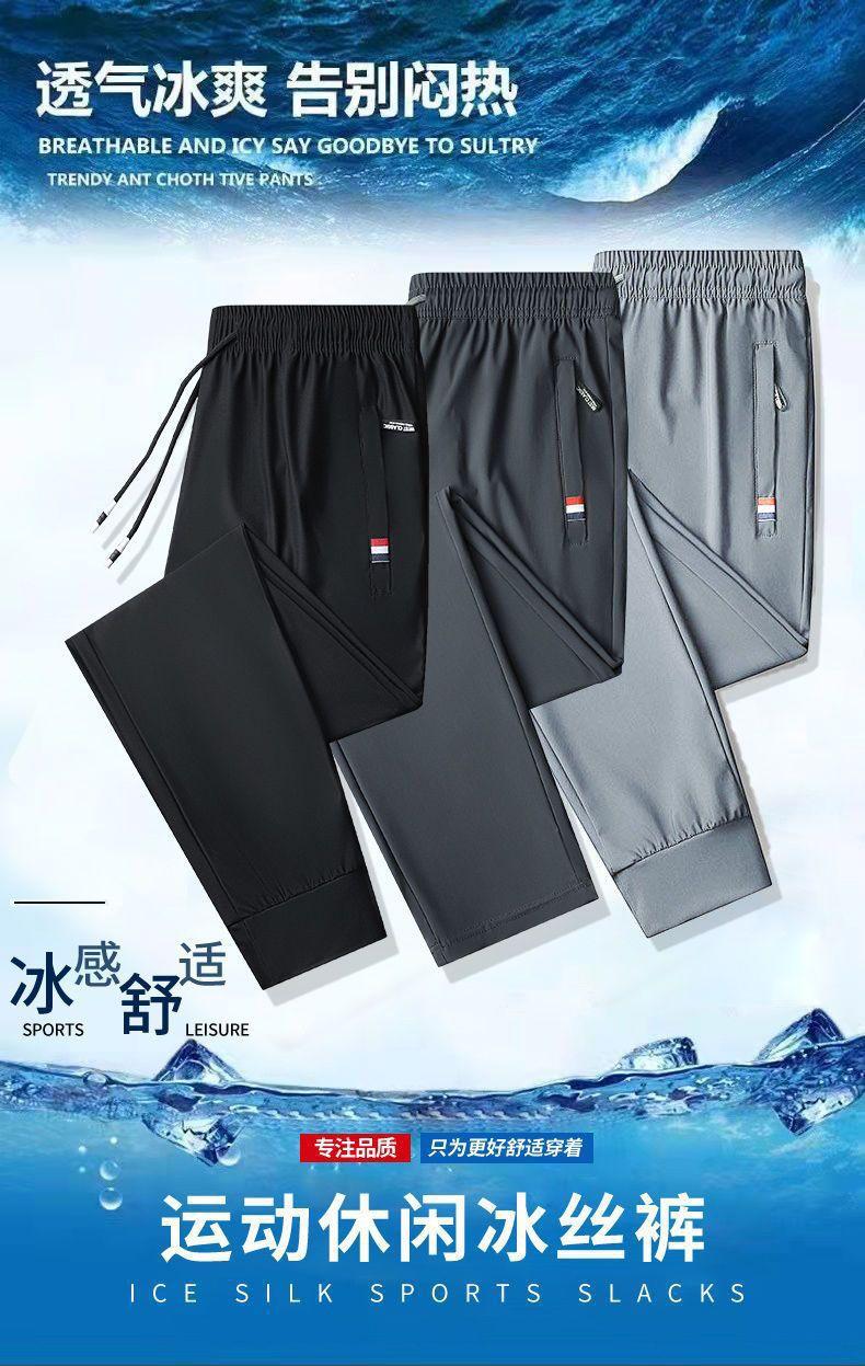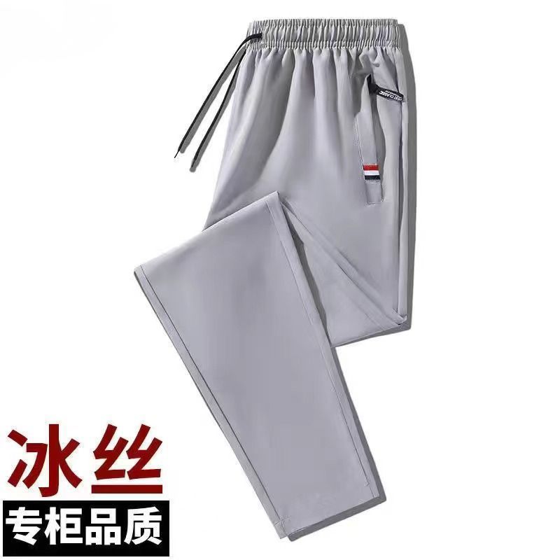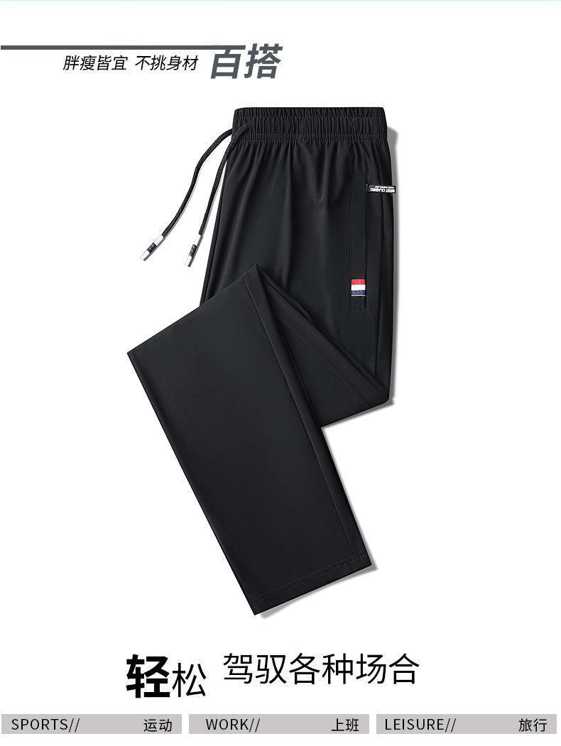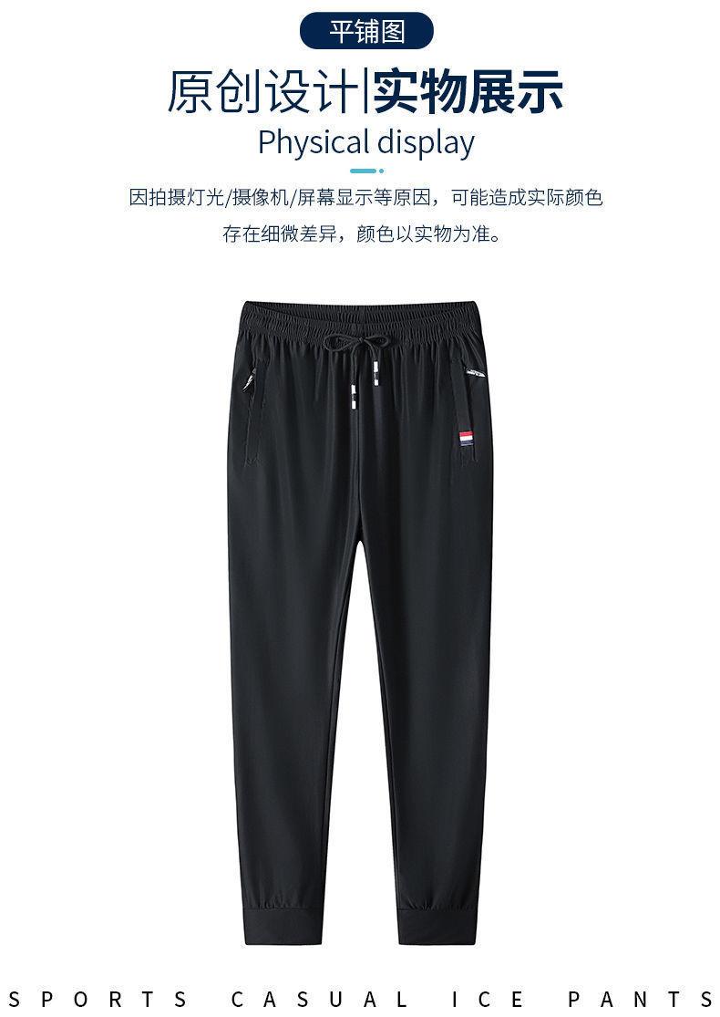 Pantalones casuales de seda de hielo al por mayor para hombre, pantalones deportivos de verano finos, rectos, sueltos, de talla grande, con puntera y bolsillo y cremallera.