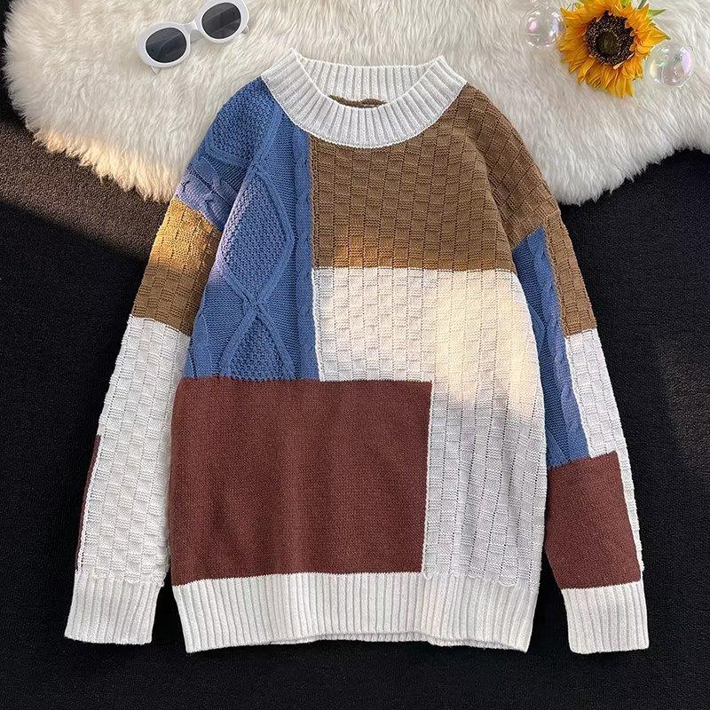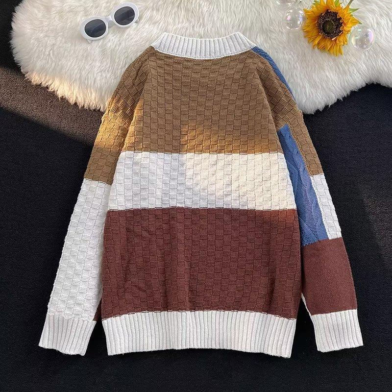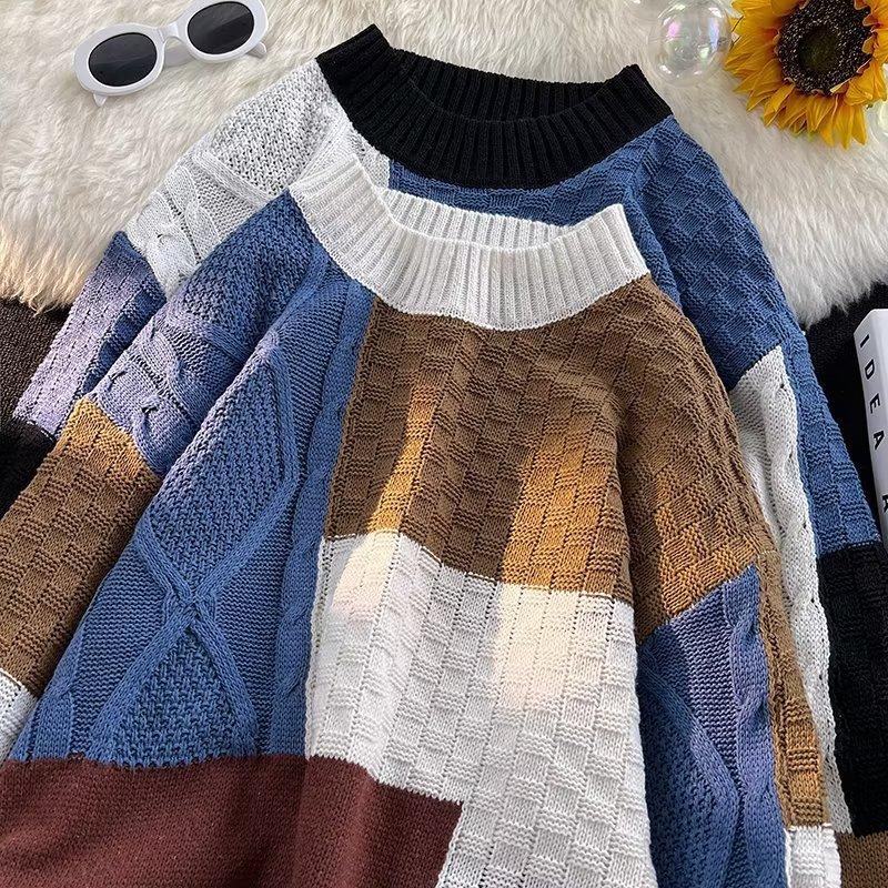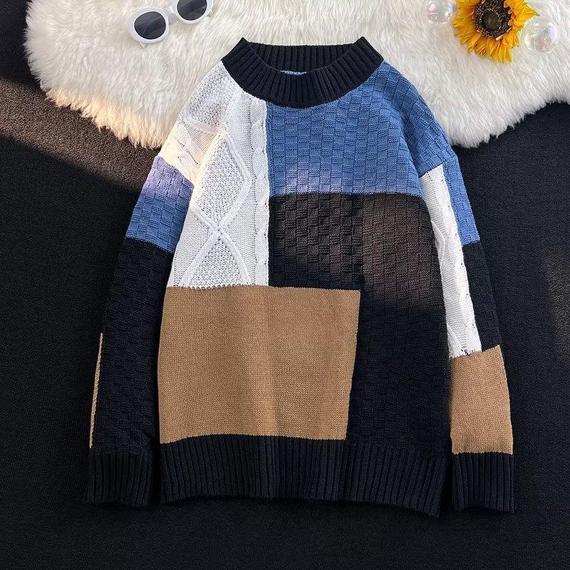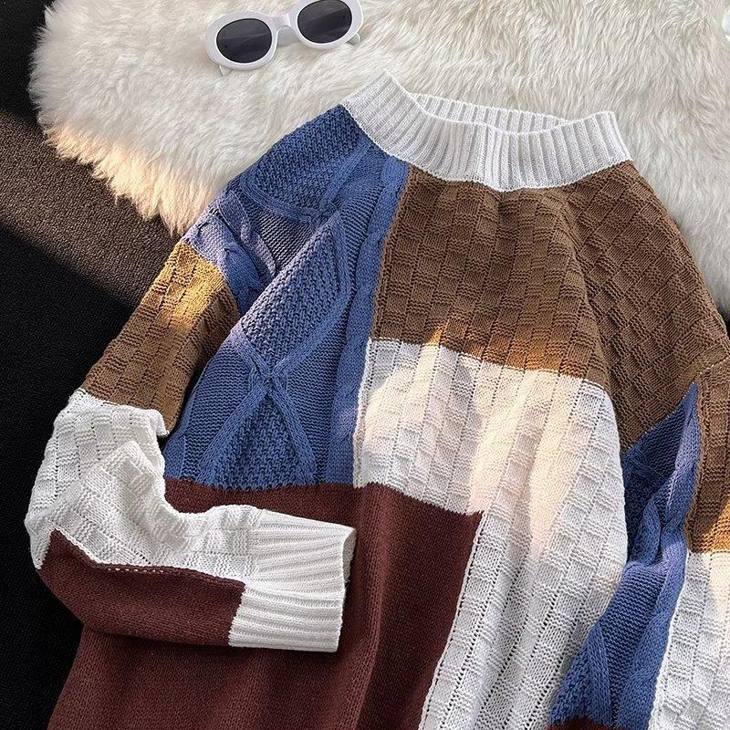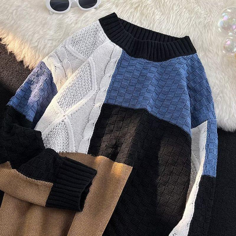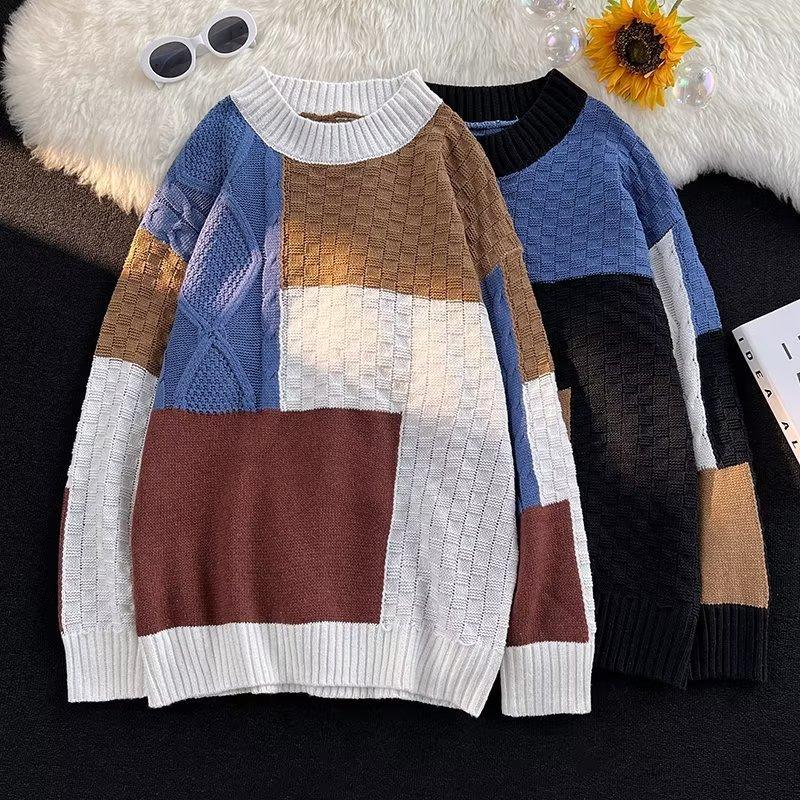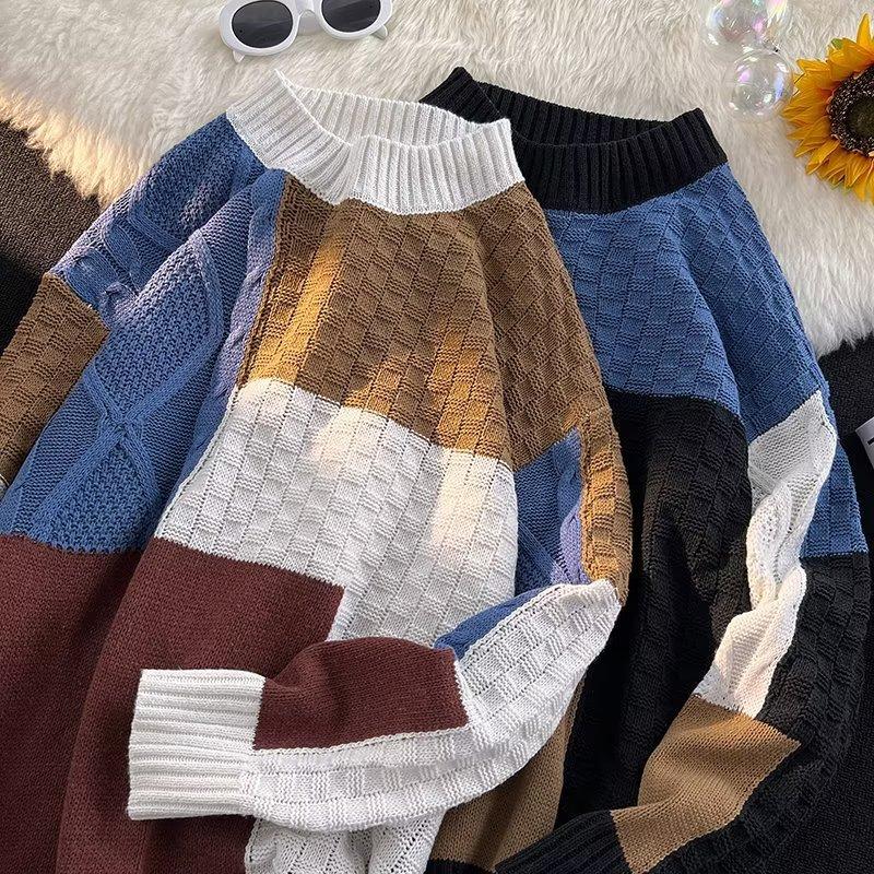Suéter de cuello alto para hombre, de moda, suelto, de otoño e invierno, tejido a mano, con costuras a juego.