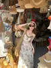 Falda floral de mariposa, estilo francés, falda lencero, estilo vacaciones de verano para mujer, vestido con cuello en V, falda ajustada a la cintura y cadera, falda larga