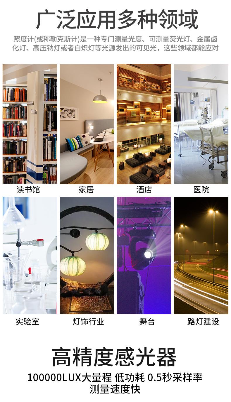 Introducción del producto: Puede medir la luz visible emitida por lámparas fluorescentes, lámparas de halogenuros metálicos, lámparas de sodio de alta presión o lámparas incandescentes. Un lux (lumen) es la iluminación recibida por una superficie con un área de 1 metro cuadrado a una distancia vertical de 1 metro de una lámpara con una intensidad luminosa de una candela. Una pie candela (FC) es la iluminación recibida por una superficie con un área de 1 pie cuadrado a una distancia vertical de 1 pie de una lámpara con una intensidad luminosa de una candela.
