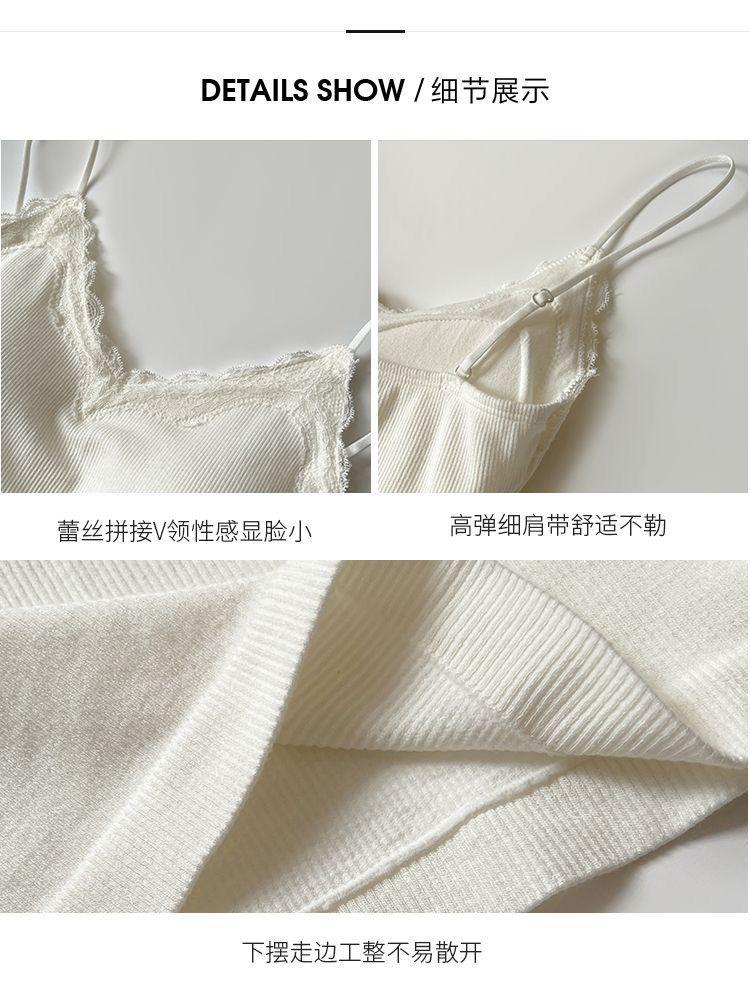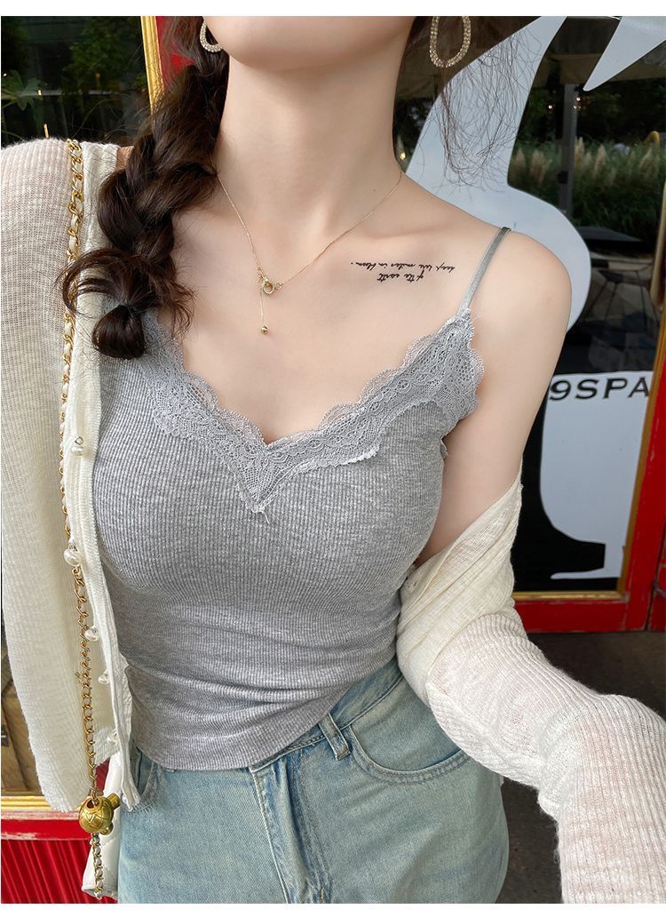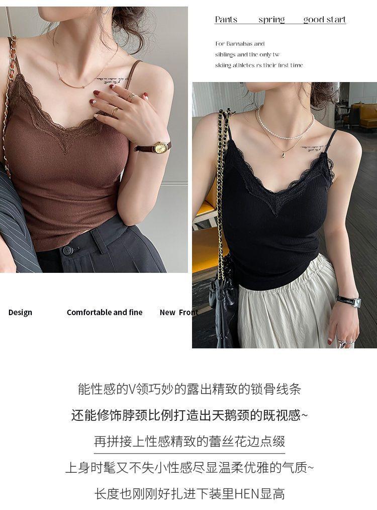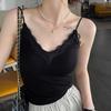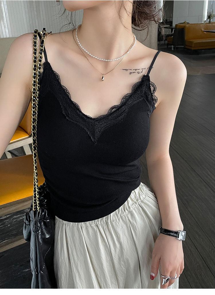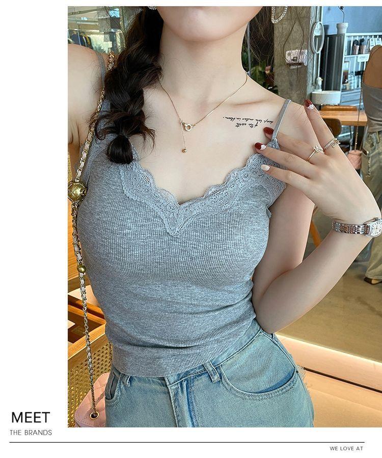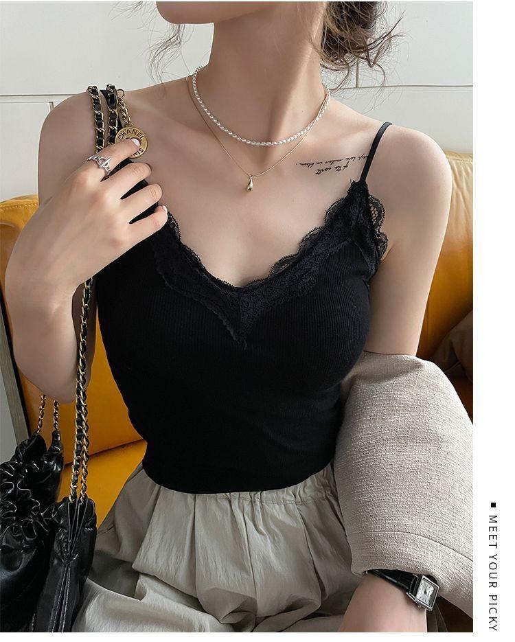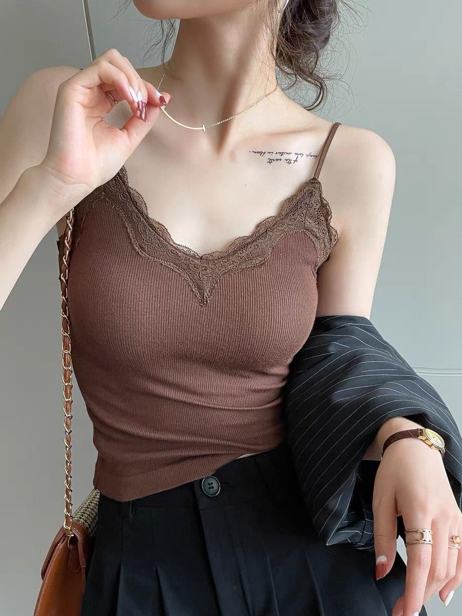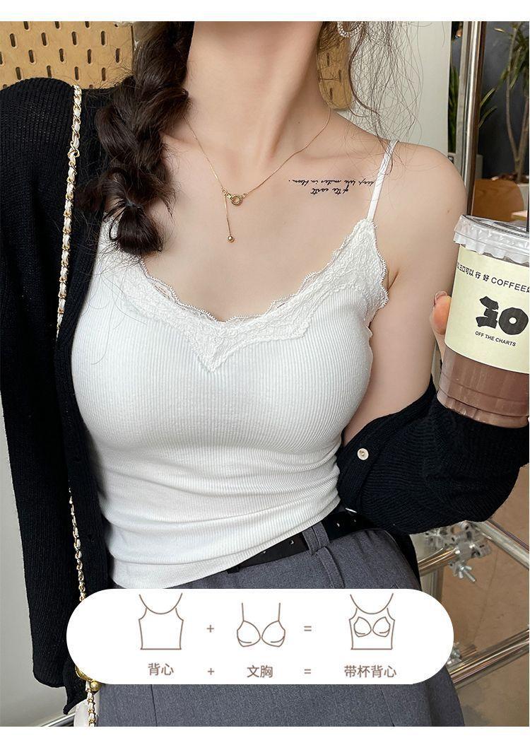 Camisola de encaje sexy, chaleco pequeño con almohadilla para el pecho, escote en V francés, espalda hermosa, prenda exterior, base ajustada ajustable para mujer