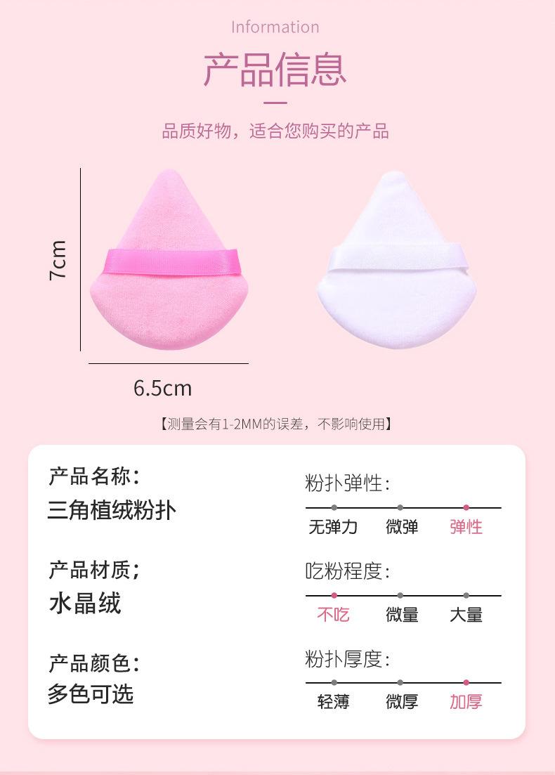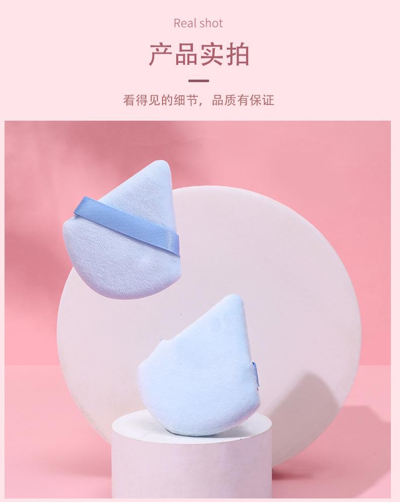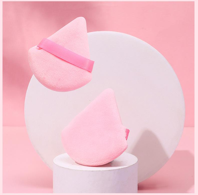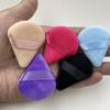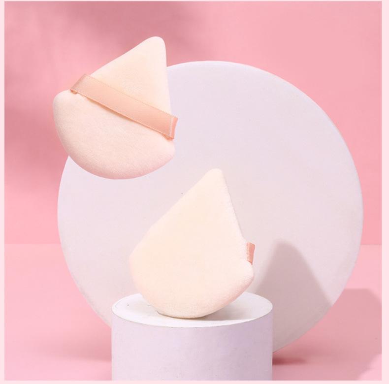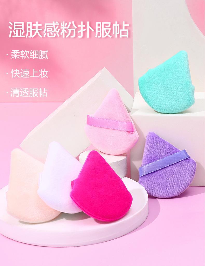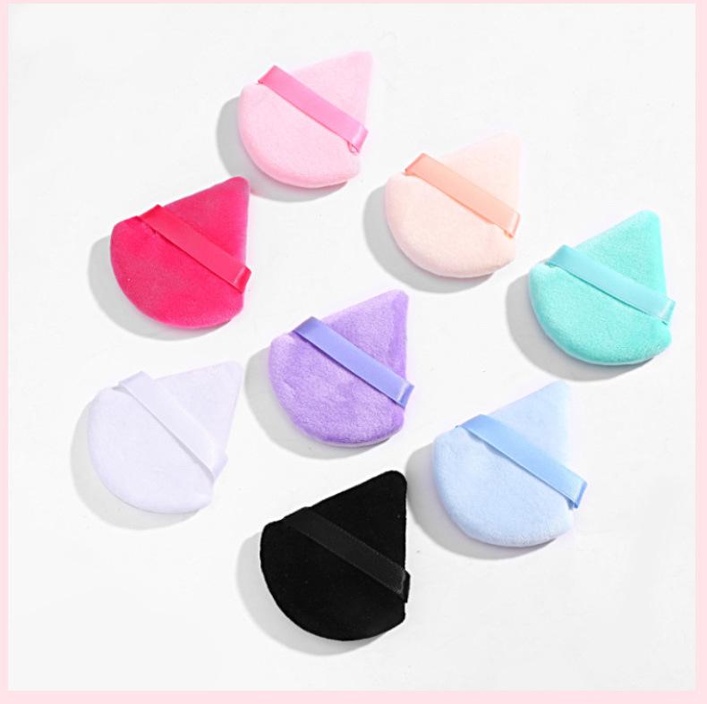 Venta al por mayor de borlas triangulares cortas de terciopelo para maquillaje de terciopelo de cristal, borlas suaves y secas para polvos, borlas de maquillaje con cojín de aire y flocado.