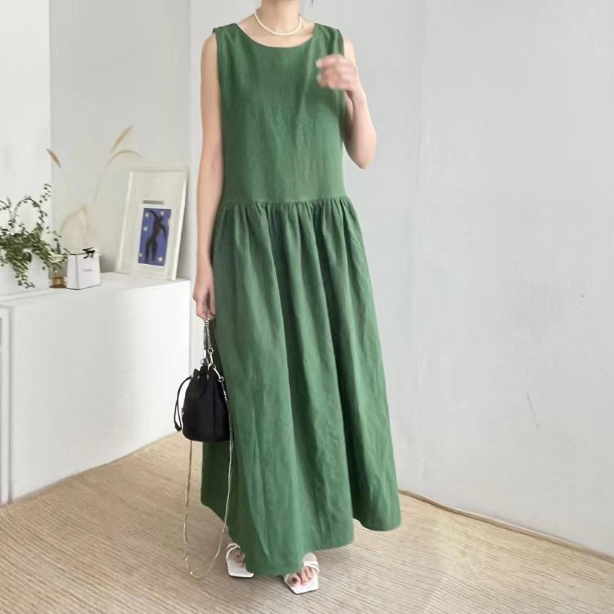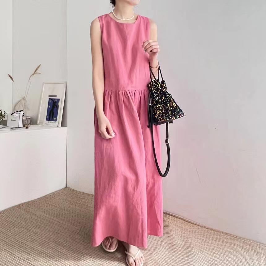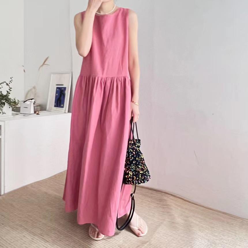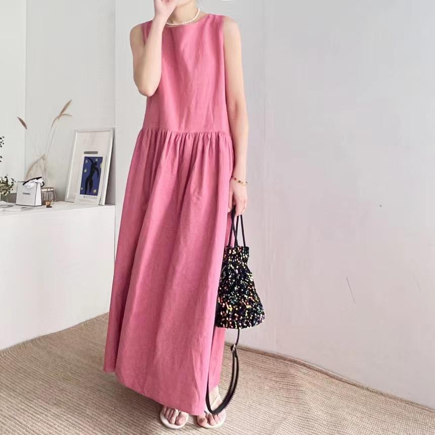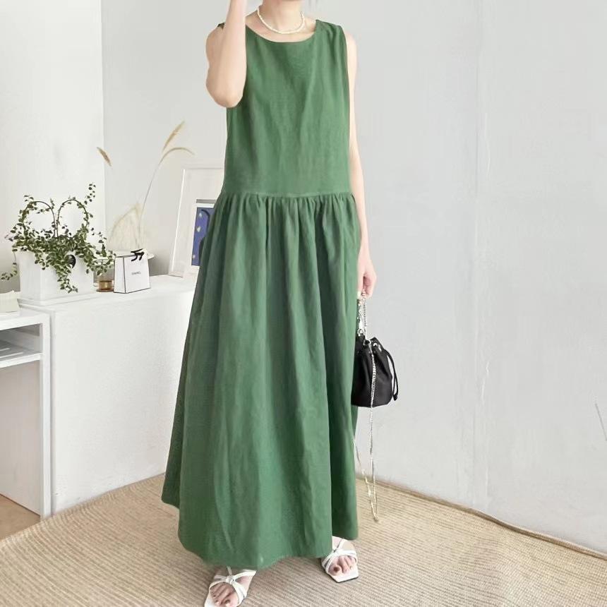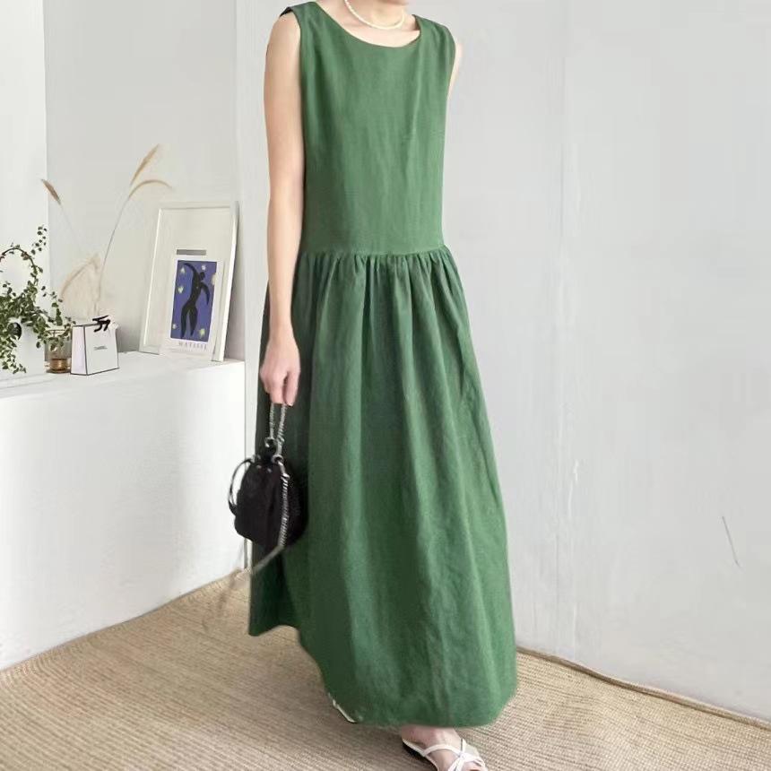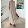 Vestido Casual de Estilo Coreano Nuevo 2025 Verano Cuello Redondo Largo sin Mangas Algodón-Lino Vestido Falda Larga