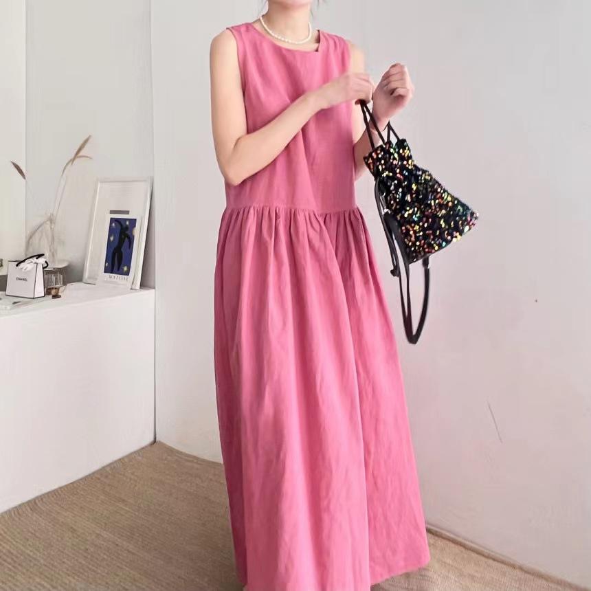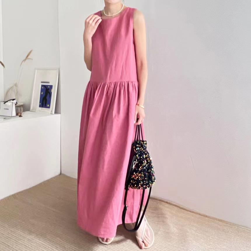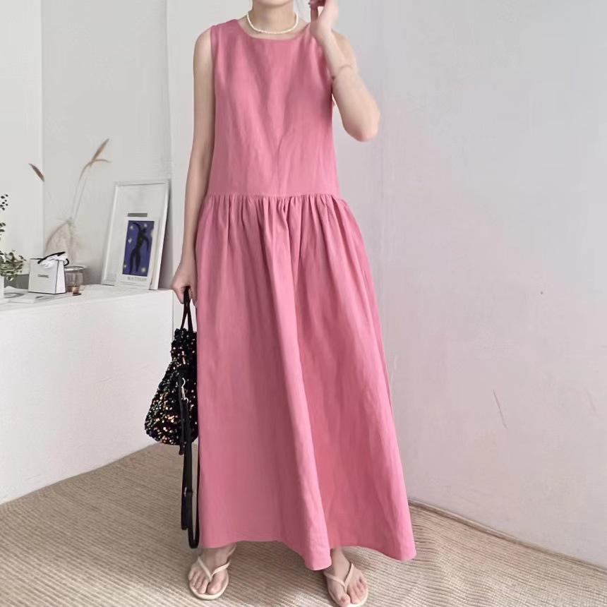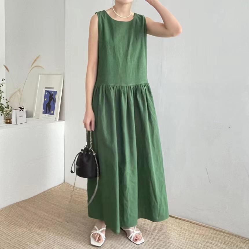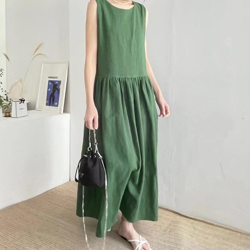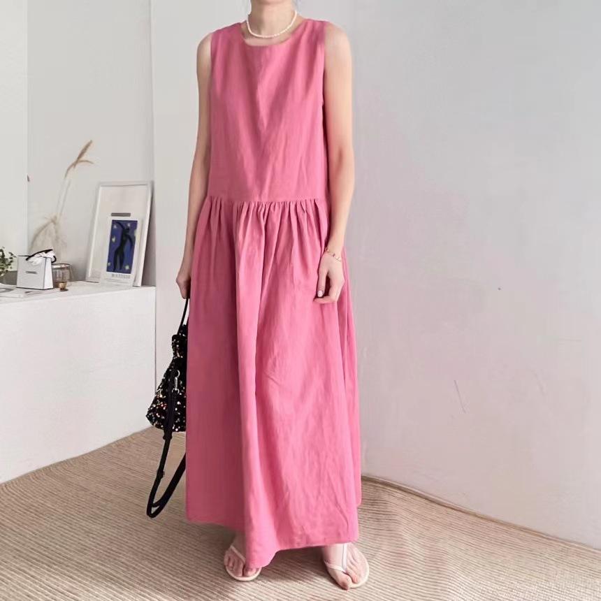 Vestido Casual de Estilo Coreano Nuevo 2025 Verano Cuello Redondo Largo sin Mangas Algodón-Lino Vestido Falda Larga