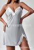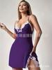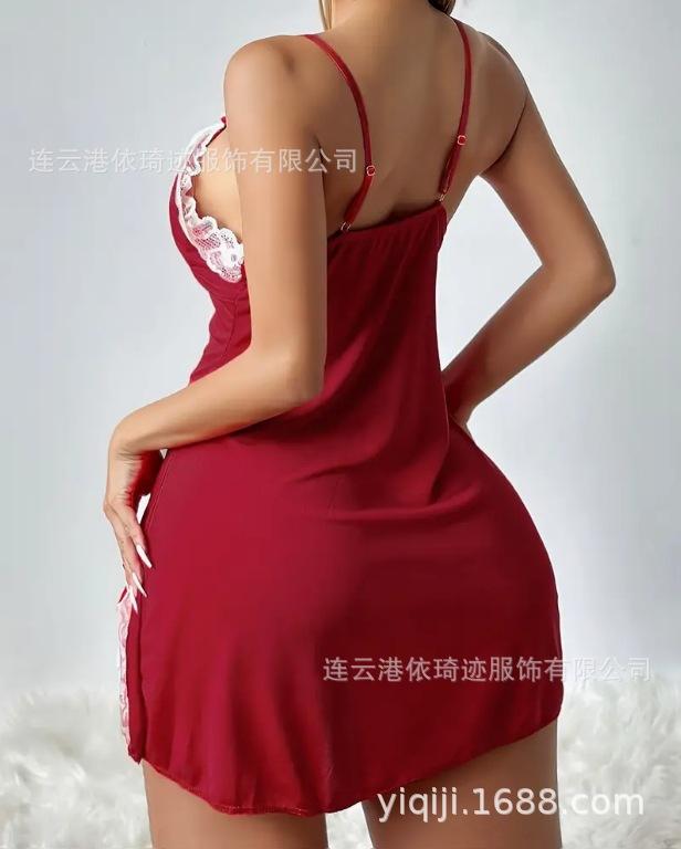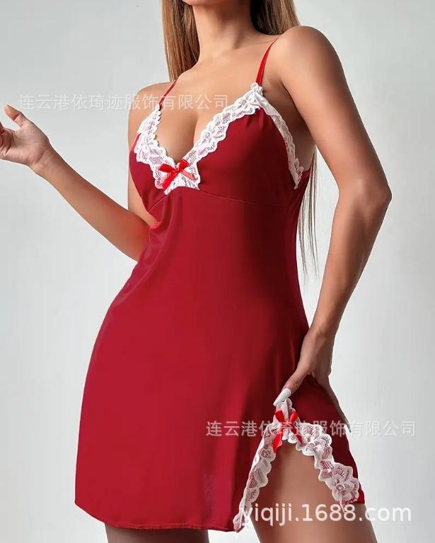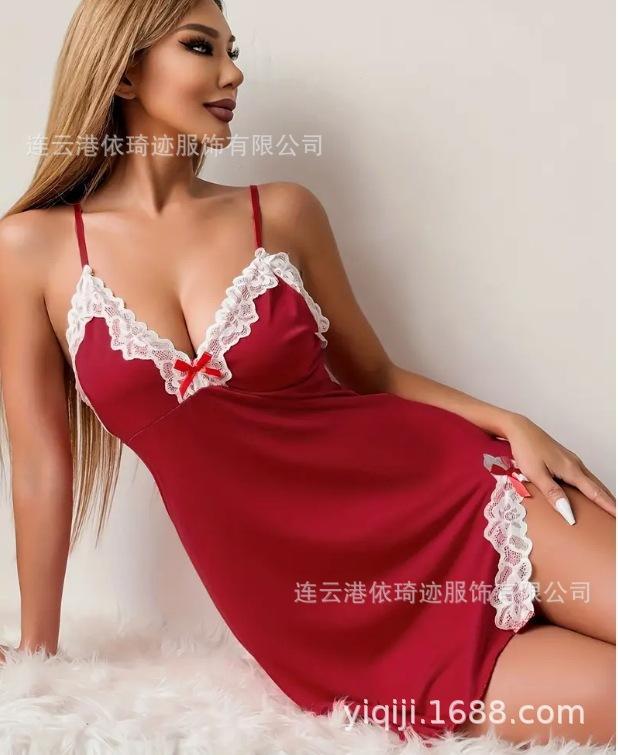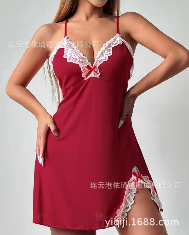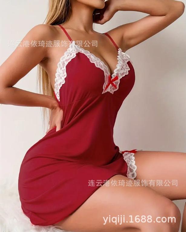 Camisón de lencería de talla grande europea y americana con escote en V profundo, lazo lateral, corte entallado y tirantes.