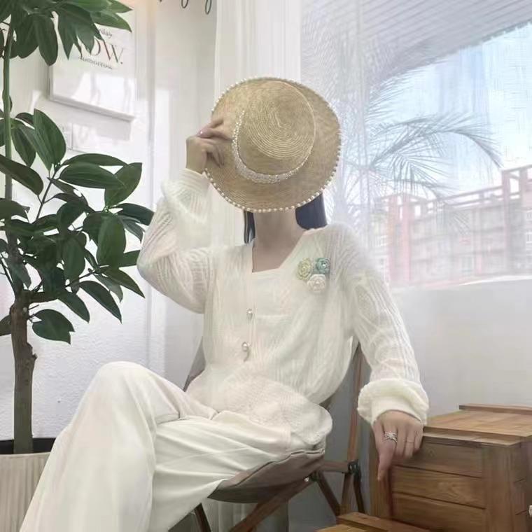 Cárdigan de punto para mujer con diseño fresco de principios de primavera, sentido de la cintura, flor tridimensional hueca, delgado, que reduce la edad, estilo suave.