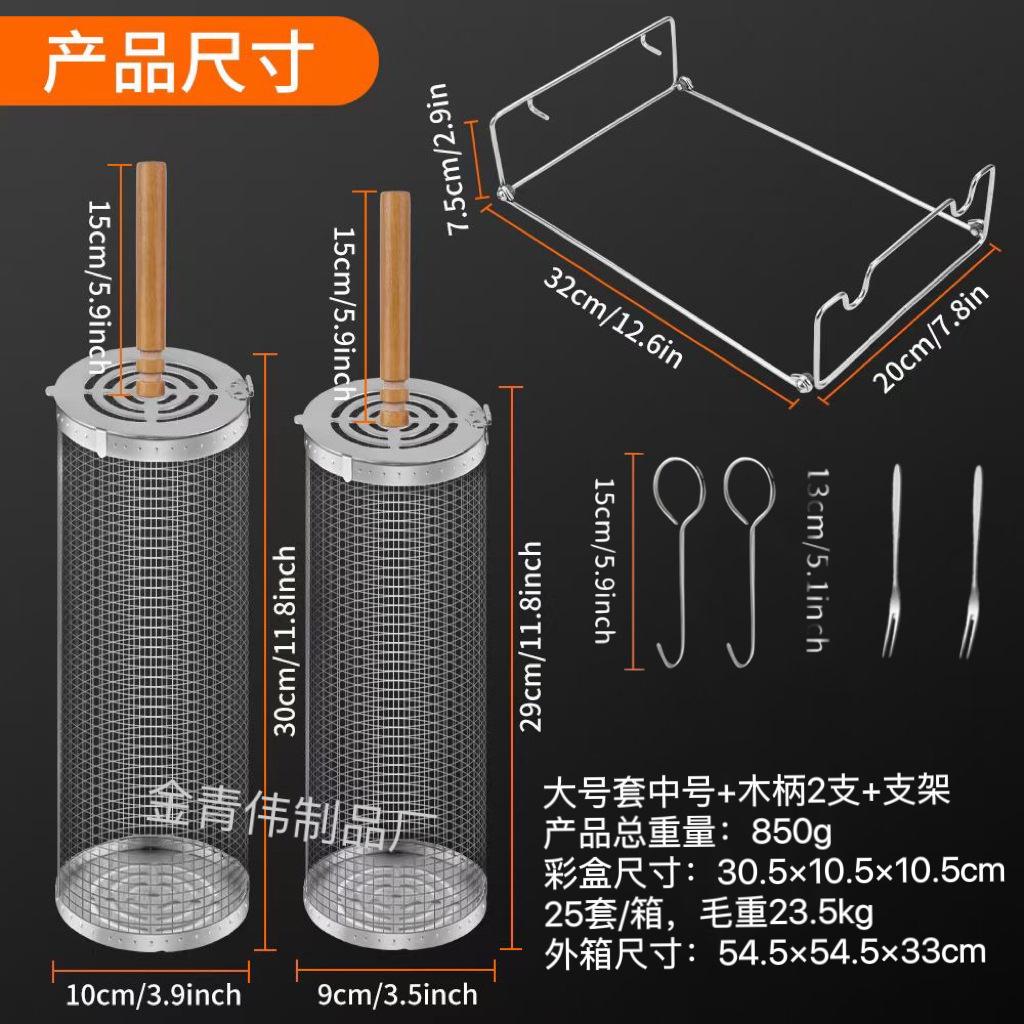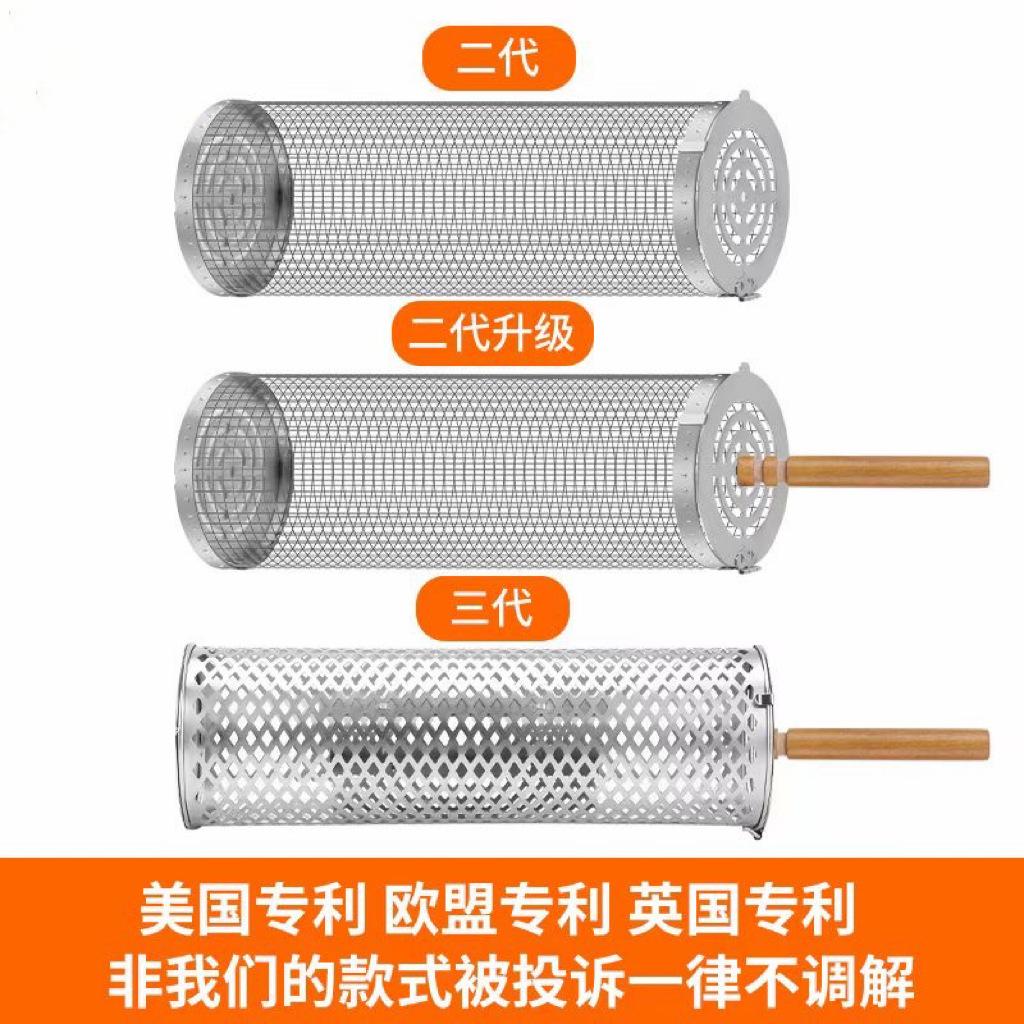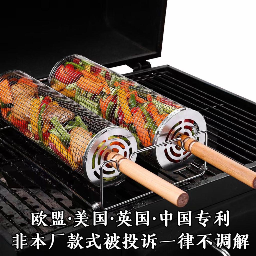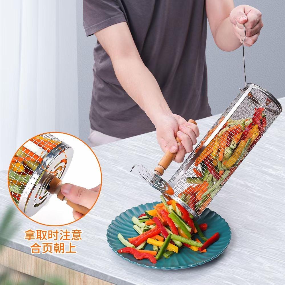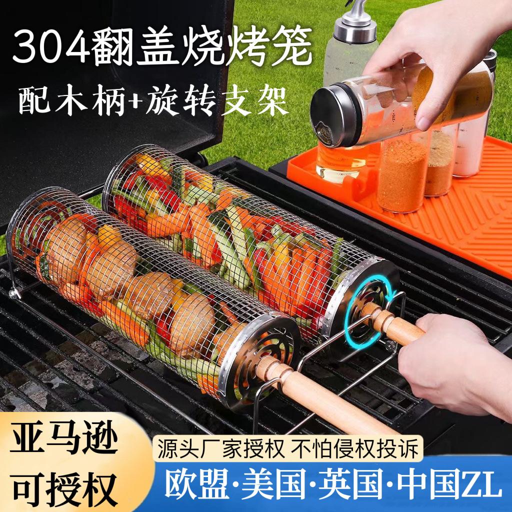 Jaula rodante para barbacoa transfronteriza, cesta para barbacoa BBQ de acero inoxidable 304 con mango de madera, barril giratorio para barbacoa, Amazon no infractor