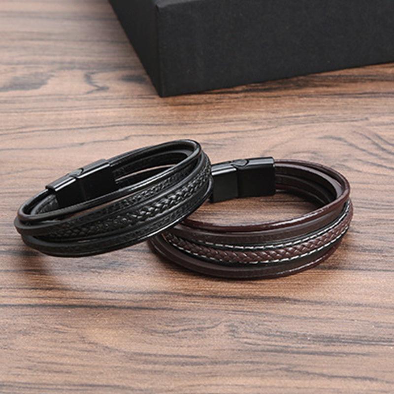 Pulsera tejida con cuerda de cuero personalizada multicapa de acero inoxidable trenzado transfronterizo europeo y americano para hombres, pulsera retro magnética de aleación