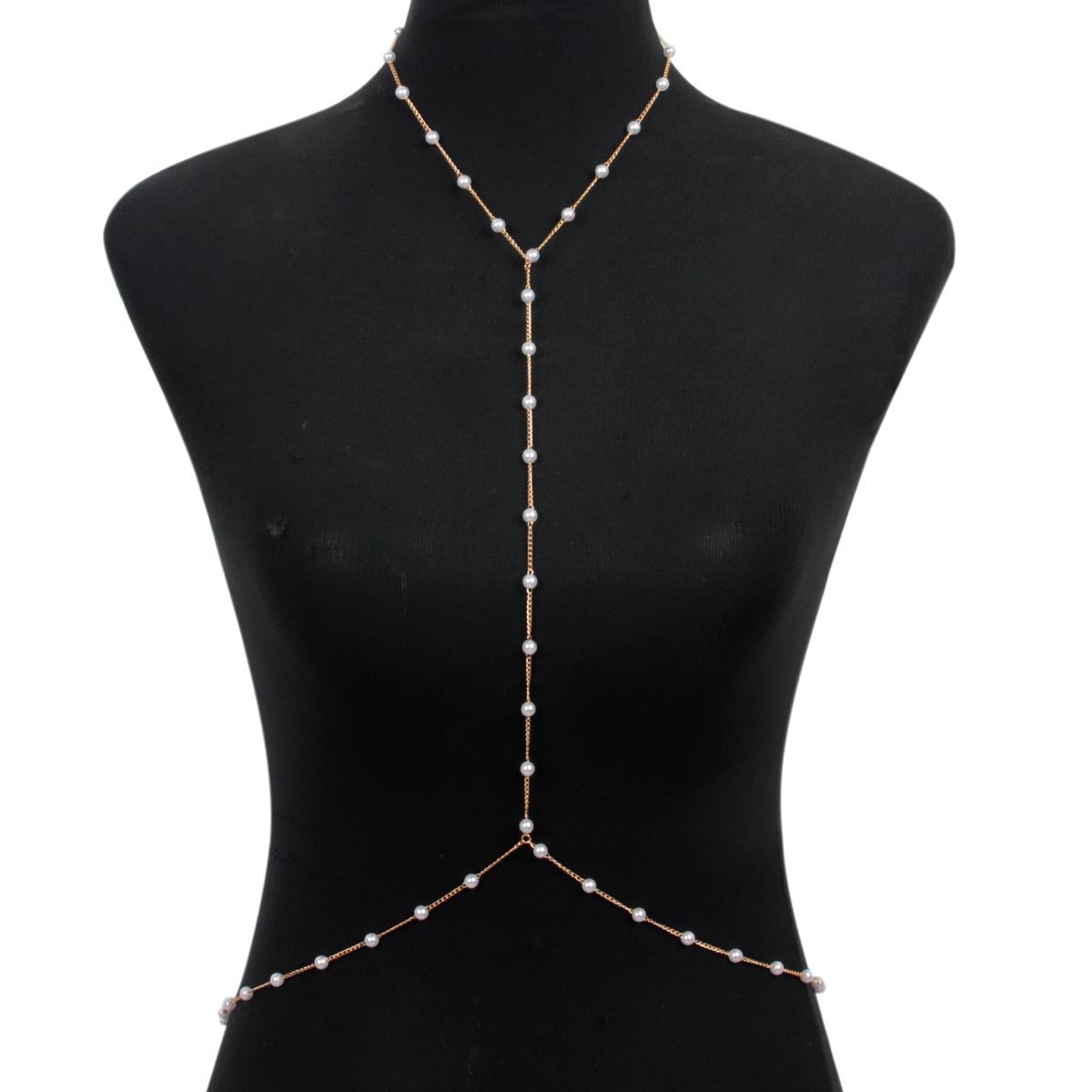 Accesorios transfronterizos europeos y americanos, moda de bikini de playa, cadena de cintura halter, cadena de pecho, cadena de perlas de imitación, cadena corporal sexy