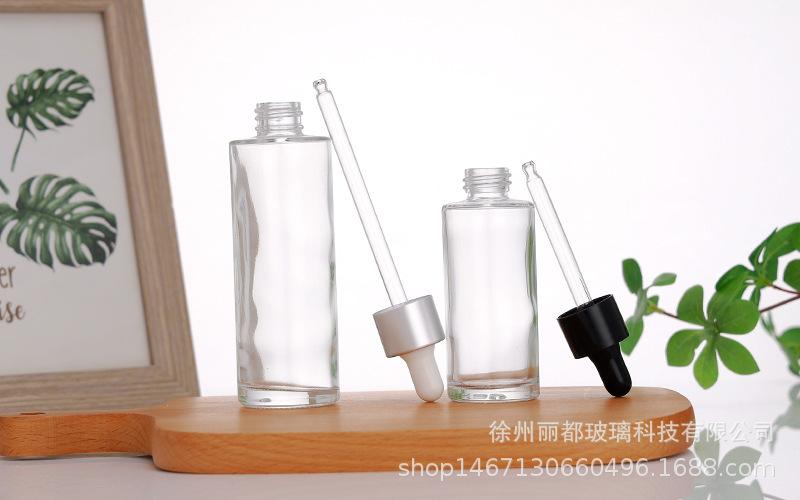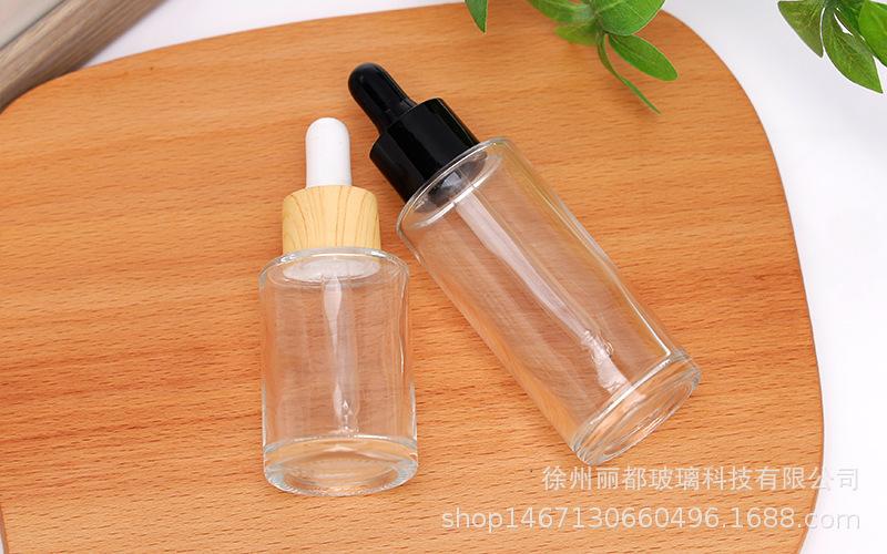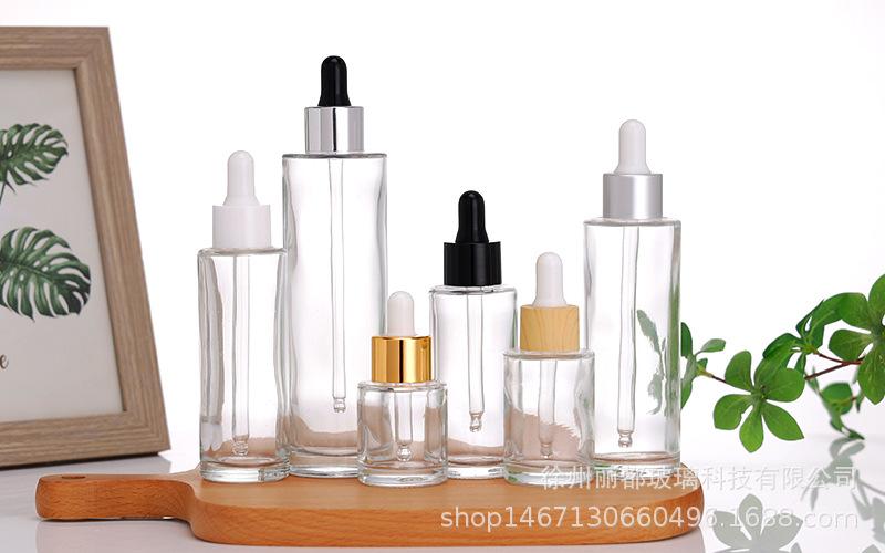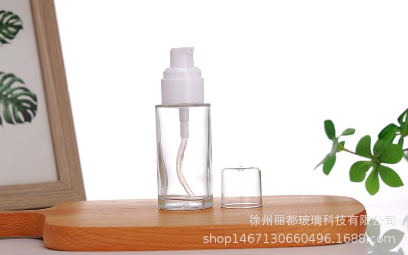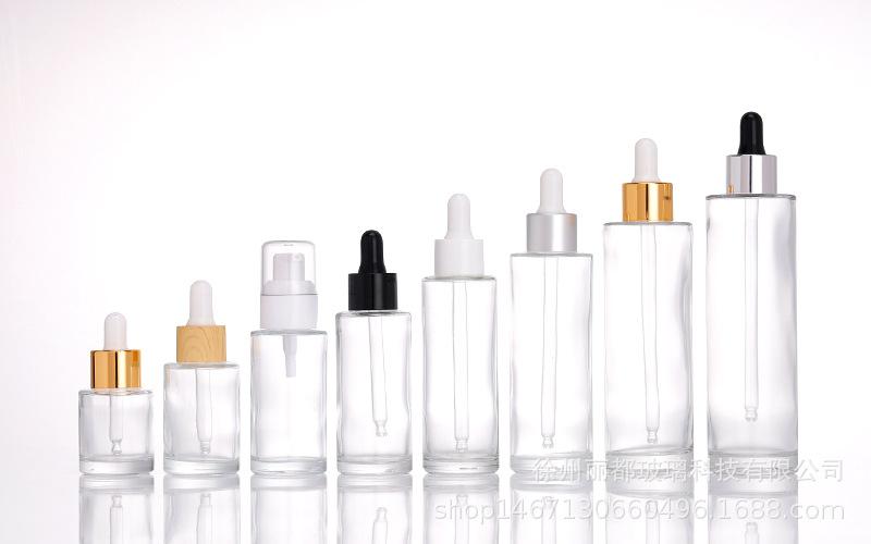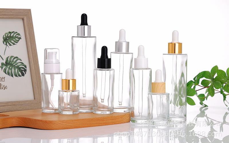 Suministro puntual de botella de spray de vidrio transparente, prensa de botella de spray, botella de emulsión esmerilada, gotero de cabeza de goma, subenvasado de cosméticos