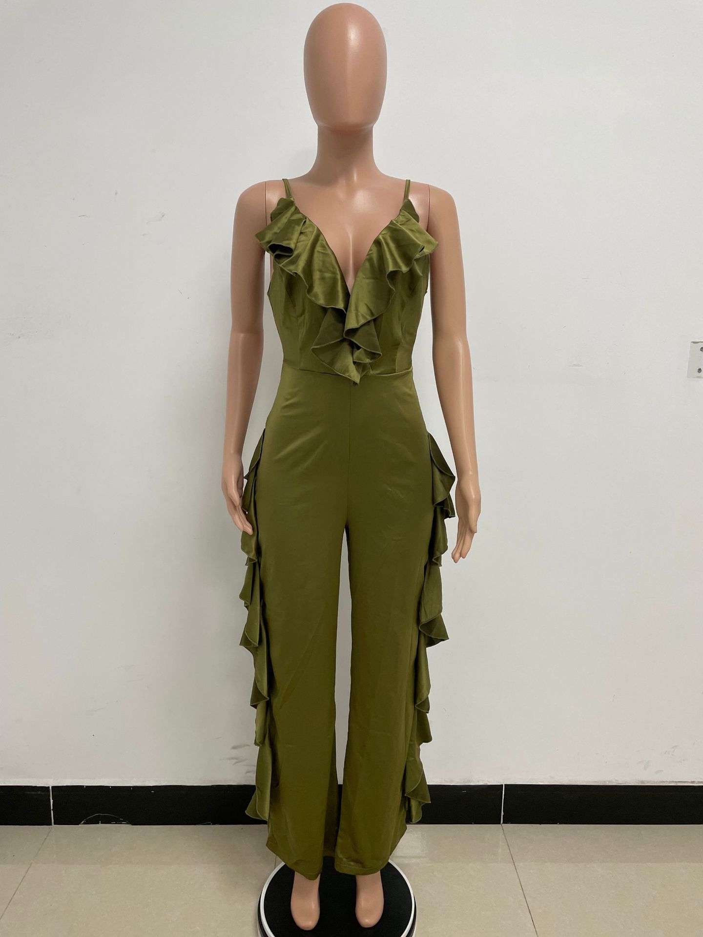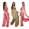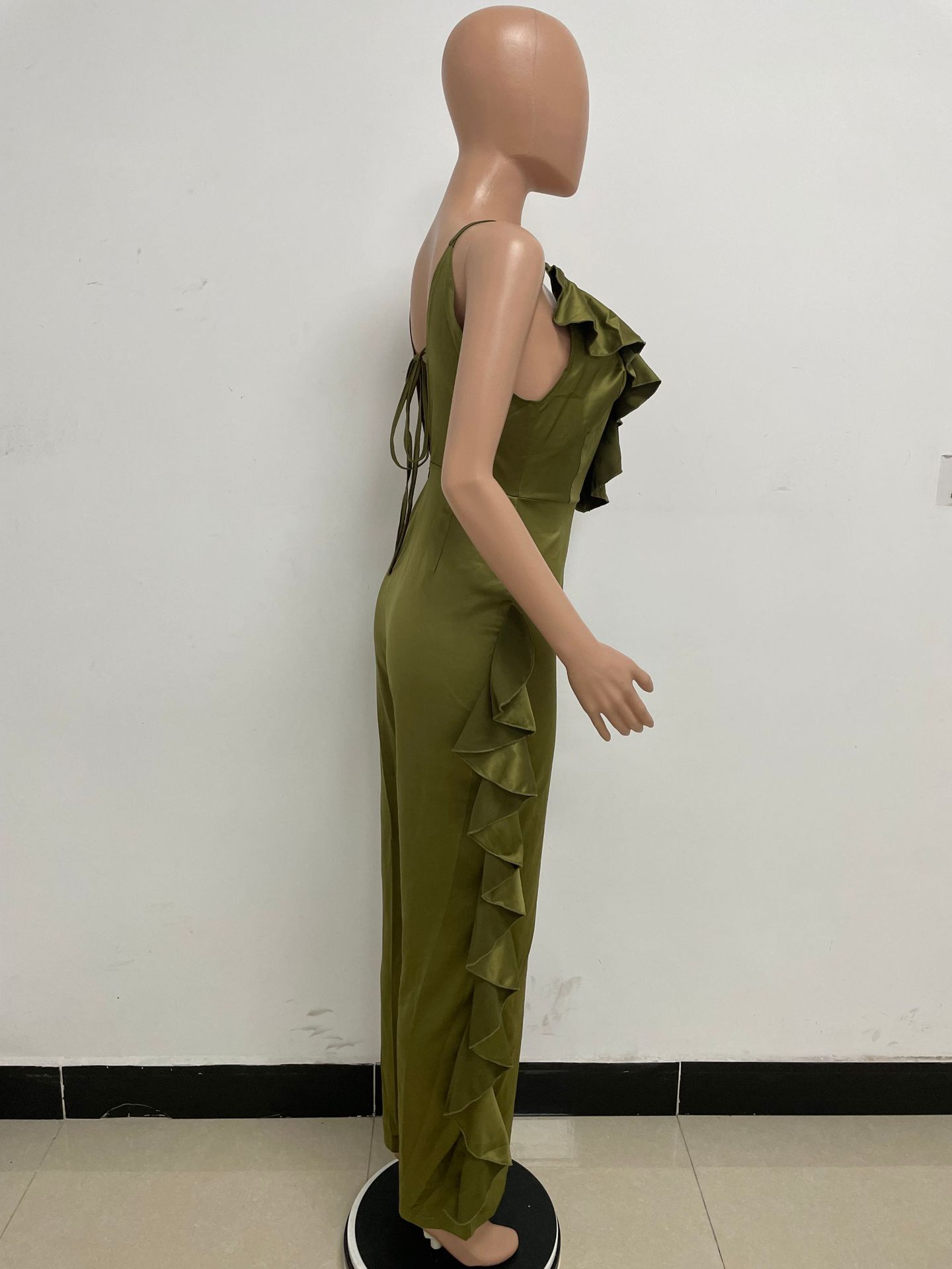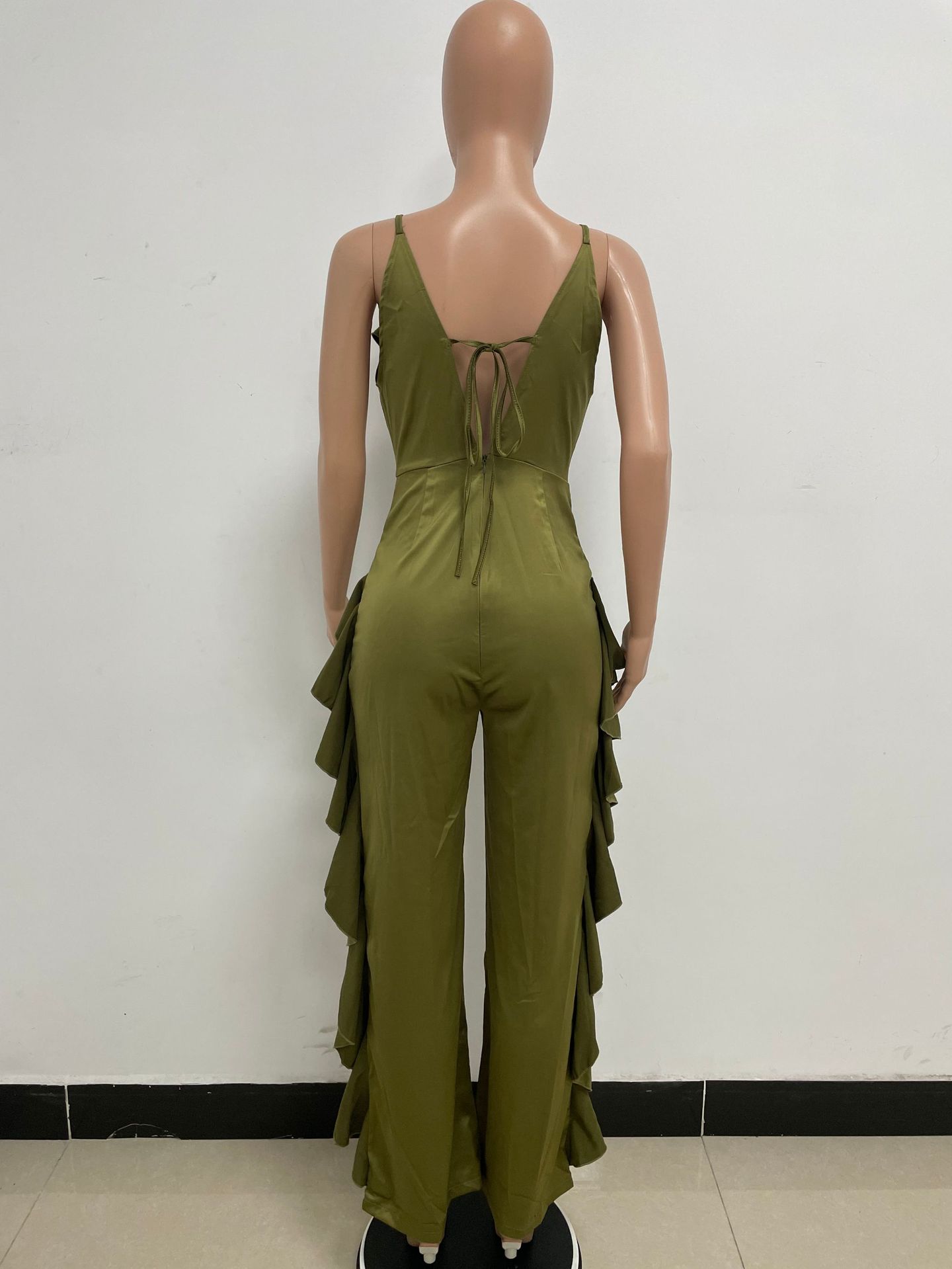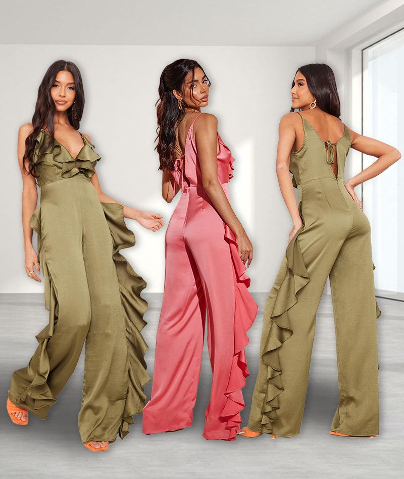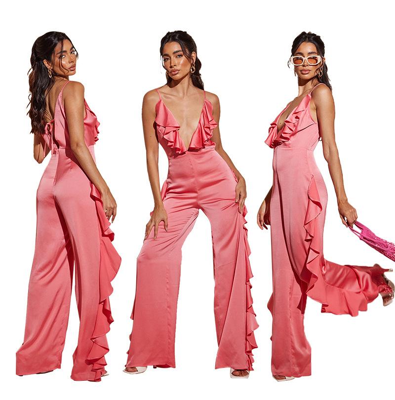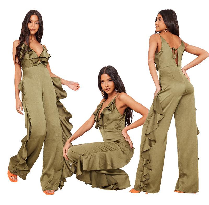 Ropa de Mujer de Comercio Exterior INS Mono de Satén con Espalda Descubierta y Escote en V Profundo para Mujer Verano Color Sólido Tirantes con Volantes Mono Europeo y Americano Mujer