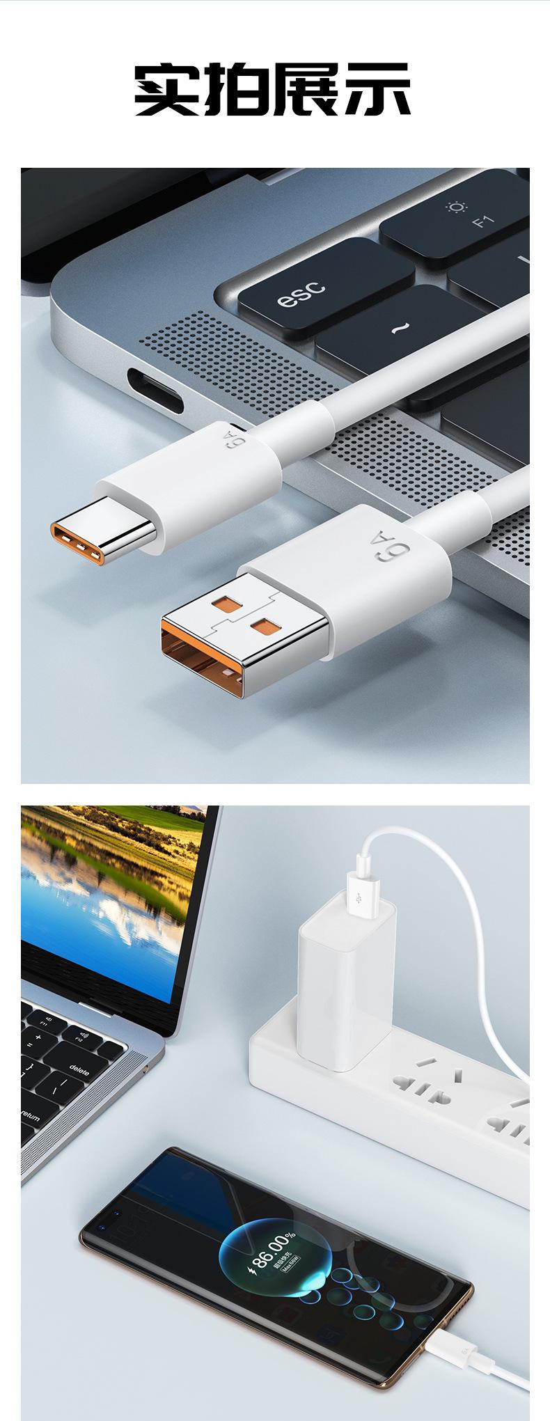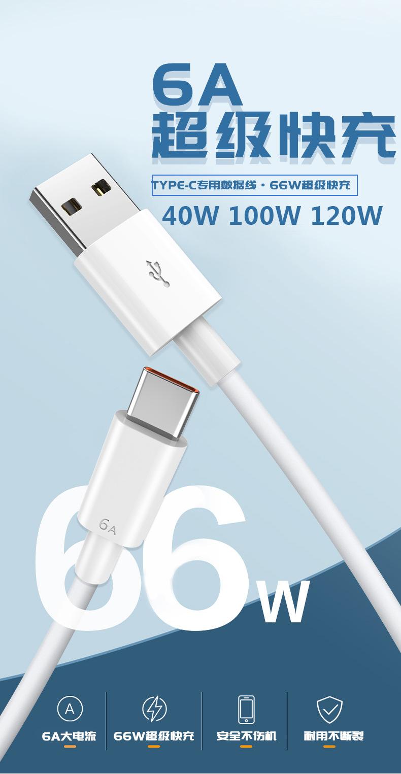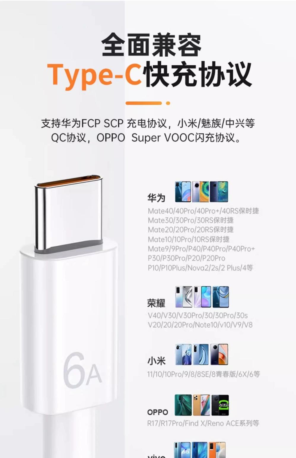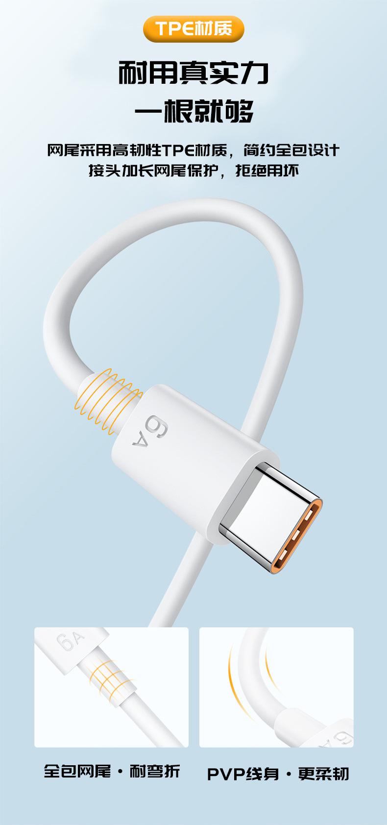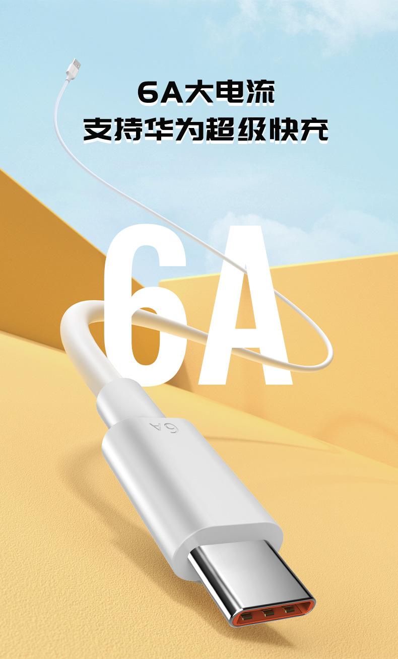 Cable 6A Huawei tipo-c especificaciones: 50 0.1 latón X2 núcleos para carga, 100 0.1 latón en total para carga; 10 0.1 latón X2 núcleos para datos, 20 0.1 hilos de cobre en total, cubierta exterior de TPE, diámetro del cable OD3.8mm, moldeo por inyección en ambos extremos, doble película interior, cabezal de moldeo por inyección de goma TPE, terminal A macho alta corriente + tipo-c cabezal integrado elástico doble resistencia, núcleo de goma naranja.