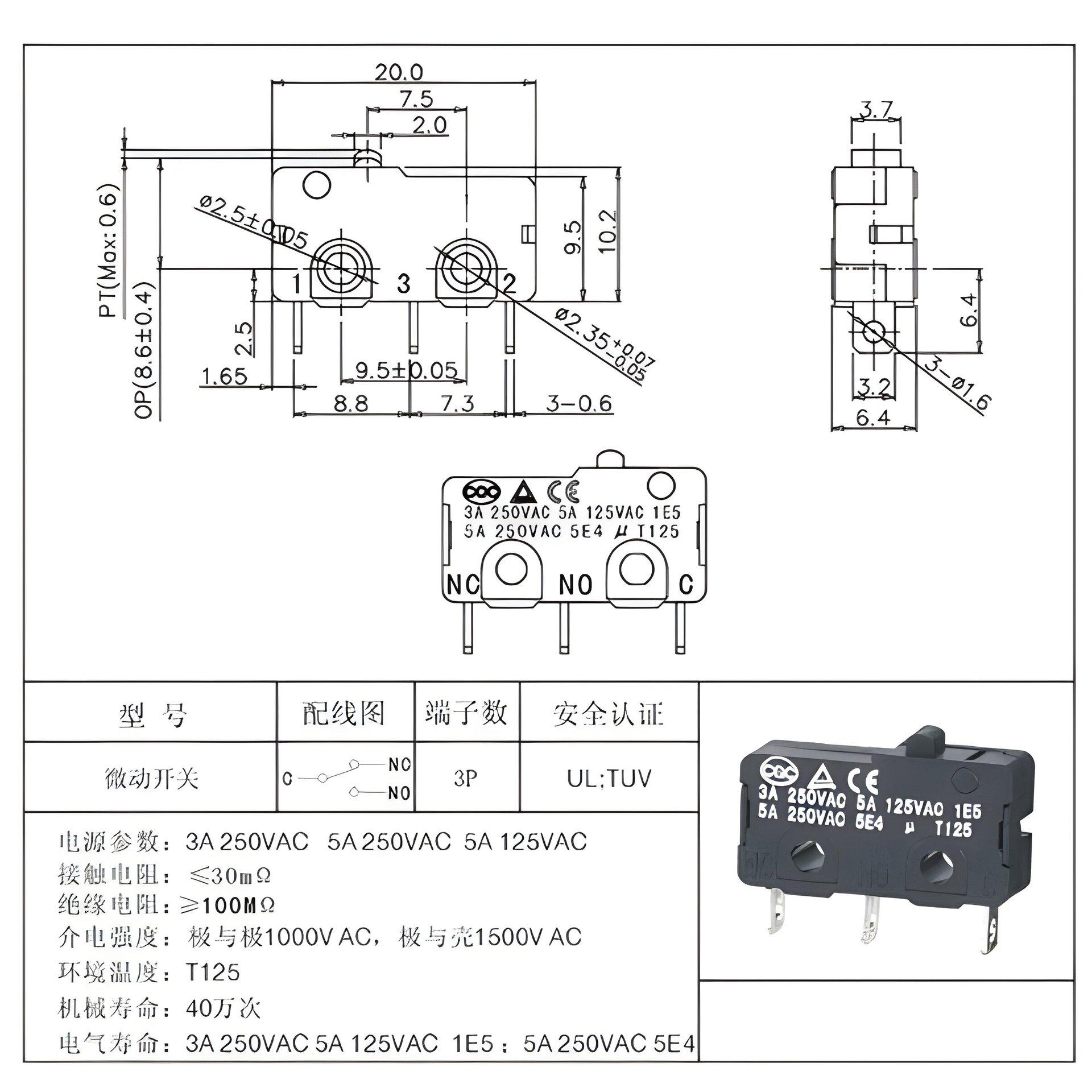 Microinterruptor KW12-A Trípode sin manija 5A/250VAC Interruptor de límite de recorrido pequeño 19.8*10.2